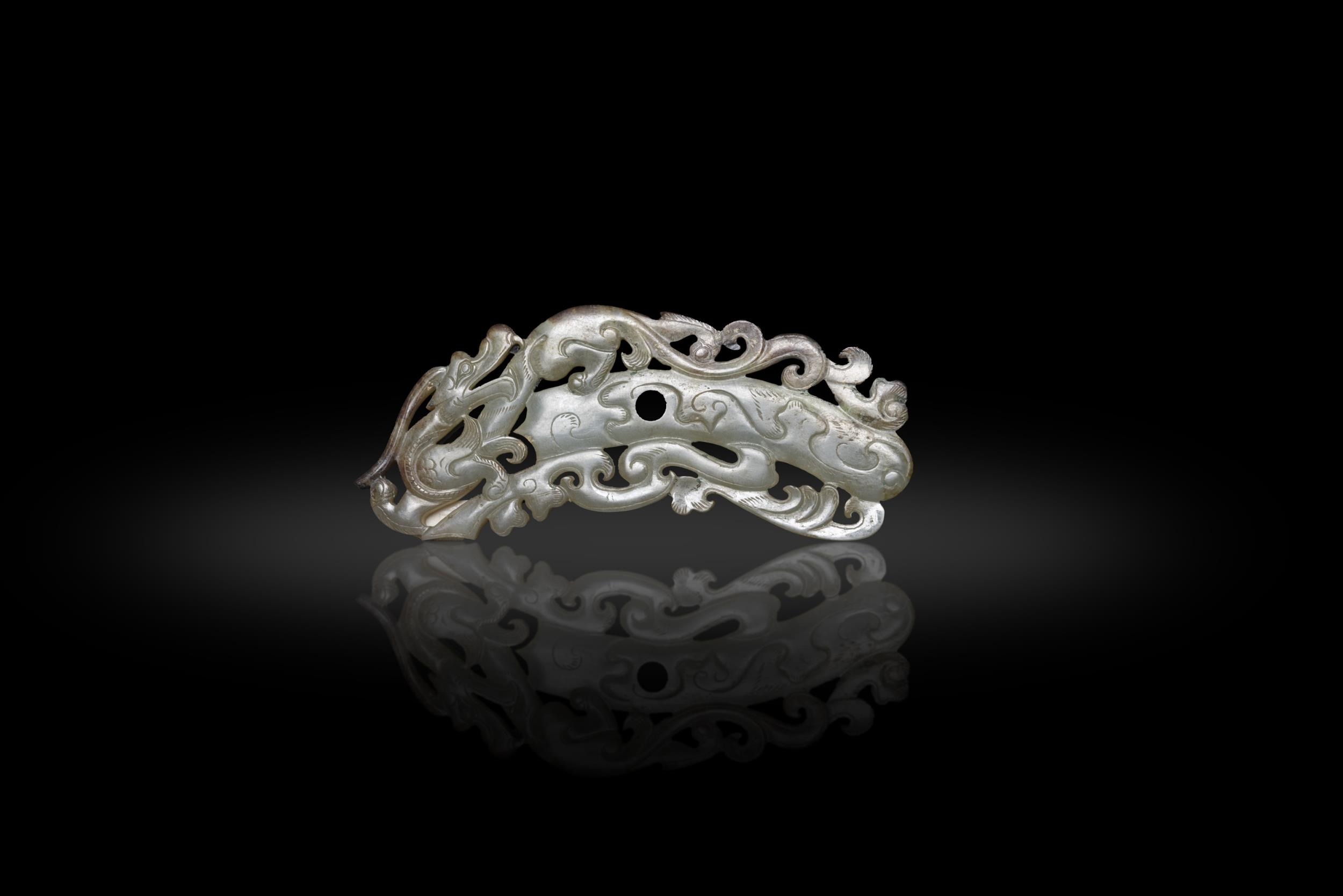 A CALCIFIED, CELADON JADE DRAGON PENDANT ????? ???????? China, Warring States Period or later. H. 9cm