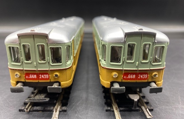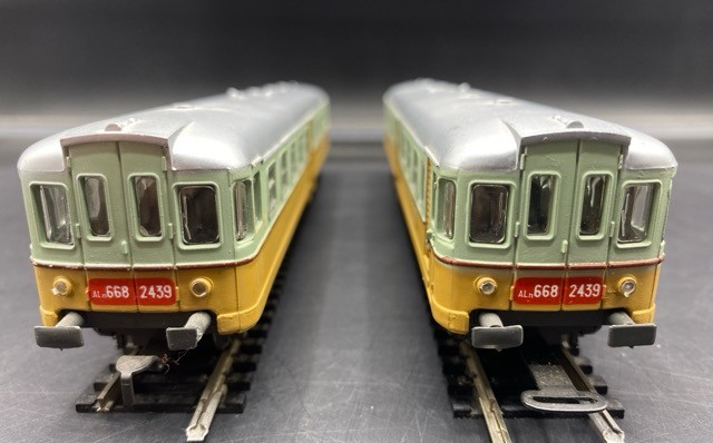 Rivarossi FS AL-668 2439 Powered and Non-Powered in Mustard/Pastal Green livery - few scuffs to silver roof (Good)
