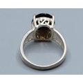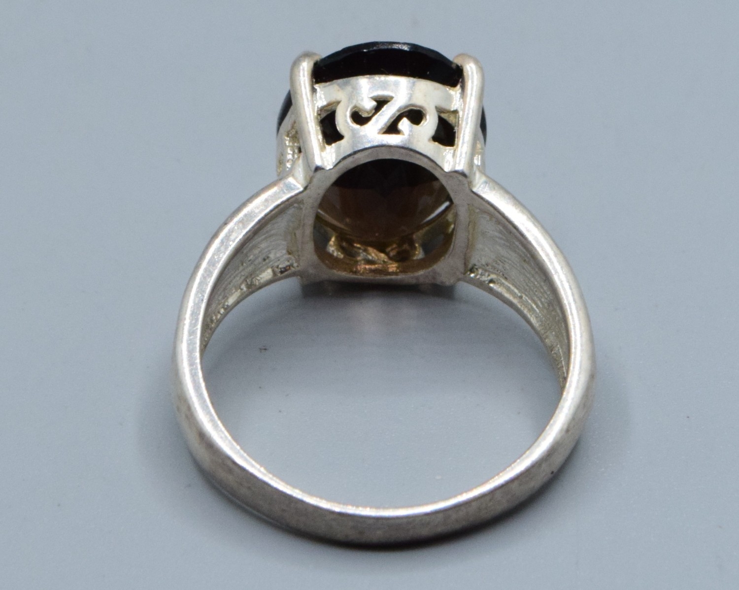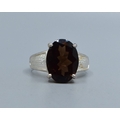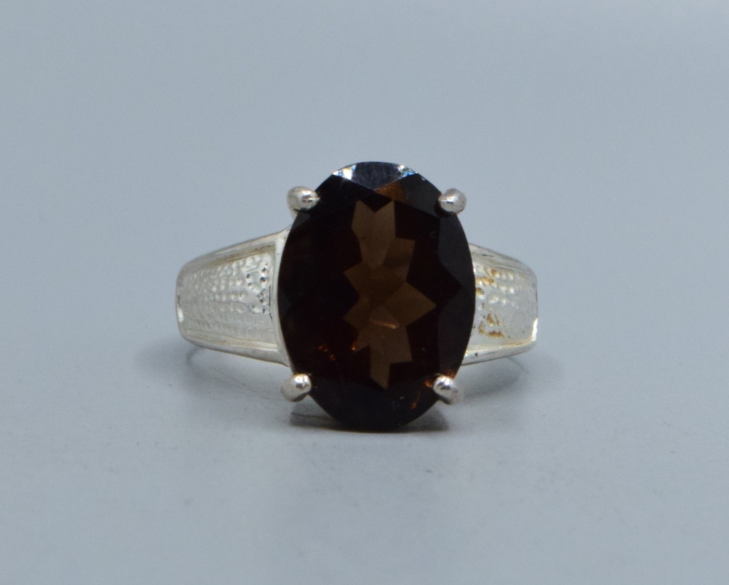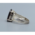 Good size 925 silver oval quarts signet ring with bark decoration to the shoulders the central stone being 16x12mm and held in a claw setting size T