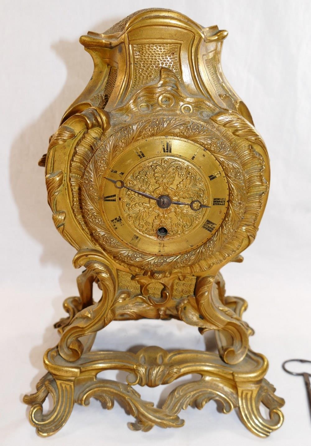 A 19th century gilt brass Rococo style mantle timepiece, the...