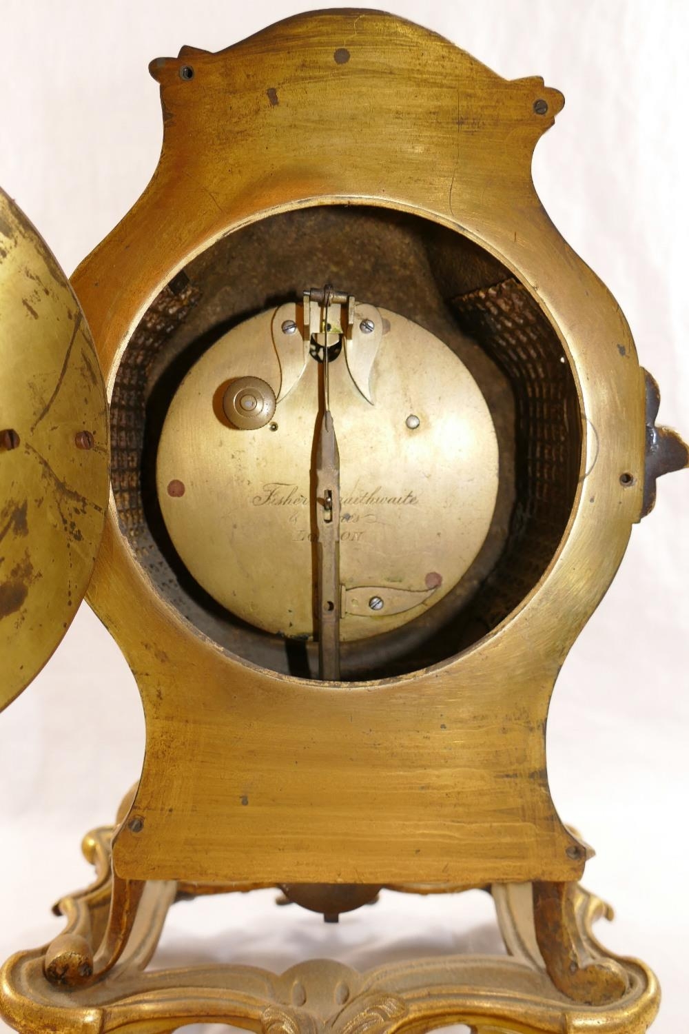 A 19th century gilt brass Rococo style mantle timepiece, the movement inscribed 'Fisher Braithwaite & Jones, London', with key and pendulum, 30cm high