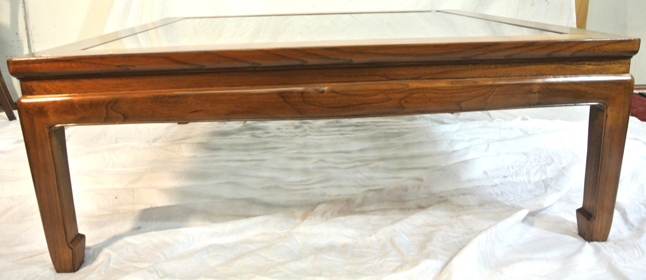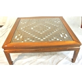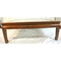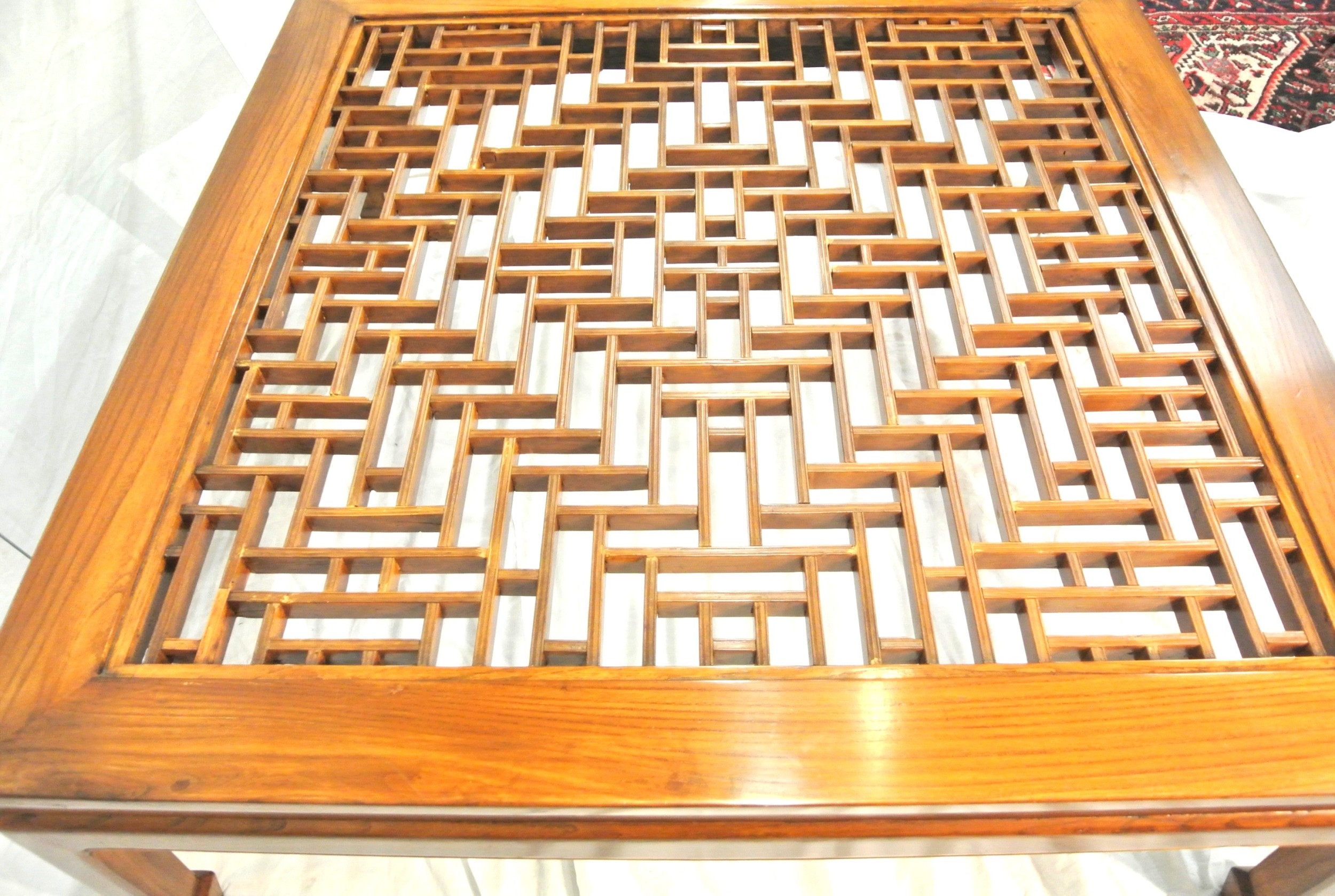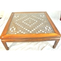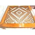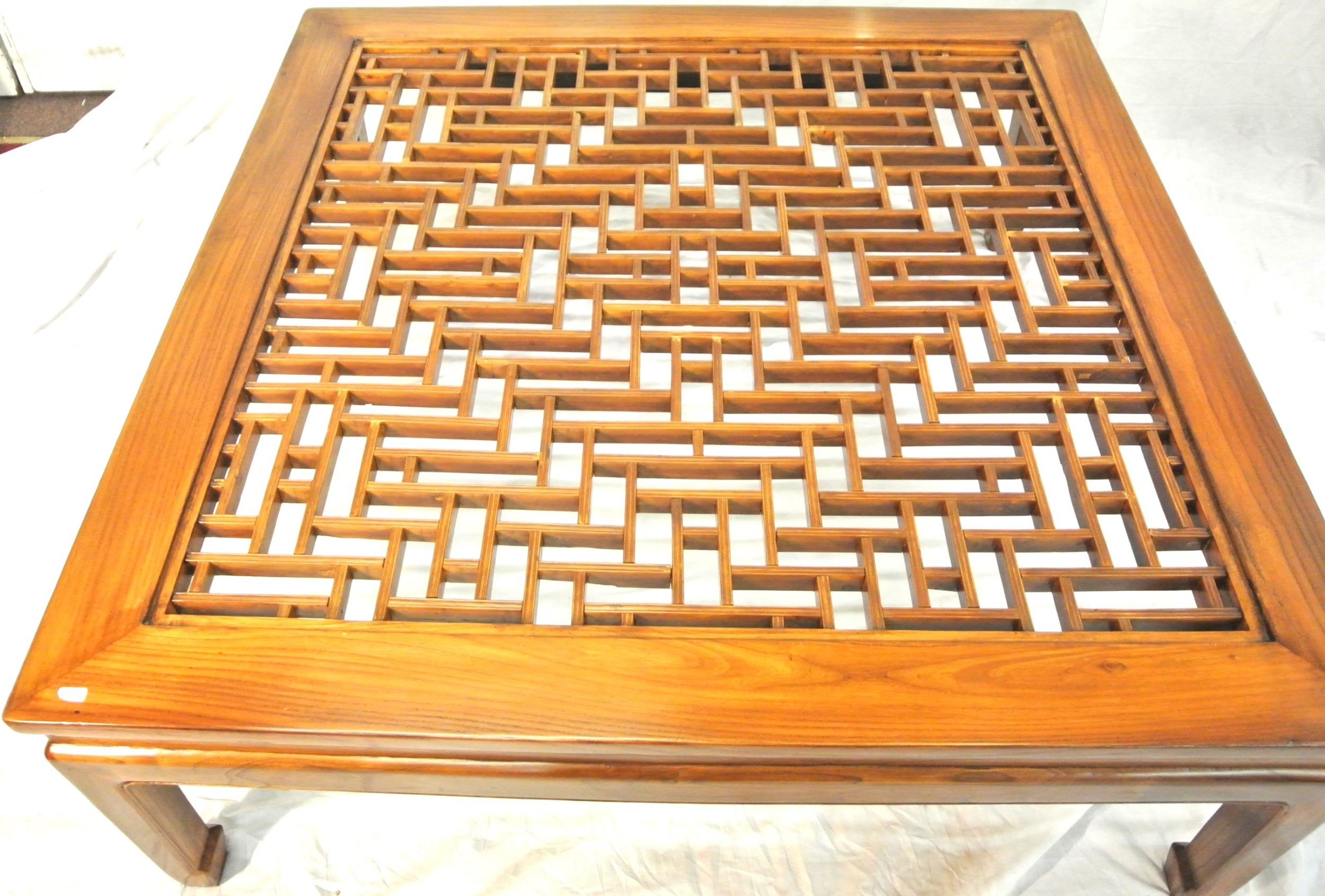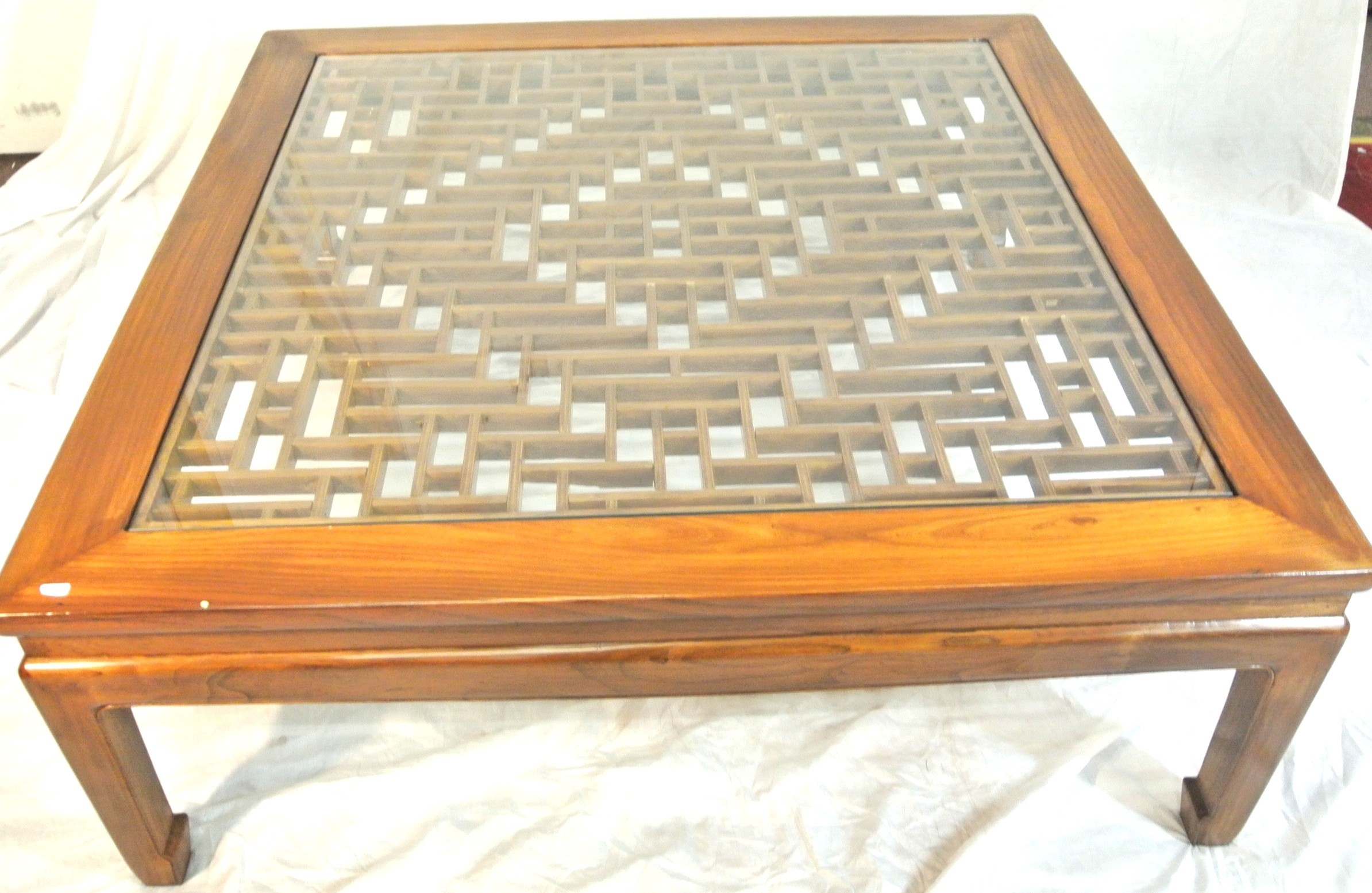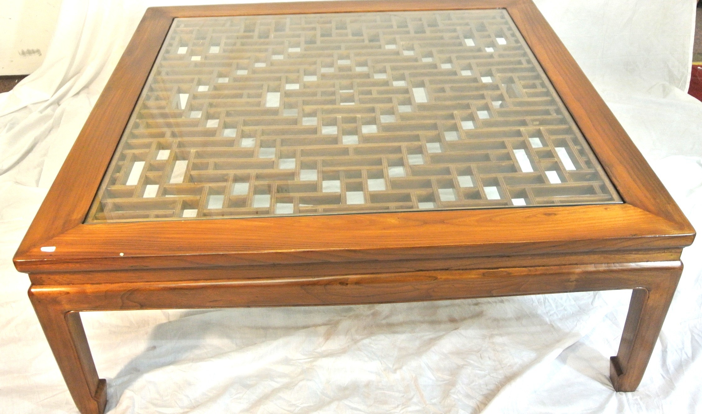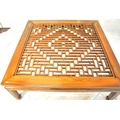 Large square mahogany coffee or centre table with Chippendale style fretwork and glass top