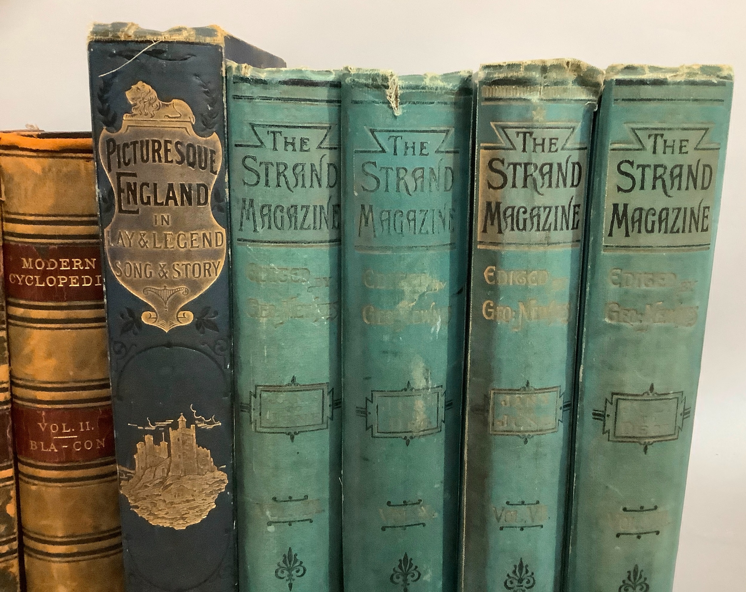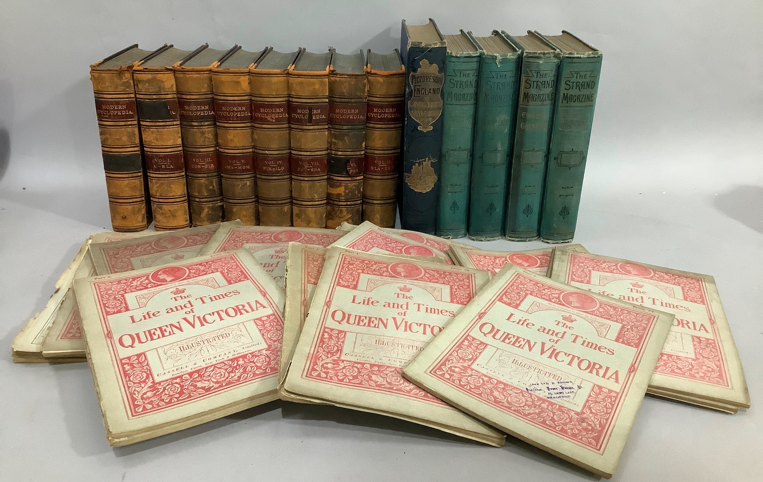 Set of eight modern Encyclopaedia, Picturesque England, the Strand Magazine in four volumes with pictorial binding and a quantity of The Life and Times of Queen Victoria in soft back