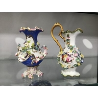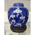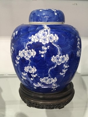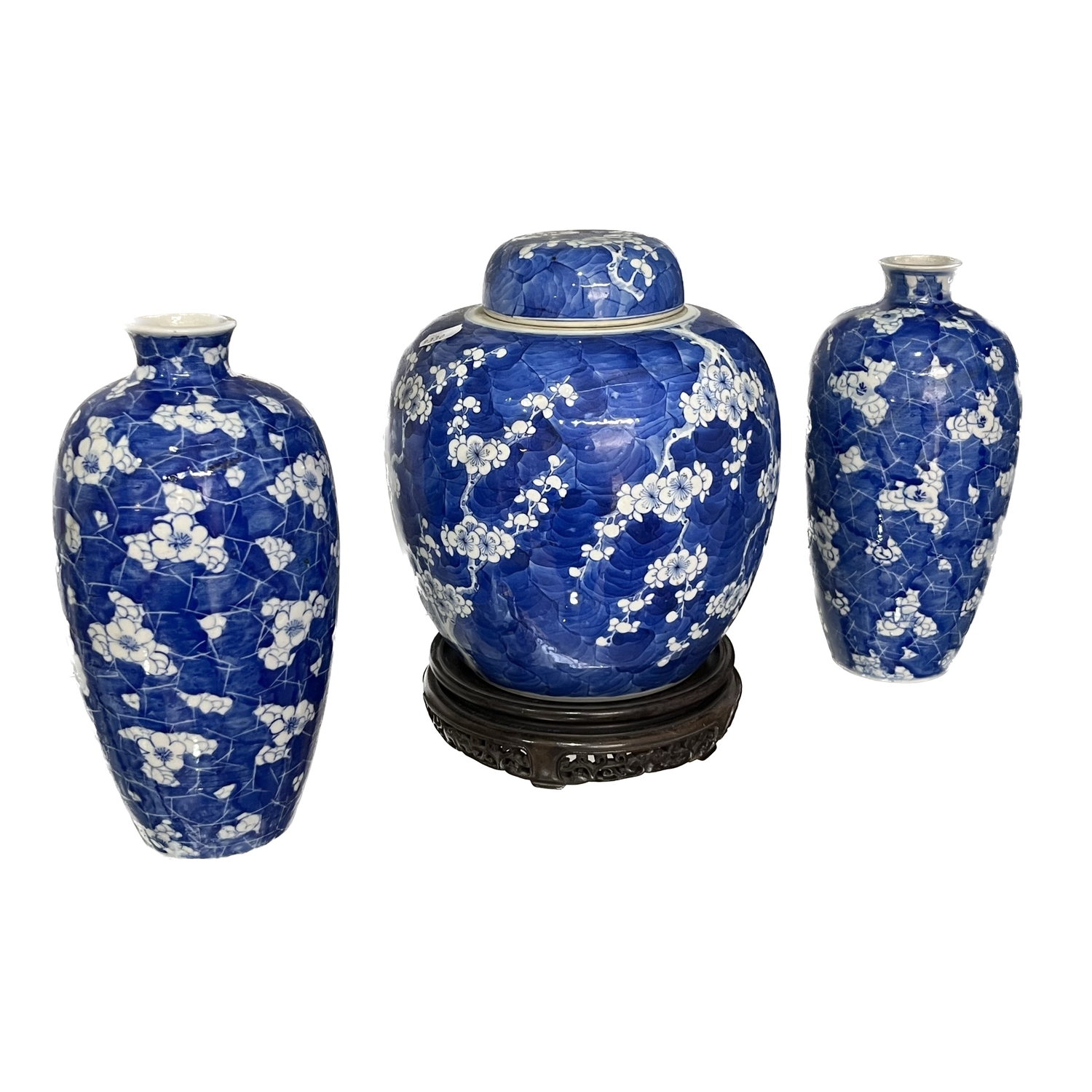A large Chinese blue and white ginger jar and cover, decorated with flowering prunus branches, concentric blue circle mark, 22cm high, on carved hardwood stand, together with a pair of blue and white vases, elongated ovoid form, 25cm high (3)