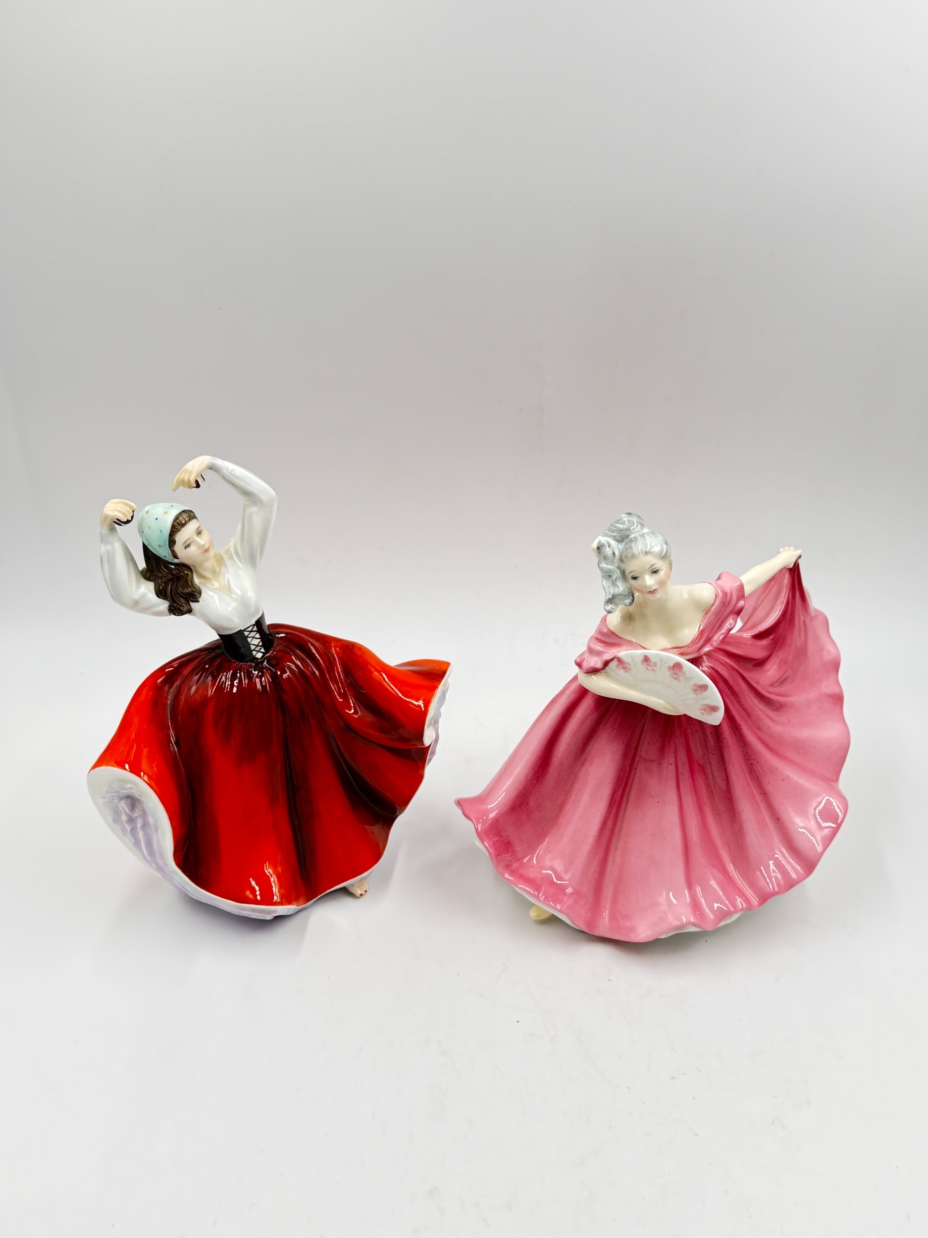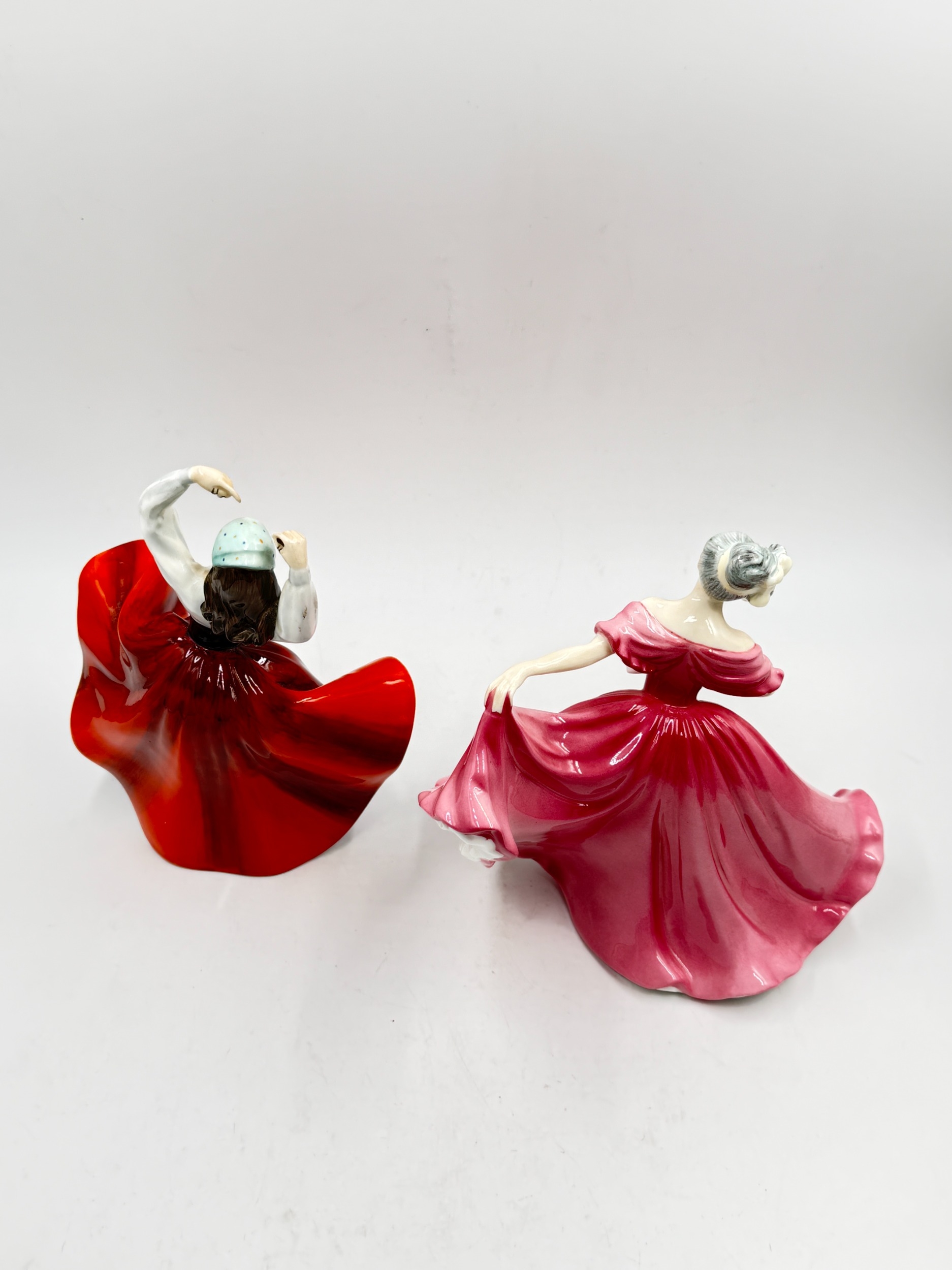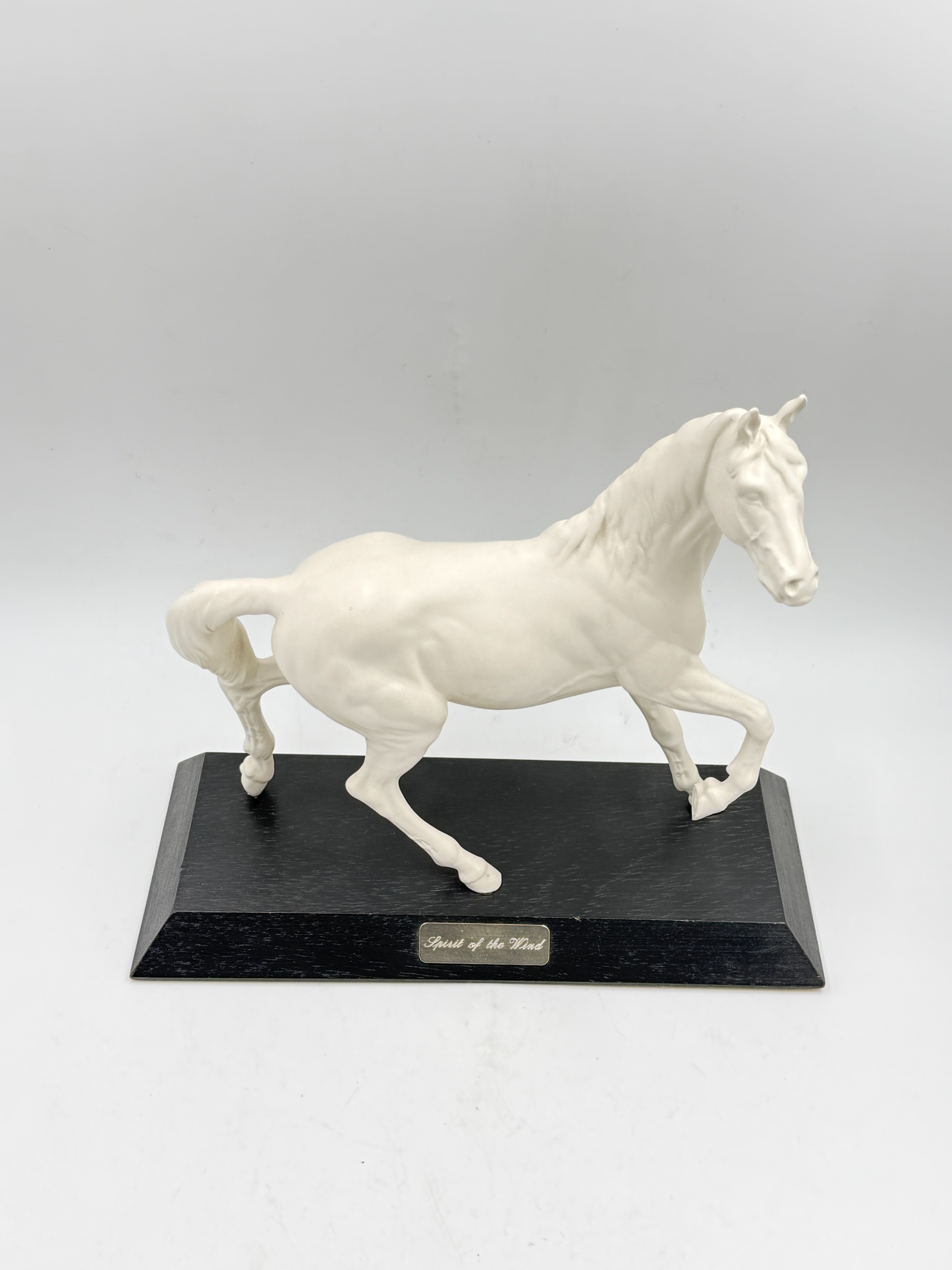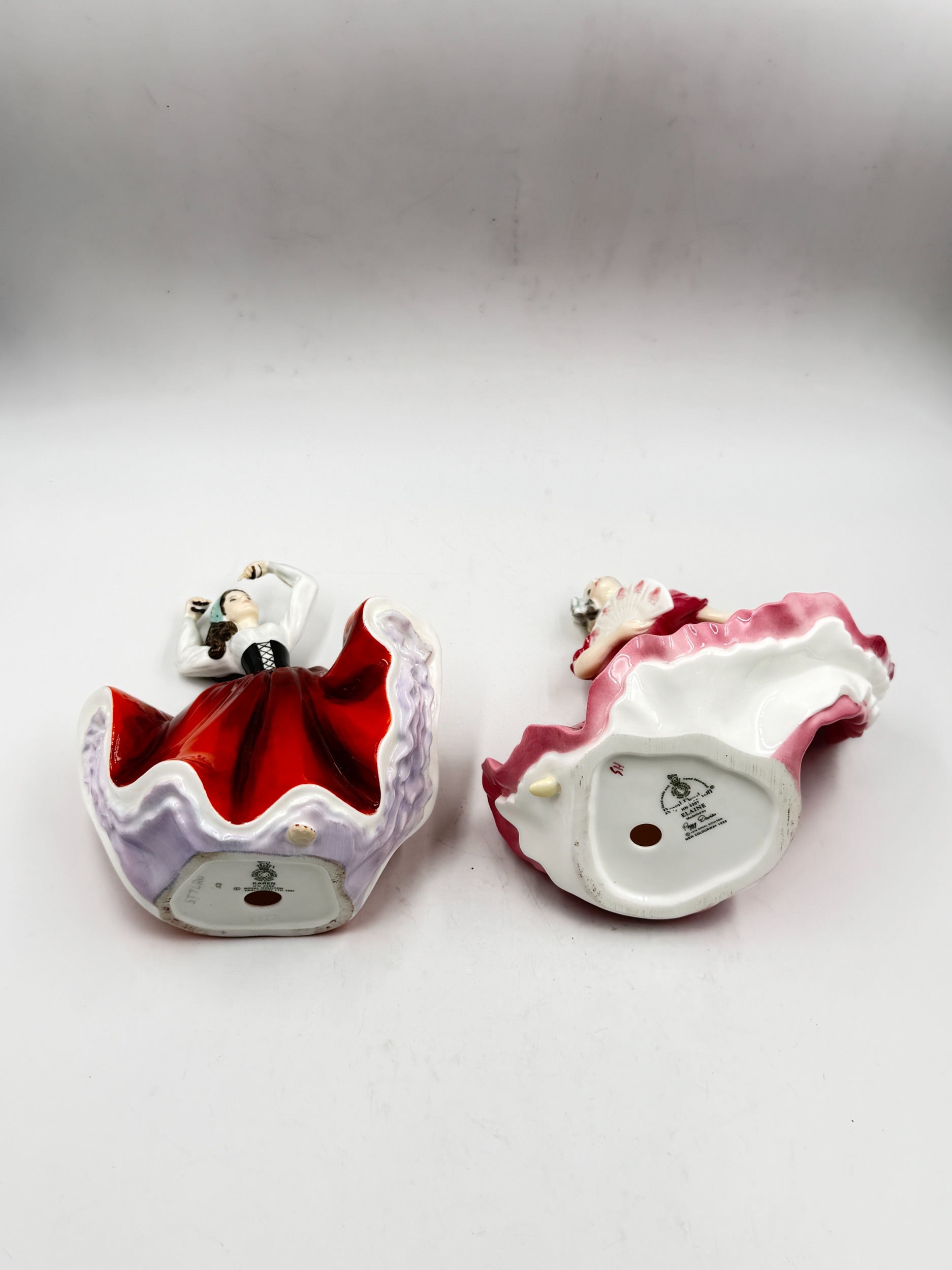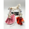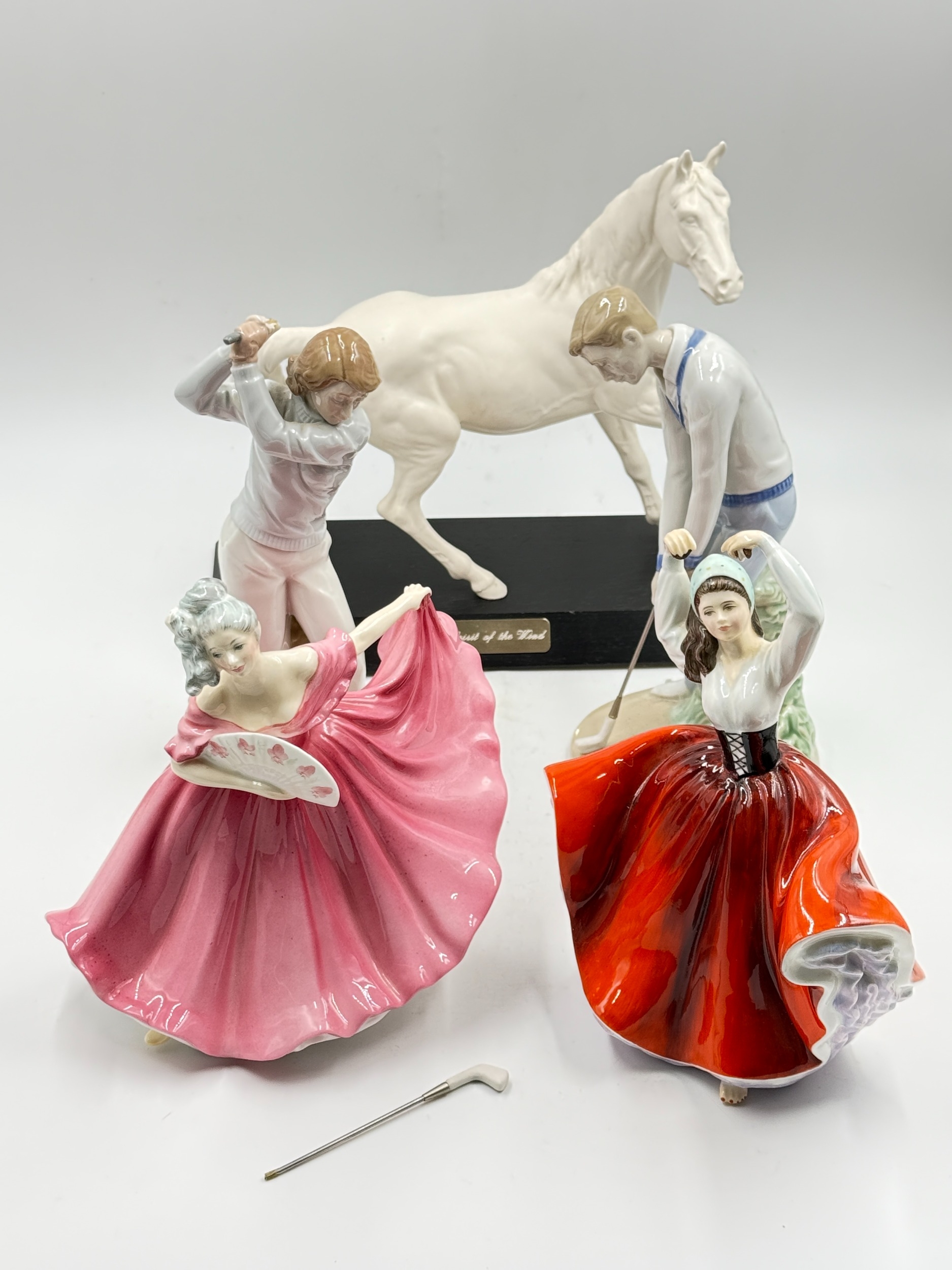 Five ceramic figurines, two Spanish Nadal golfers, one Beswick 'Spirit of the Wind' horse on plinth and two Royal Doulton, Karen HN2388 and Elaine HN3307