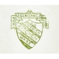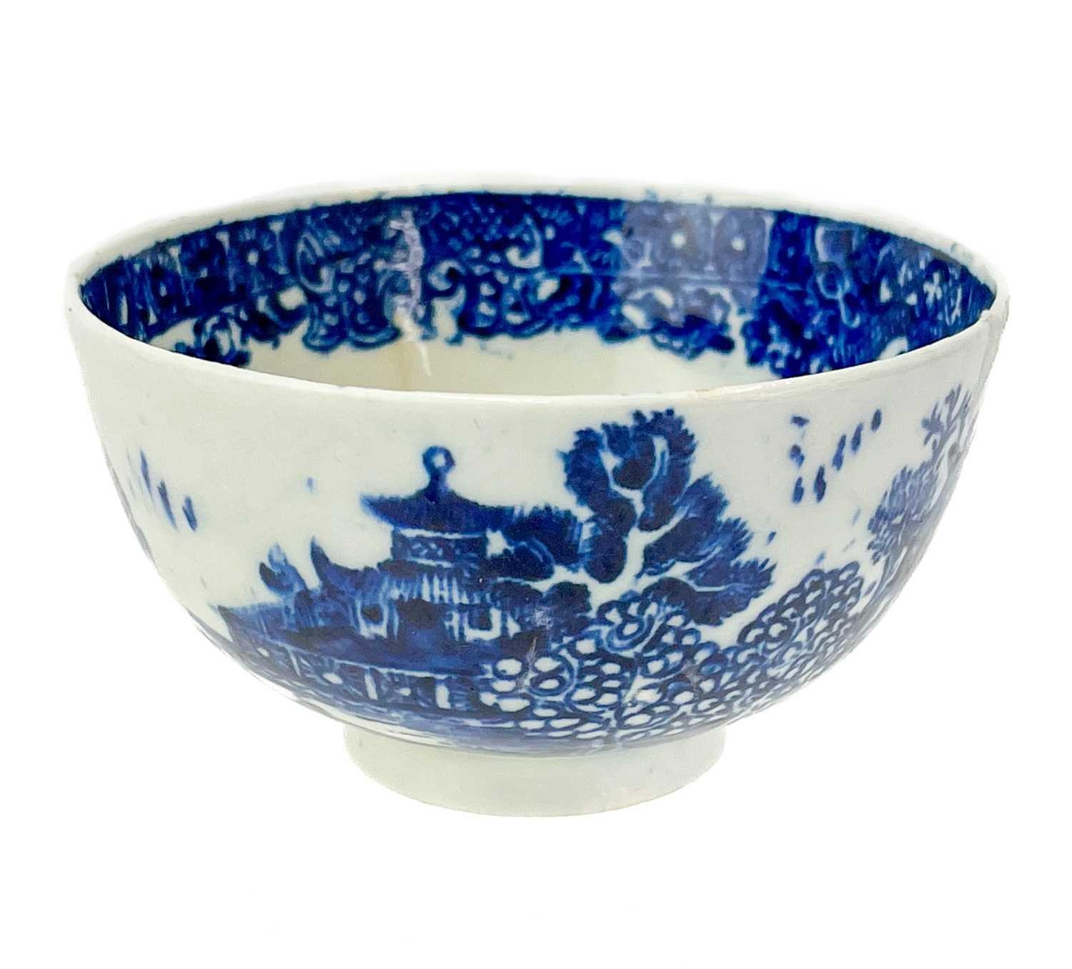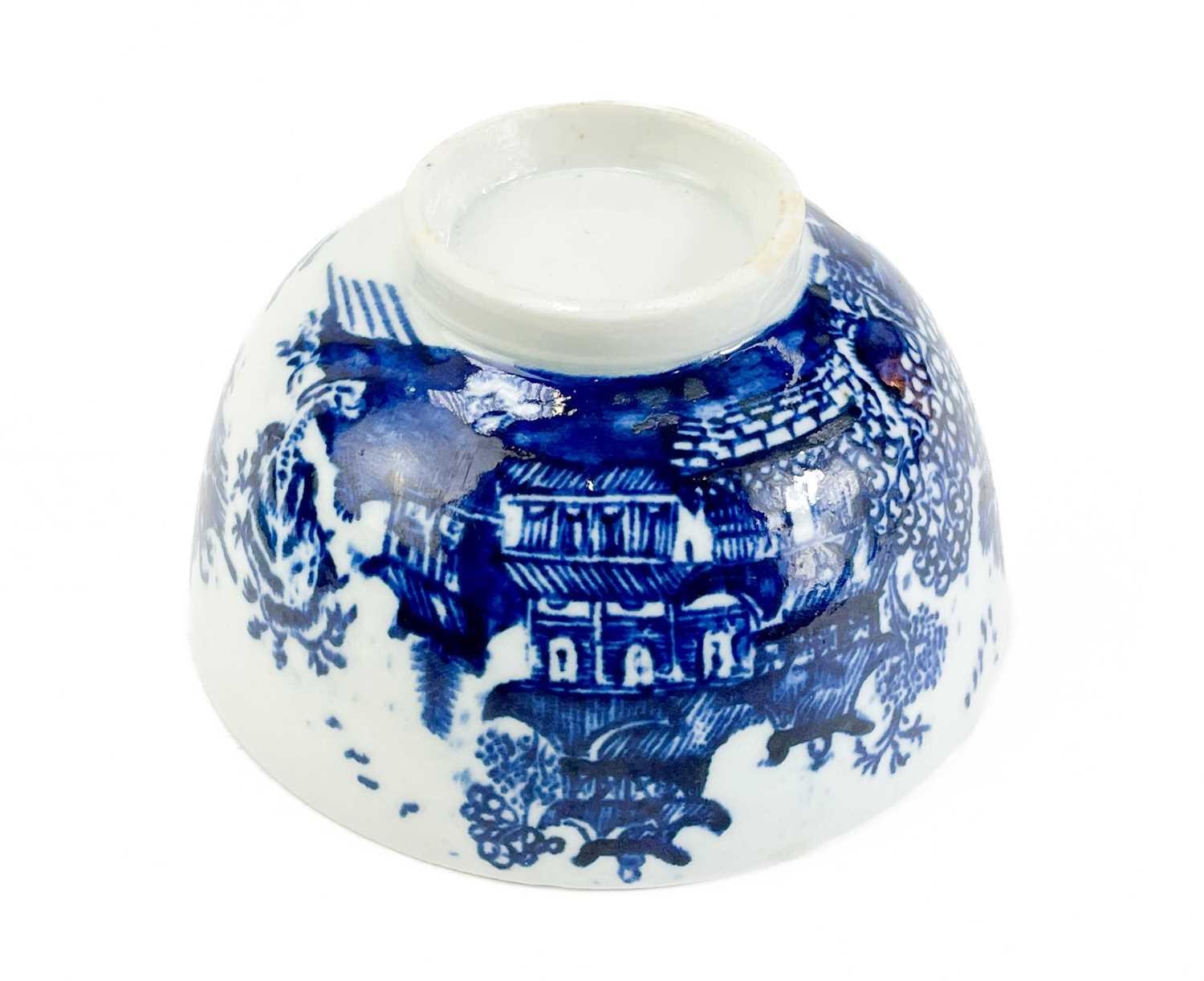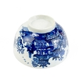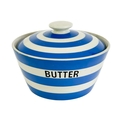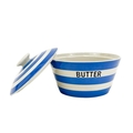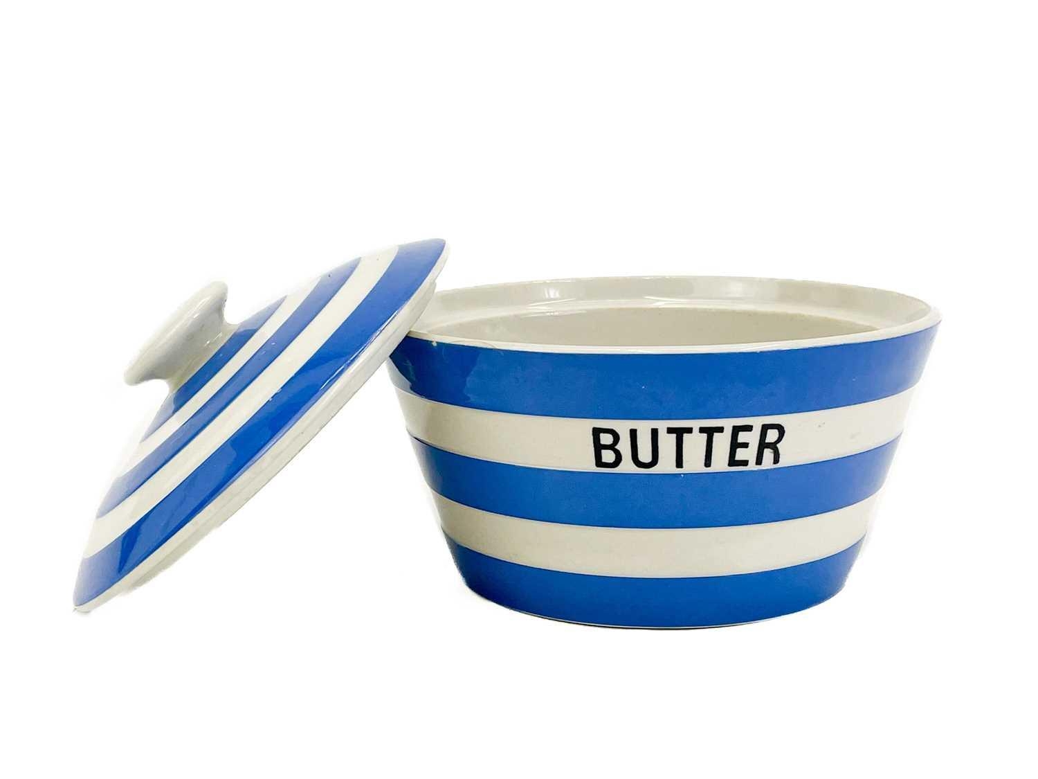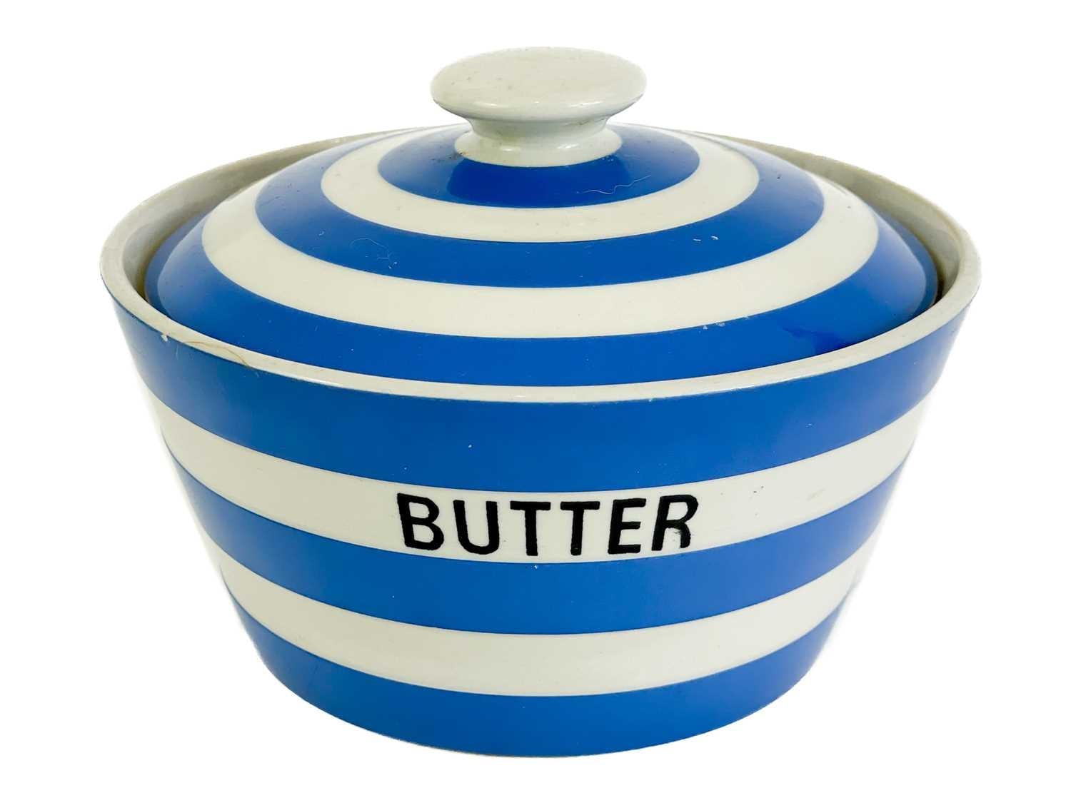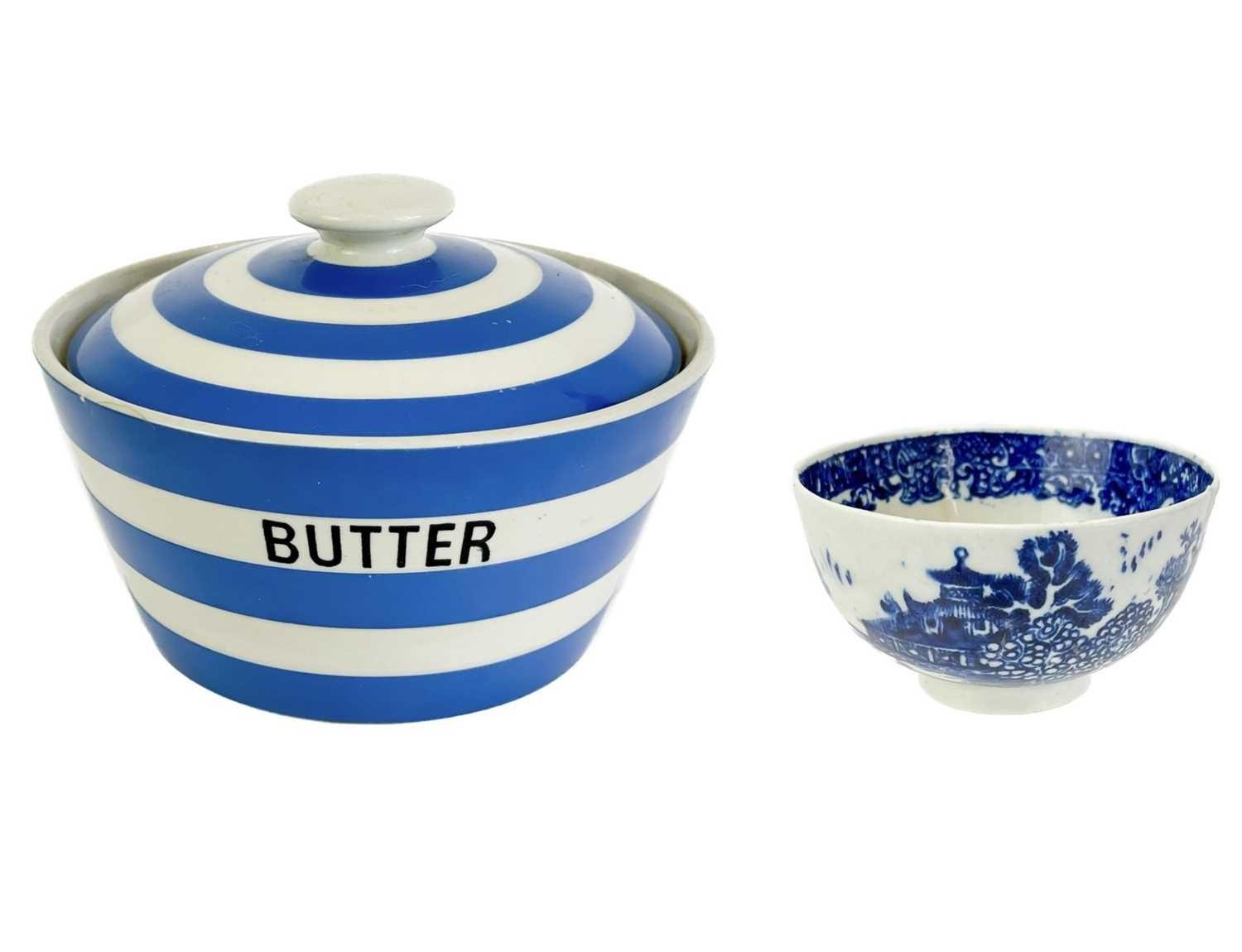 A T.G. Green Cornishware circular lidded butter dish. Green printed mark to base, 14.5cm diameter, together with a Caughley porcelain tea bowl (2).