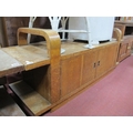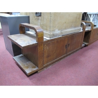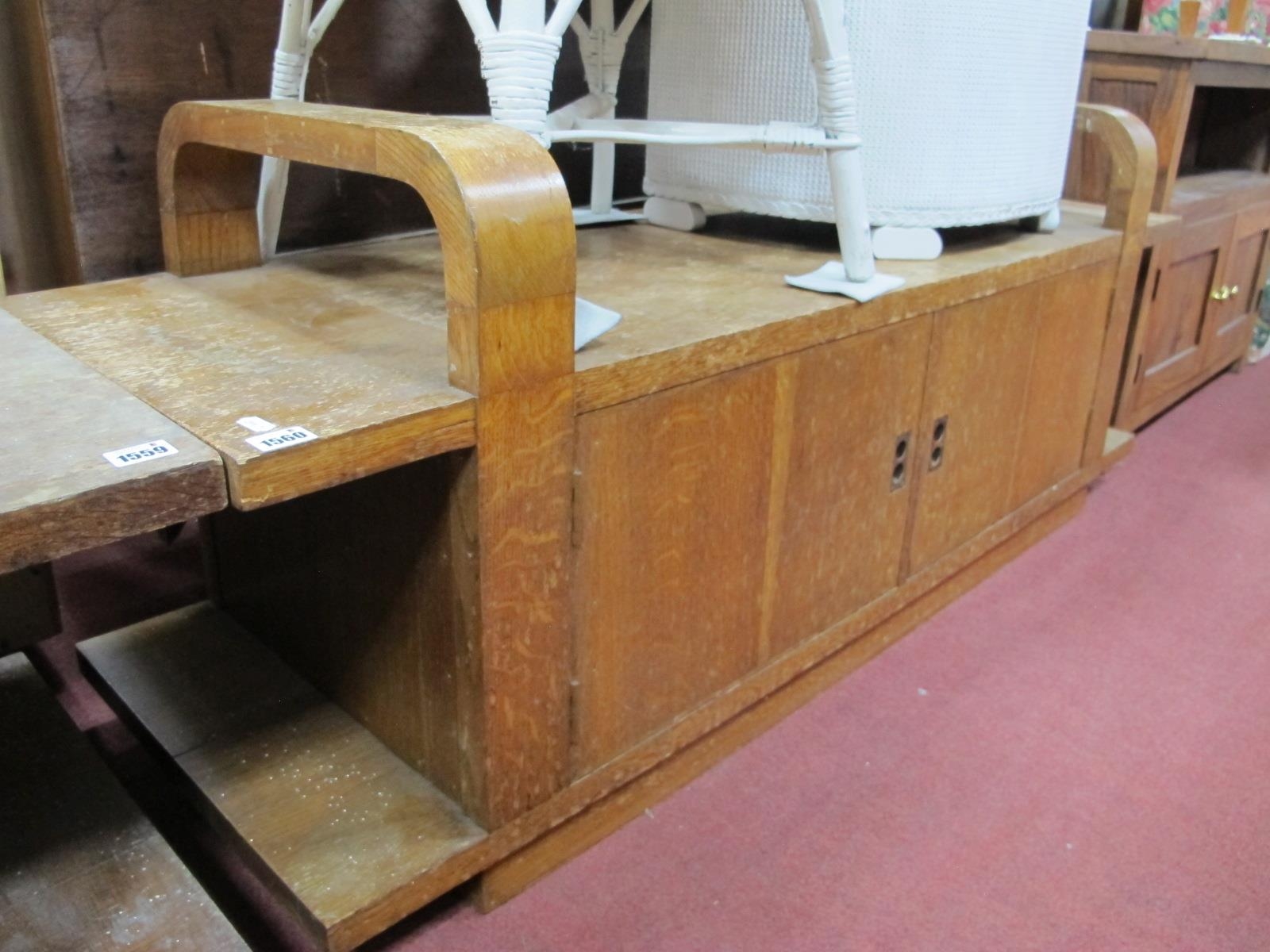 A XX Century Oak Window Seat, with arched arm supports, solid seats, cupboard doors, 136cm wide x 56cm high.