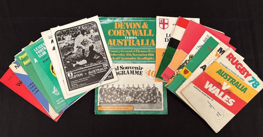 1981-2 Australians in the British Isles Rugby Programmes (23): v Midlands, Oxford U, N Counties, Bridgend, Wales ‘B’ (2), Pontypool (2), London Div, Devon and Cornwall, Ulster, Munster, Leicester, Swansea, Pontypridd, Lancashire, Glasgow, N Midlands of Scotland, S/SW of England, Combined Services, England and West Wales; plus Australia v Wales, 2nd test, 1978, JPR Flanker, G Price broken jaw. G/VG