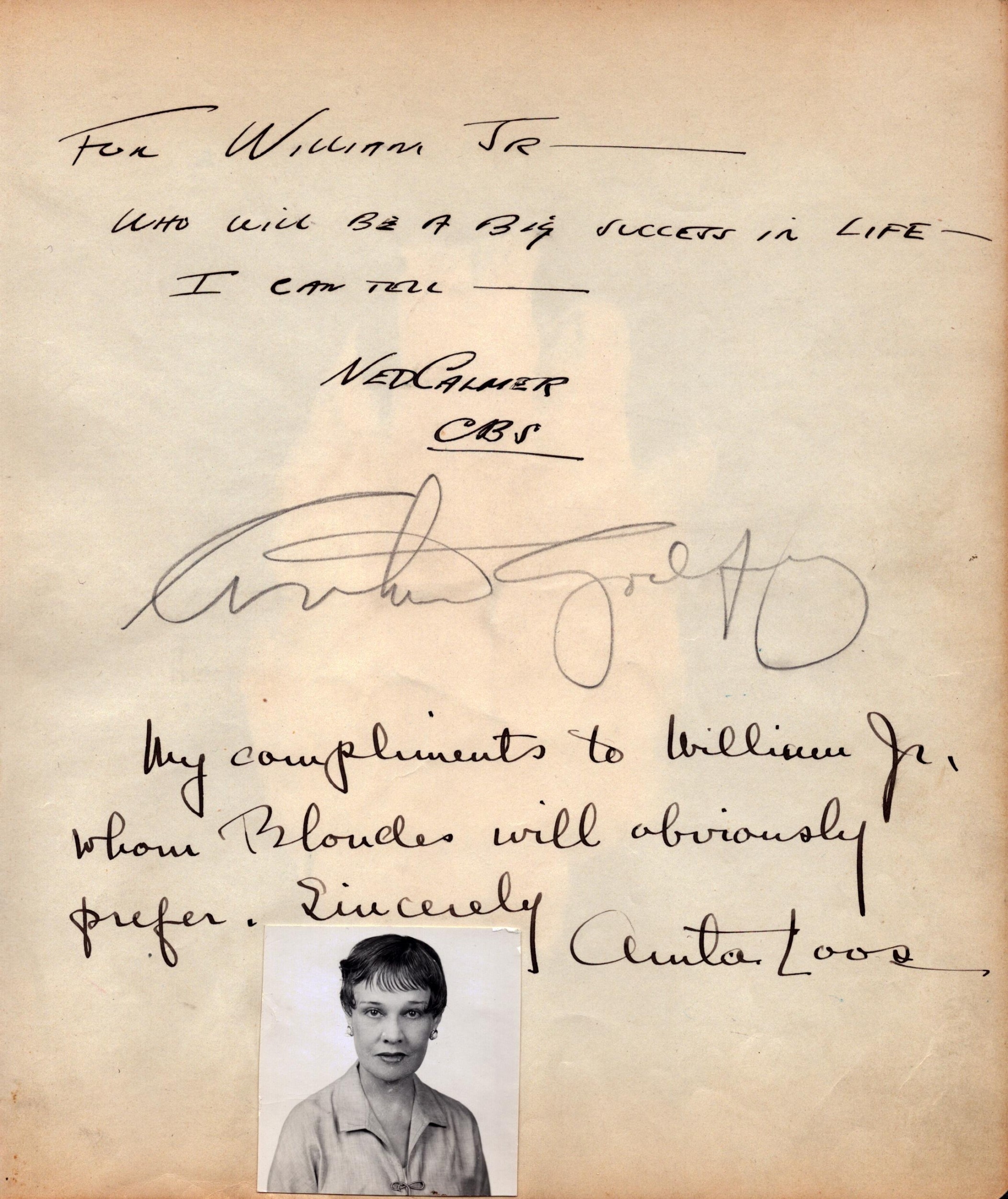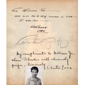 Arthur Godfrey and Anita Mult signed piece with a handwritten and signed note from each to a William Jr. Arthur a radio and TV entertainer and broadcaster and Anita an actress playwriter, screenwriter and novelist.