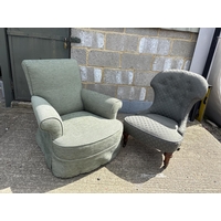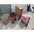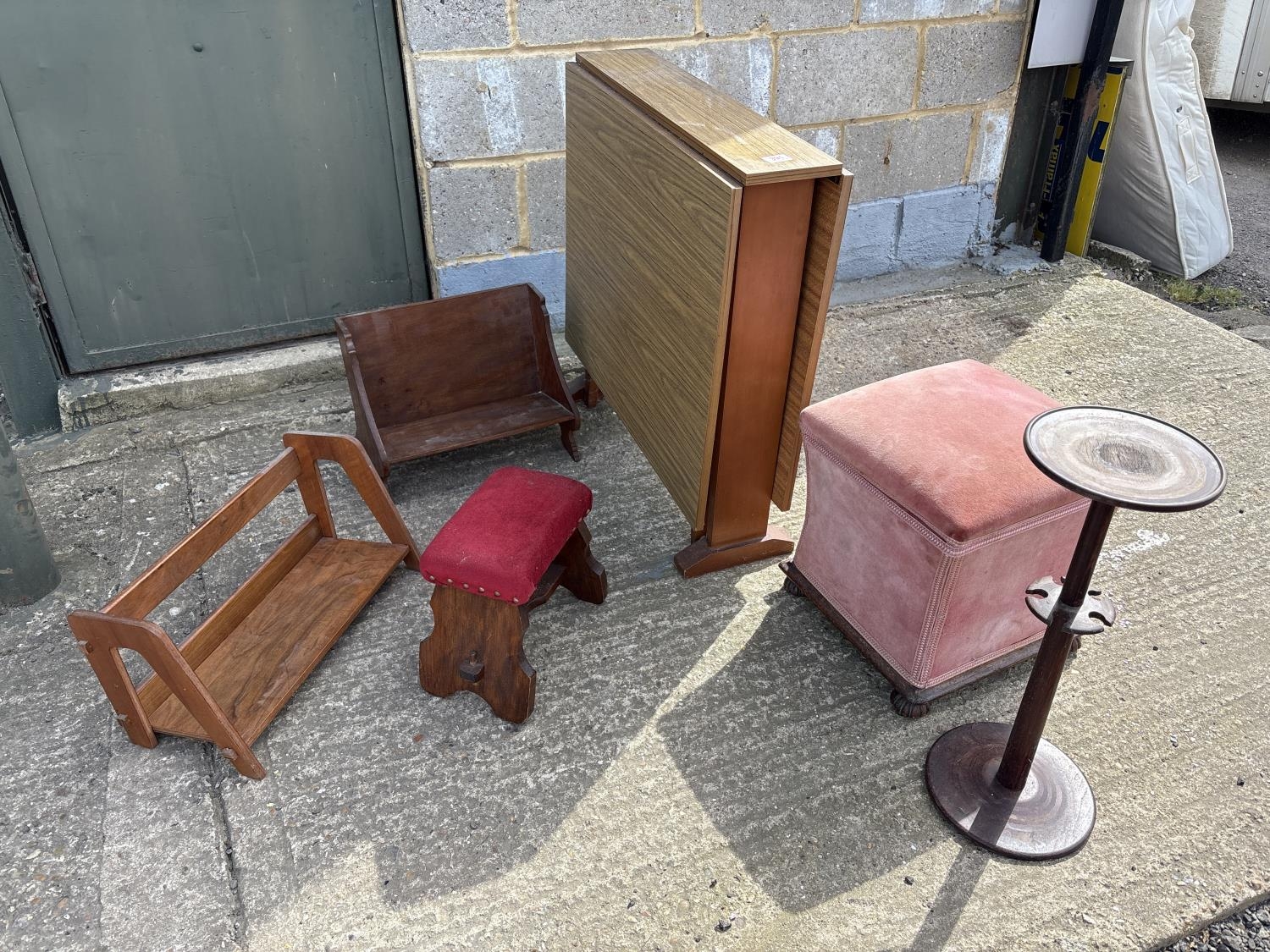 A retro, drop leaf table, pink upholstered stool, two book racks and smokers stand