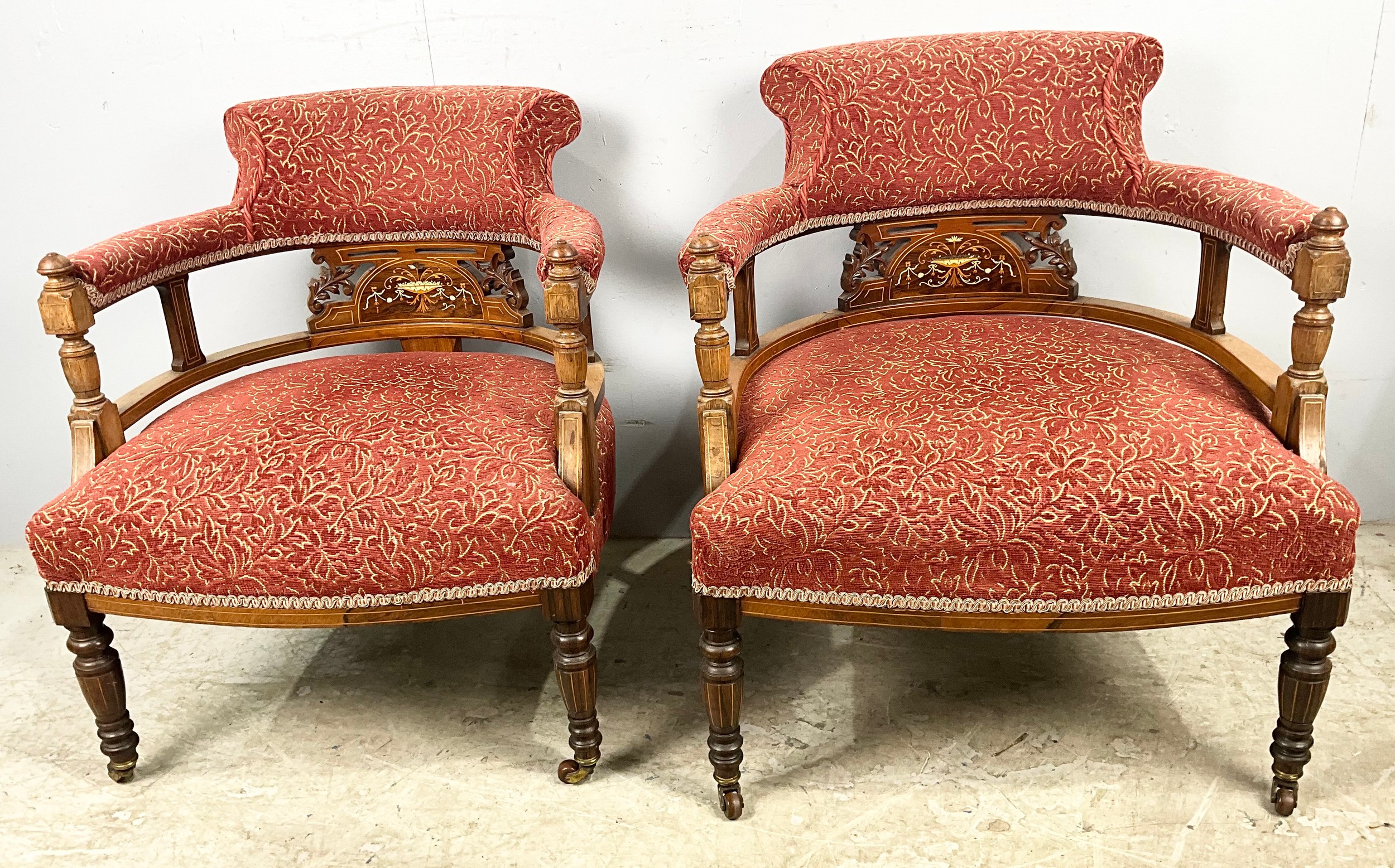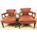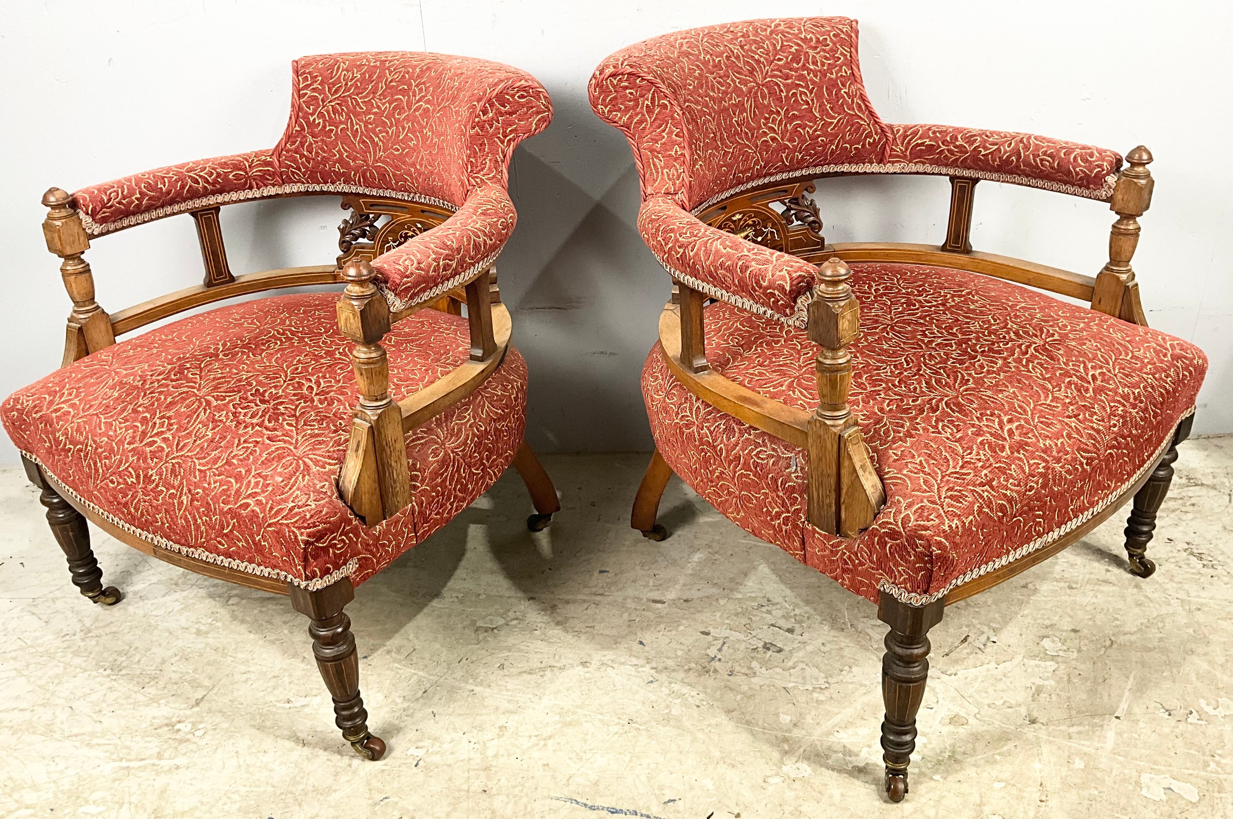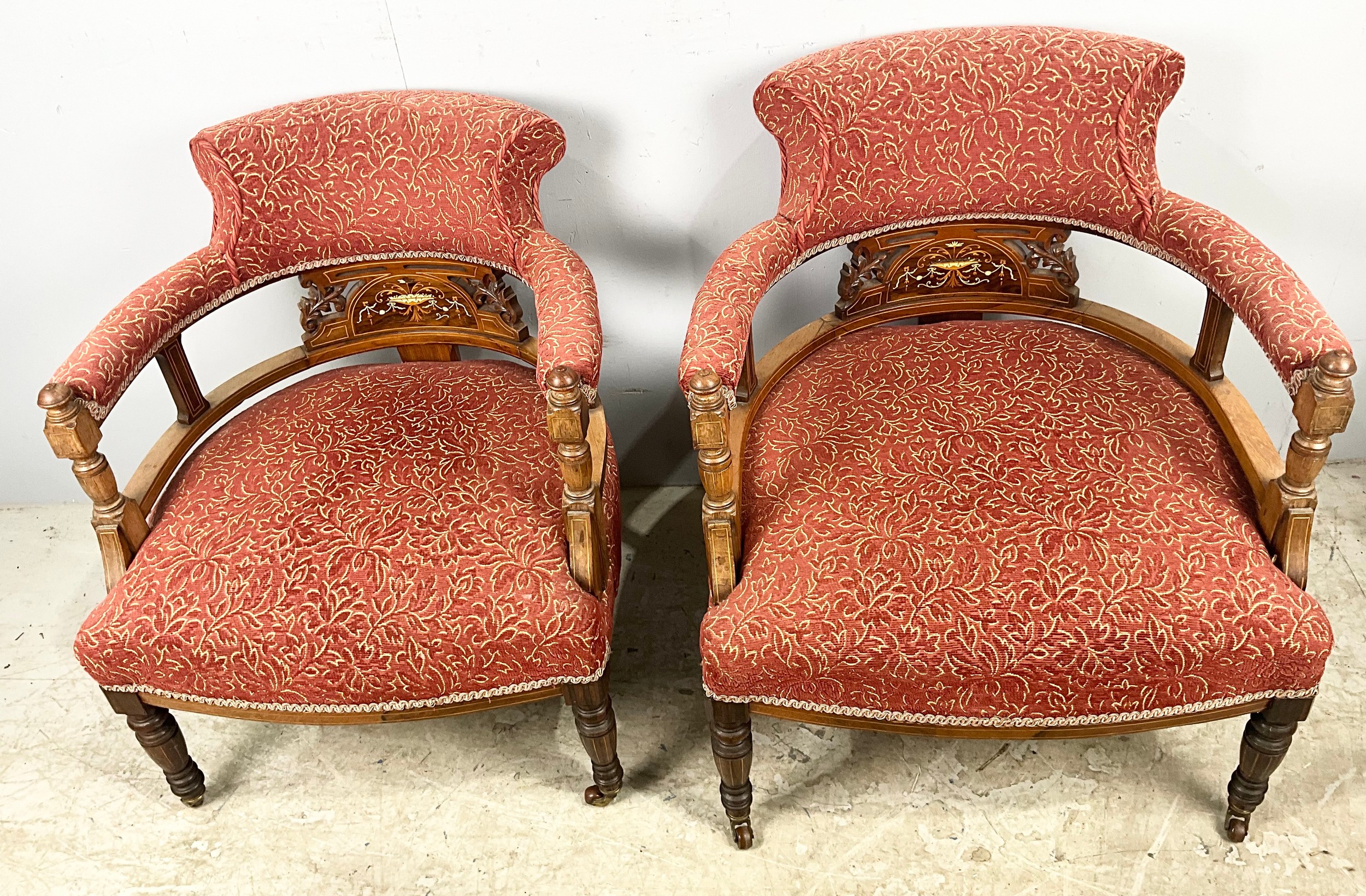 PAIR OR INLAID UPHOLSTERED HORSESHOE / BOW SHAPED CHAIRS