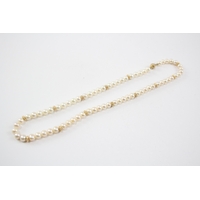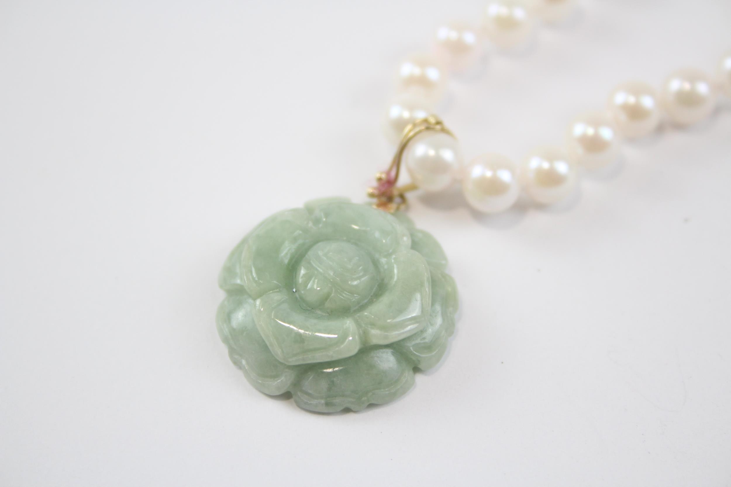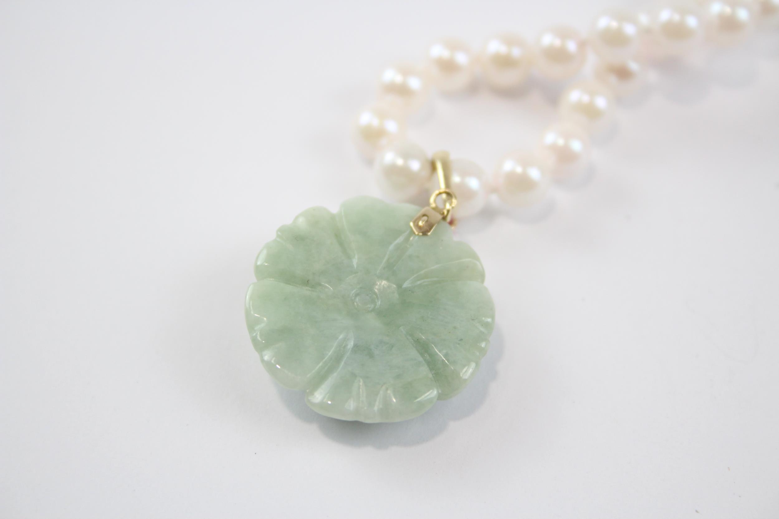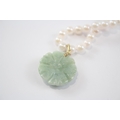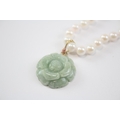 14ct Gold Cultured Pearl Single Strand Necklace With Carved Jade Floral Pendant (32.1g)