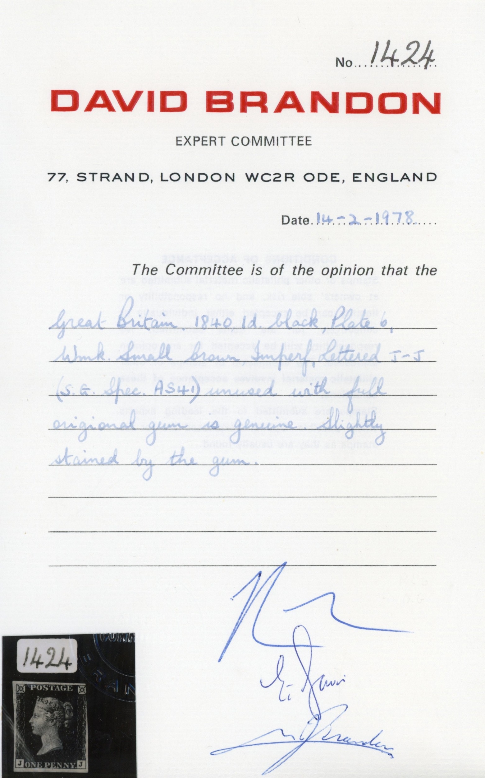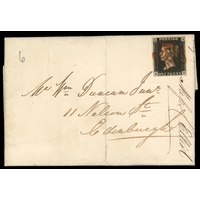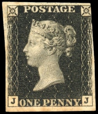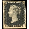 1840 1d black, Pl. 6 (JJ), with three good to large margins, just cut in at upper left, mint, unmounted o.g. with some slight toning and a small inclusion on the reverse, nevertheless a scarce and desirable stamp in this condition. Brandon cert (1978), SG 2, £8,000