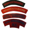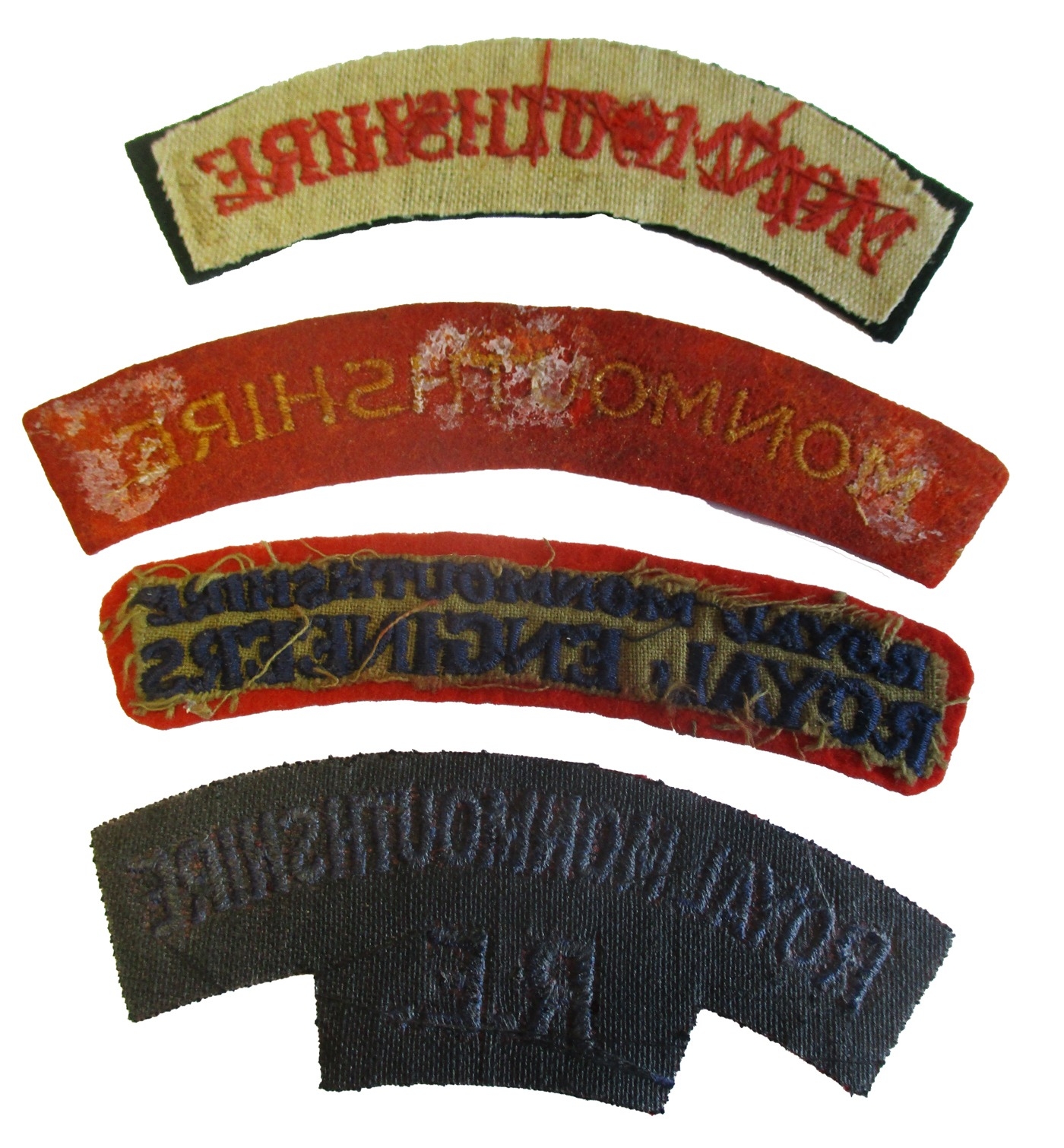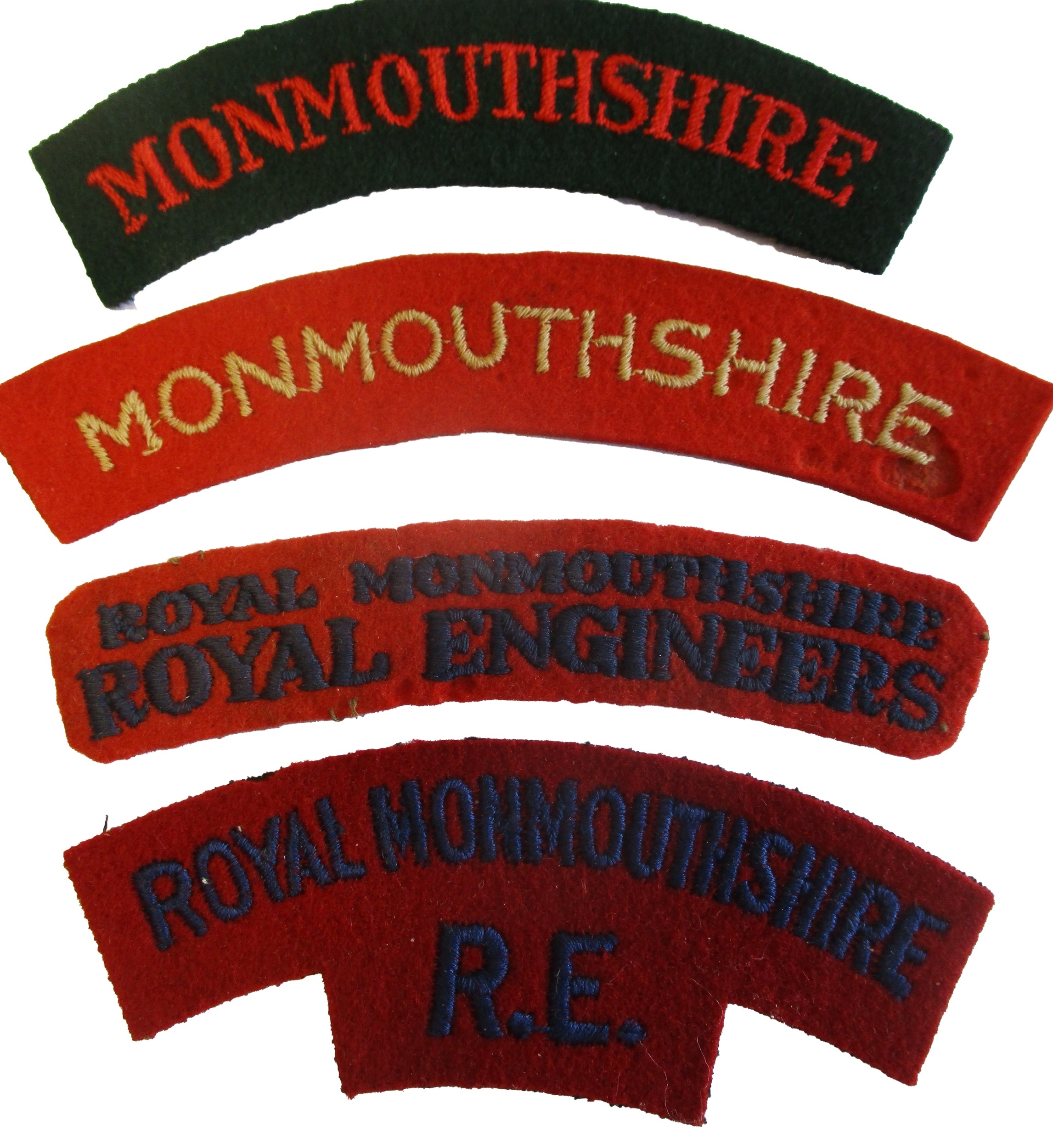 3. Royal Monmouthshire/Royal Engineers, blue embroidered lettering on red background, some stitch remains. Ex-Bosleys July 2012.
