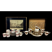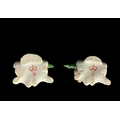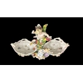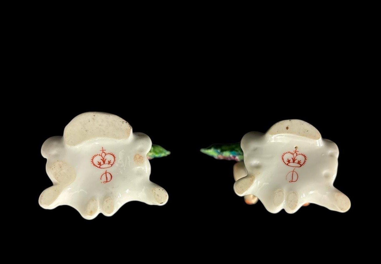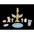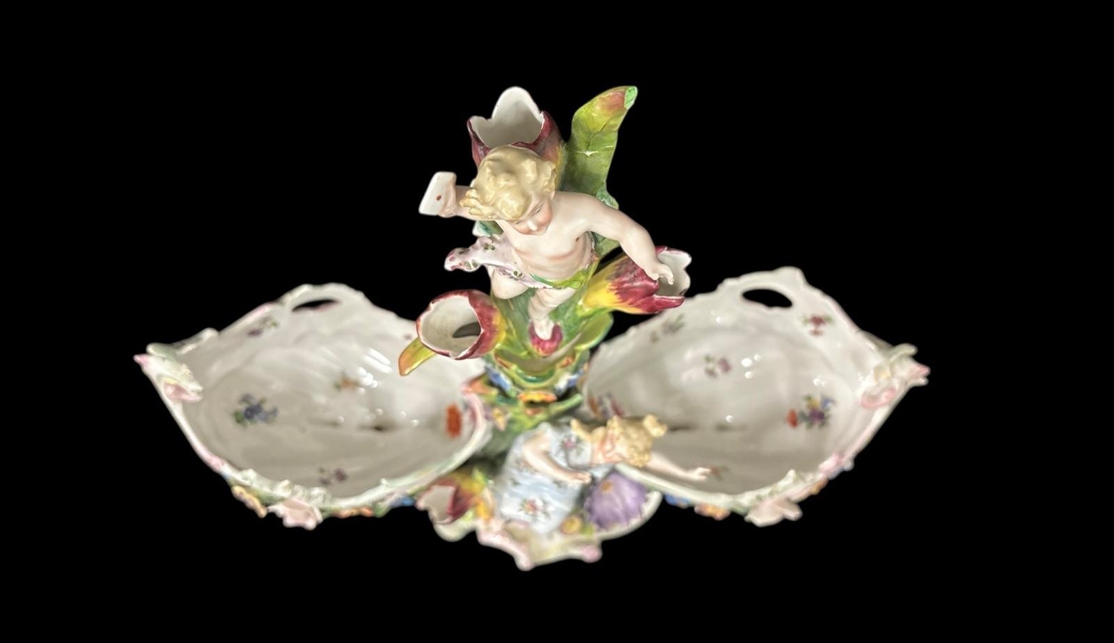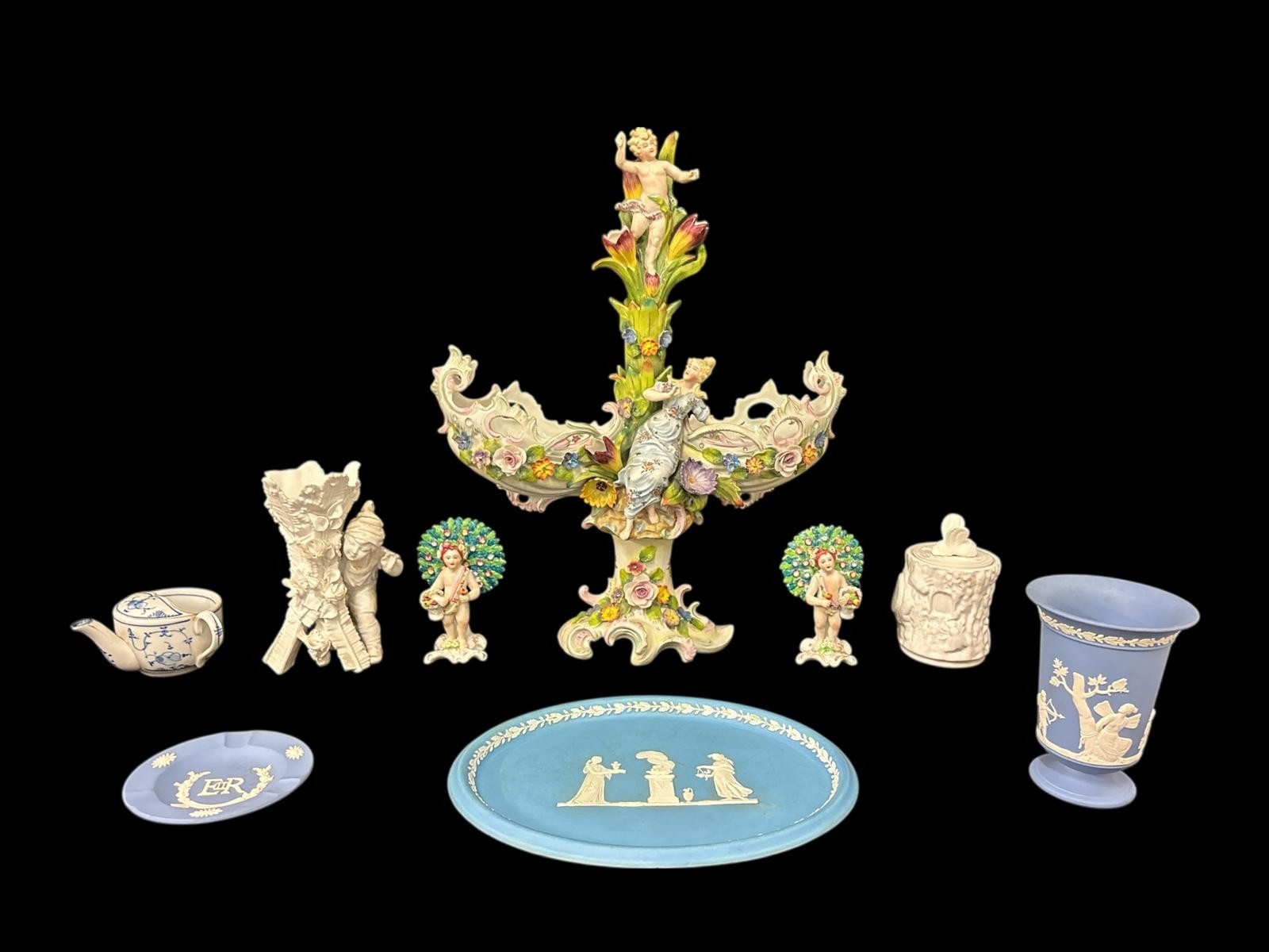 A MEISSEN STYLE HAND PAINTED FIGURAL PORCELAIN CENTREPIECE the detachable top section featuring a putti and three bud vases in the form of tulips the main portion mounted with a figural lady in chintz dress and two pierced dishes 44cm (h) (AF) together with a pair of Royal Crown Darby porcelain figures, three pieces of Wedgwood jasperware, a Parian ware honey pot with bee handle to lid, a Parian ware vase with figural egg and a blue and white porcelain feeding cup with gilt banding