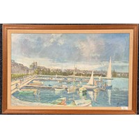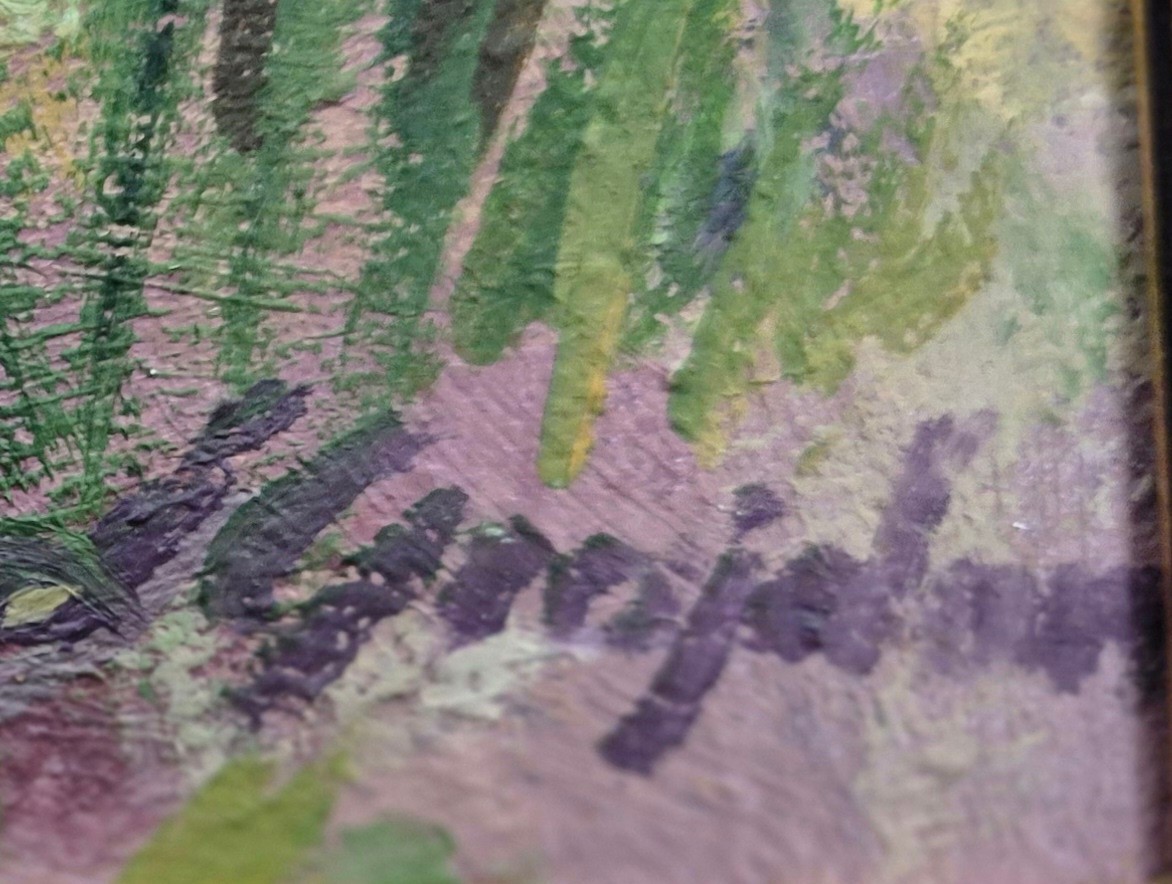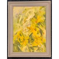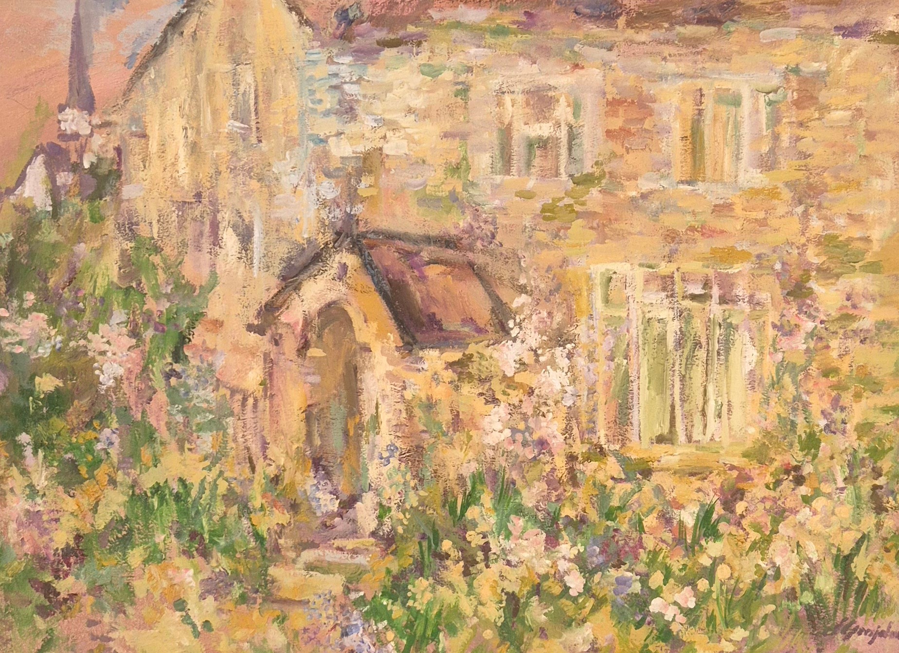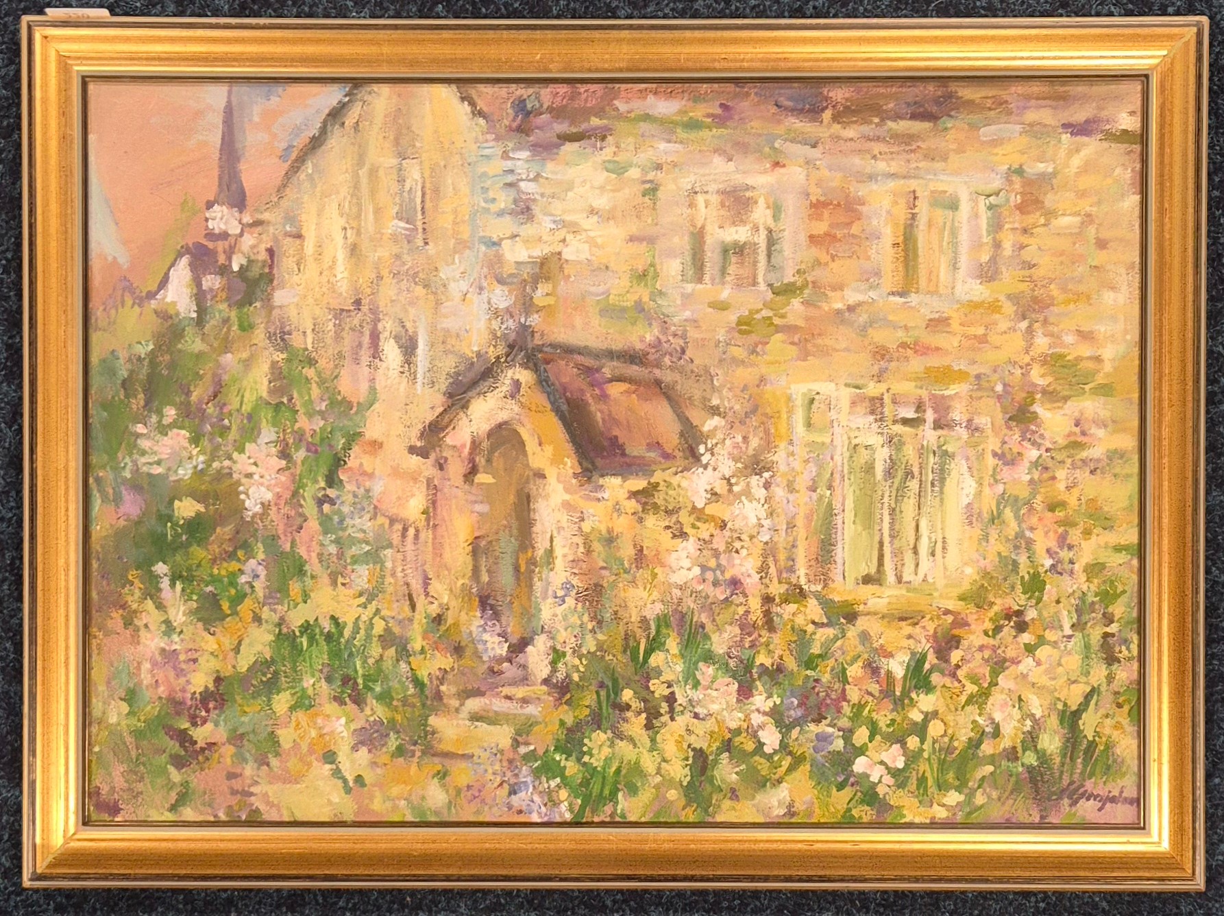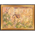 Oil on canvas depicting a cottage garden. Signed to lower right hand corner. Frame- 55x75cm.