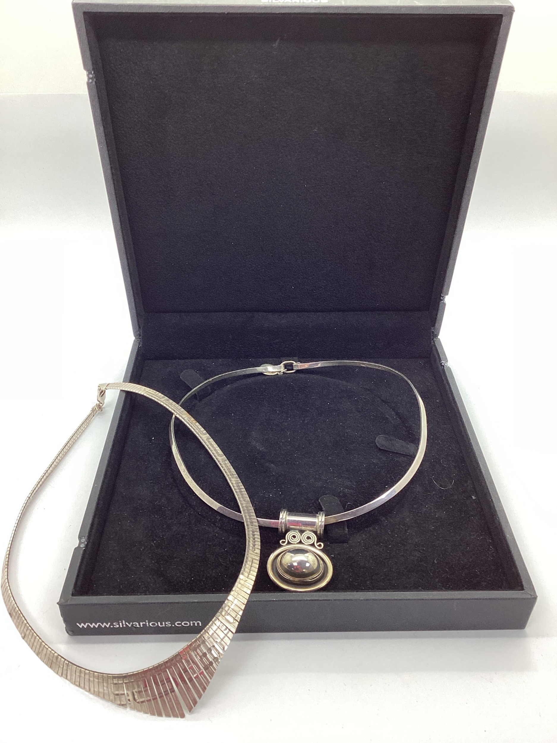 Stefani St Jacques Hallmarked Silver Fringe Style Necklet, of textured finish; Silvarious Modern Necklet, suspending sliding pendant (boxed).