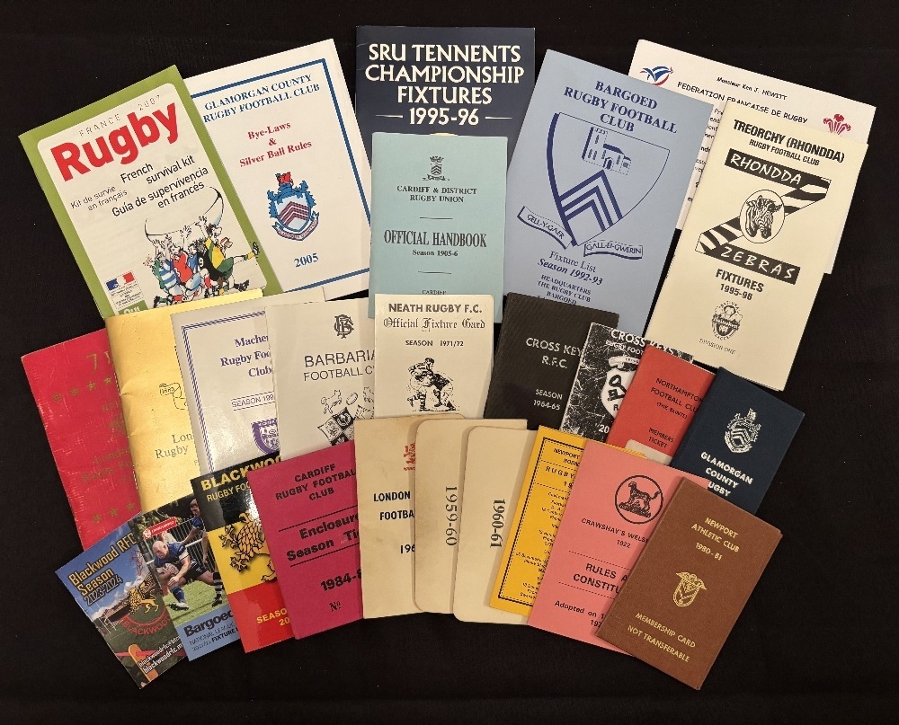 Rugby Club and County etc Fixture Cards and so on (26): From Blackwood (2), Bargoed (2), Northampton, Cross Keys (2), Glamorgan (2), Cardiff, L Scottish (3), Newport (3), Crawshay’s Welsh, Cardiff and District, Neath, Barbarians, Machen, L Welsh (32), Treorchy, the Scottish Championship 95-6, and invite to the pre matchday dinner, France v Wales, 2005, and a ‘French Rugby Survival Kit’ booklet, 2007!, Mostly G/VG