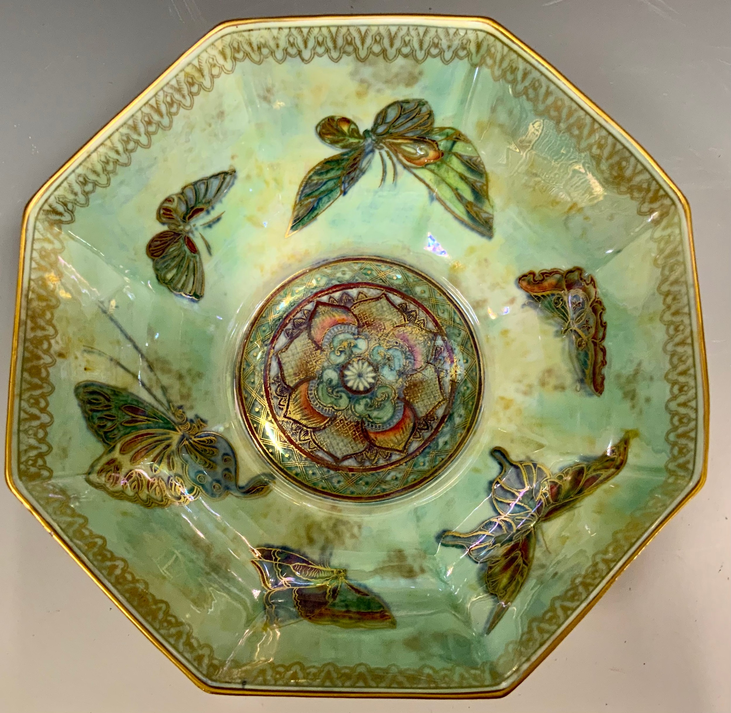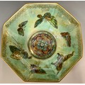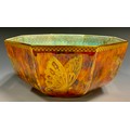 A Wedgwood Fairyland Butterfly lustre hexagonal bowl, designed by Daisy Makeig-Jones, the interior with butterflies, on a mottled ground, the exterior conforming on an orange ground, 21cm wide, printed Portland vase mark, Z4830