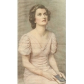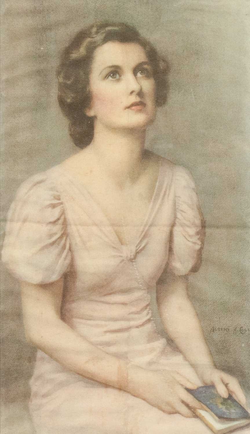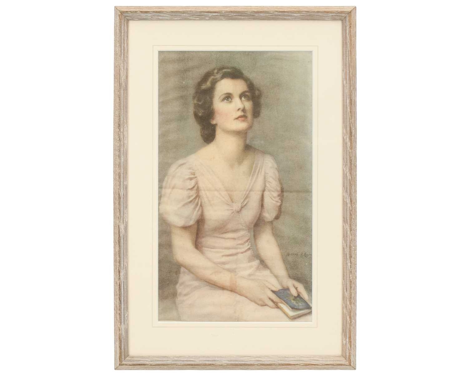 Portrait of a lady on silk. Print, after the painting by Albert HENRY COLLINGS (1868-1947), framed and glazed, 29cm x 43cm.