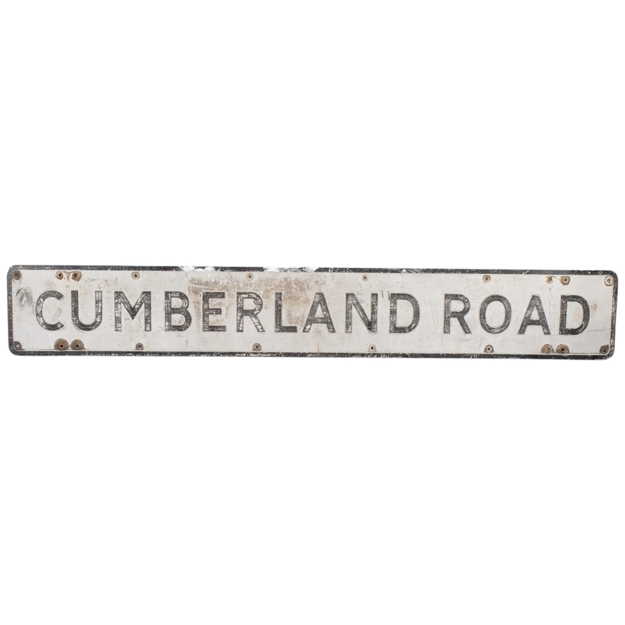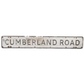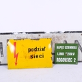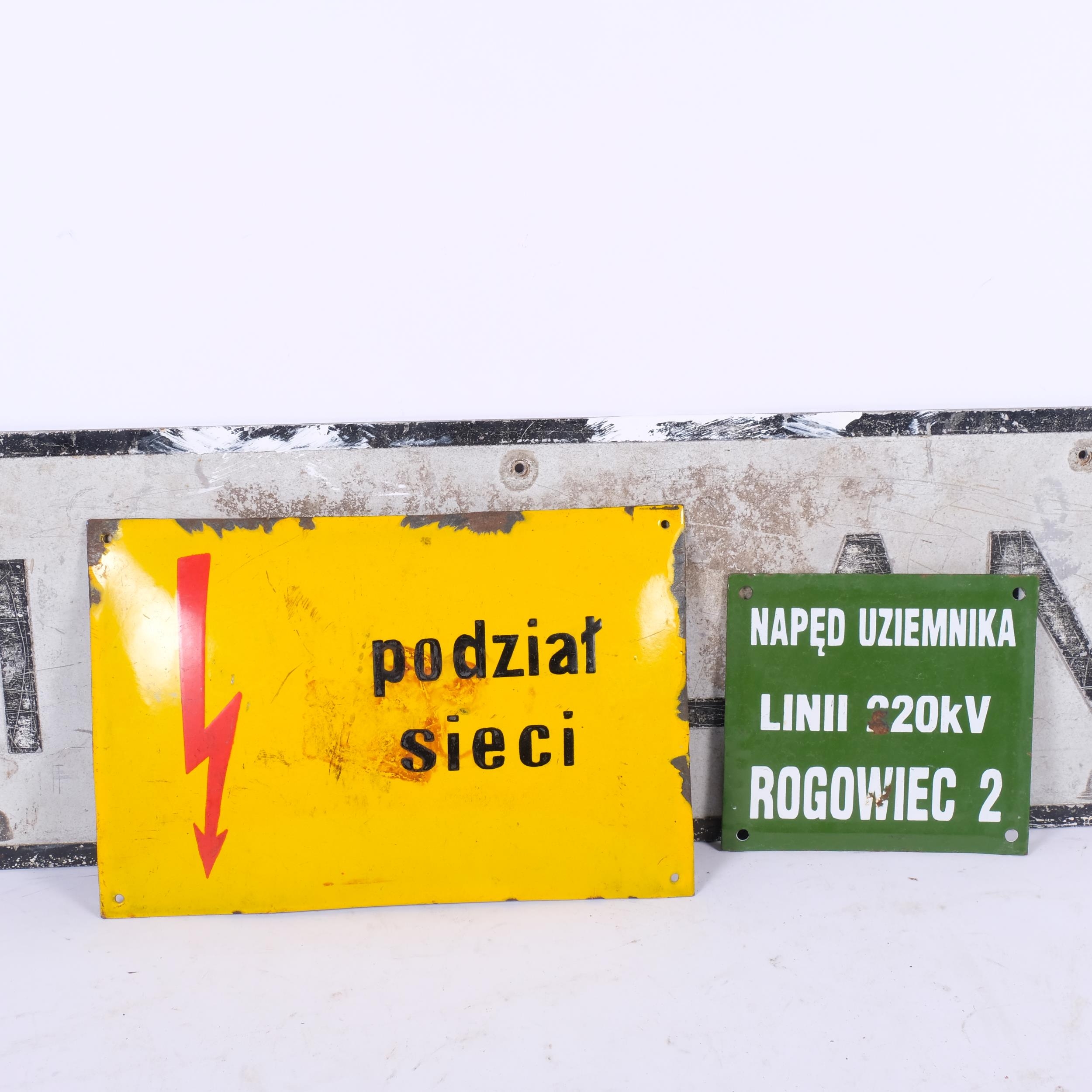 2 Vintage enamel electrical warning signs in Polish language, dimensions of largest W30cm, H20cm, and a metal street sign "Cumberland Road" (3)