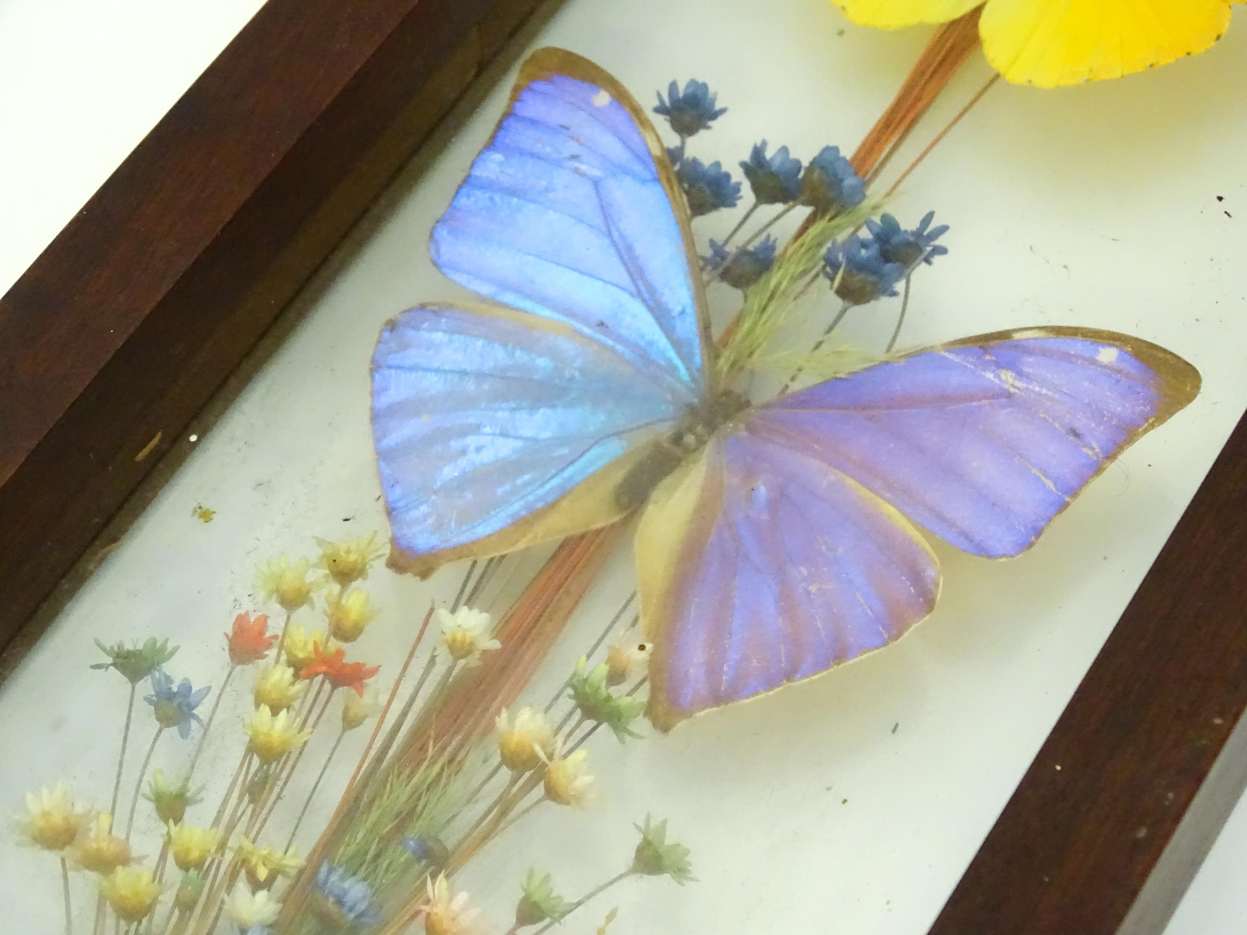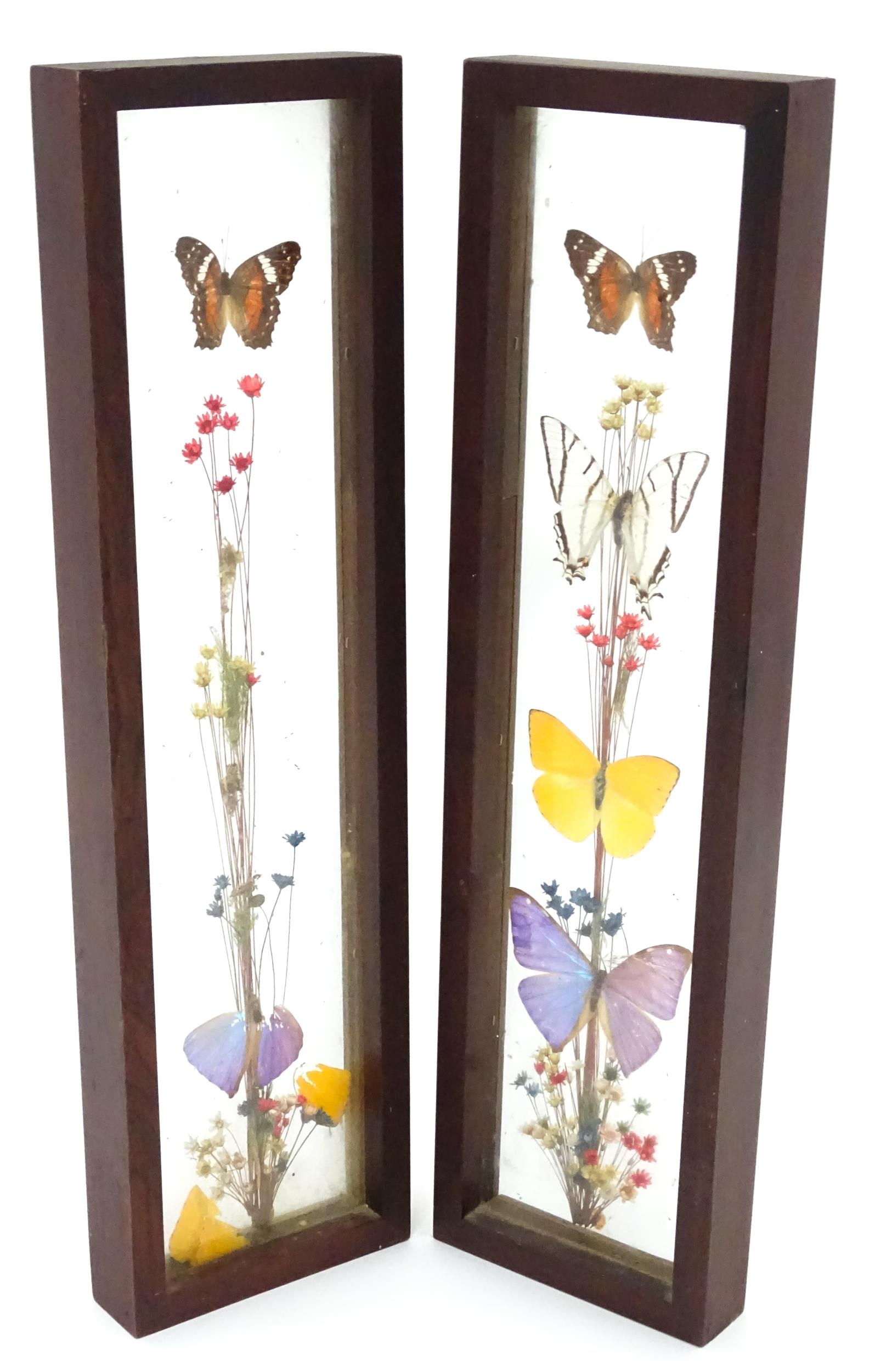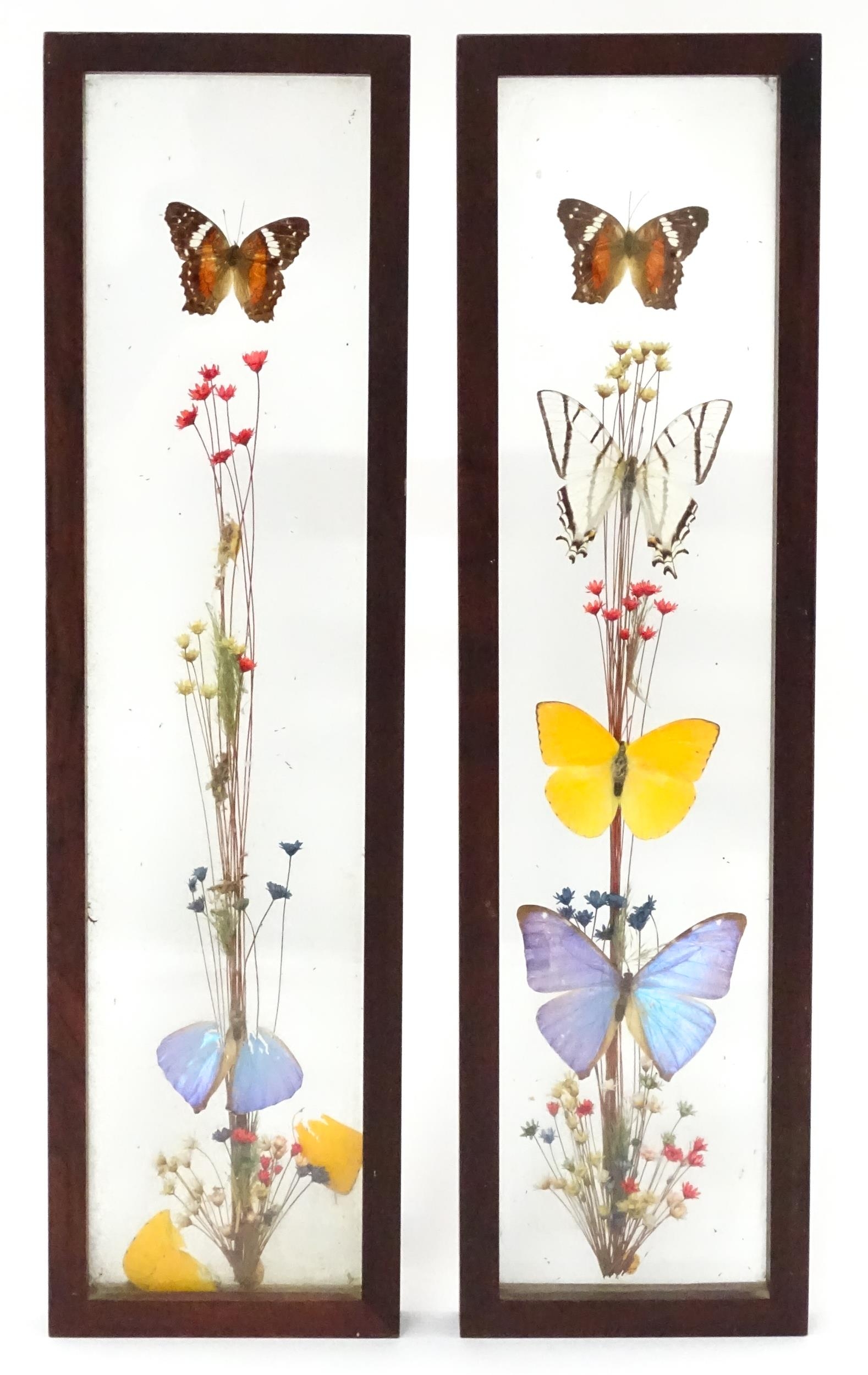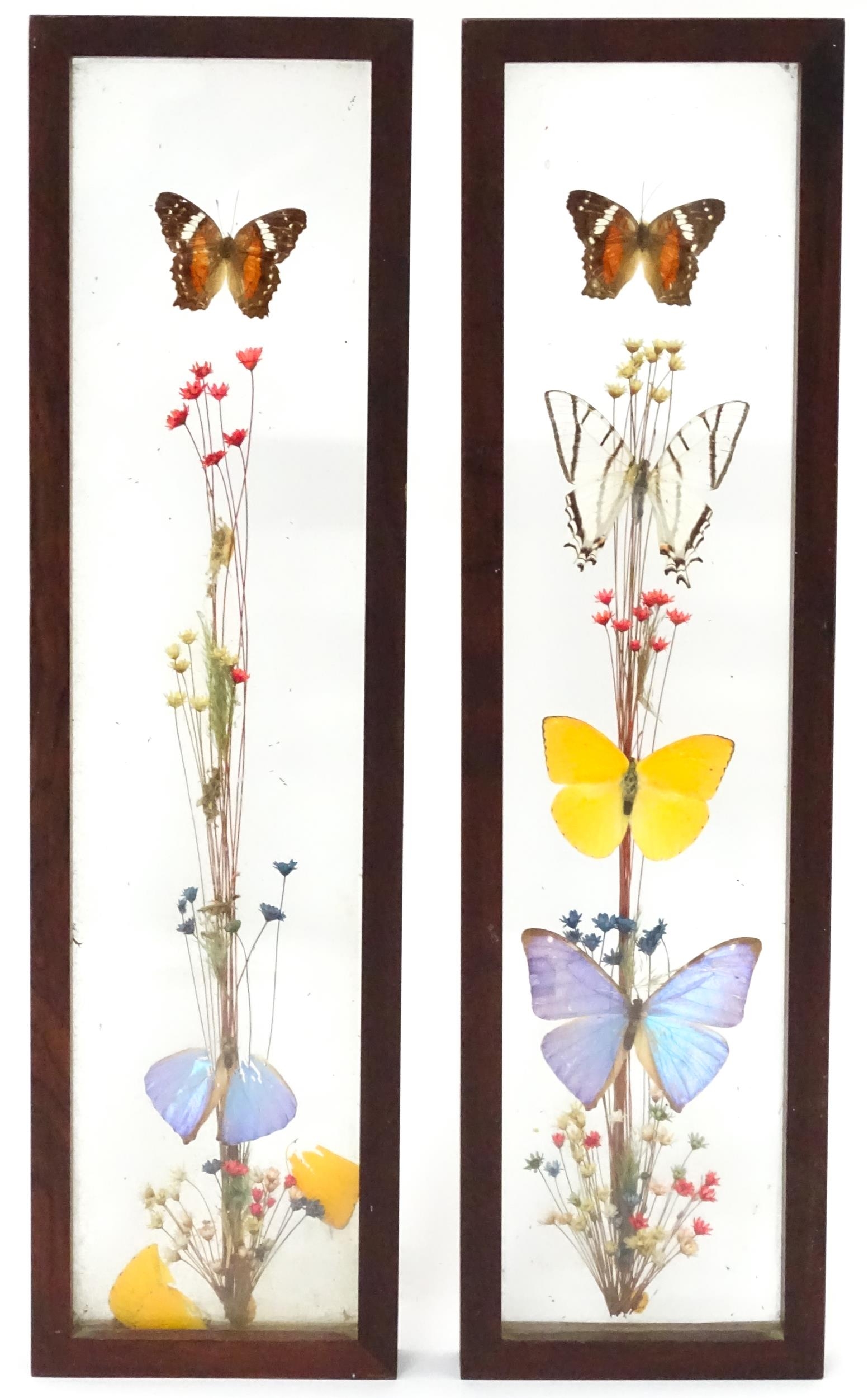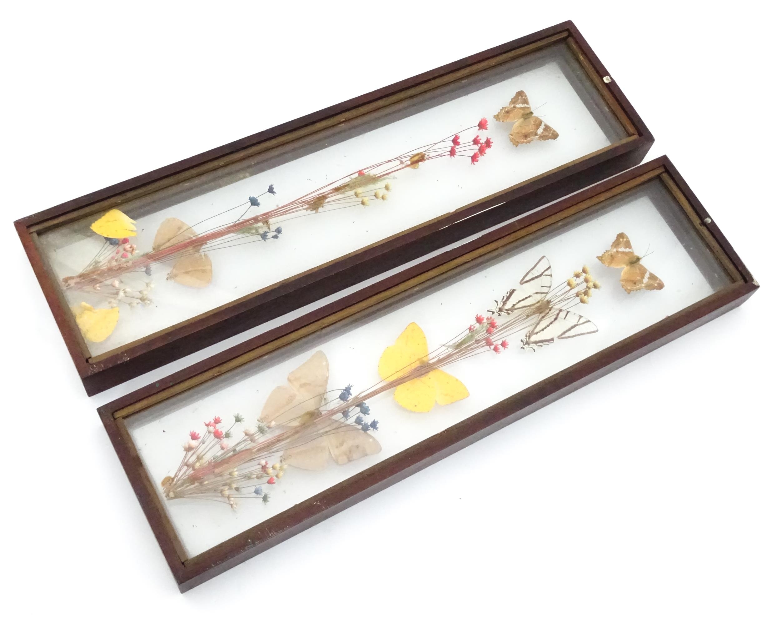 Taxidermy : a pair of early to mid 20thC framed mounts of tropical butterflies, each approx 18" x 5" (2)