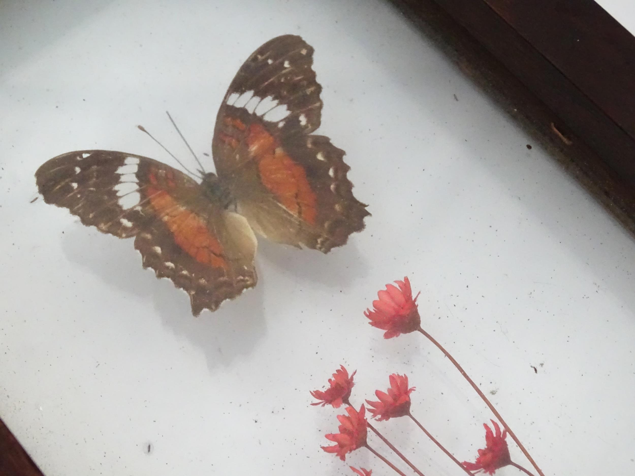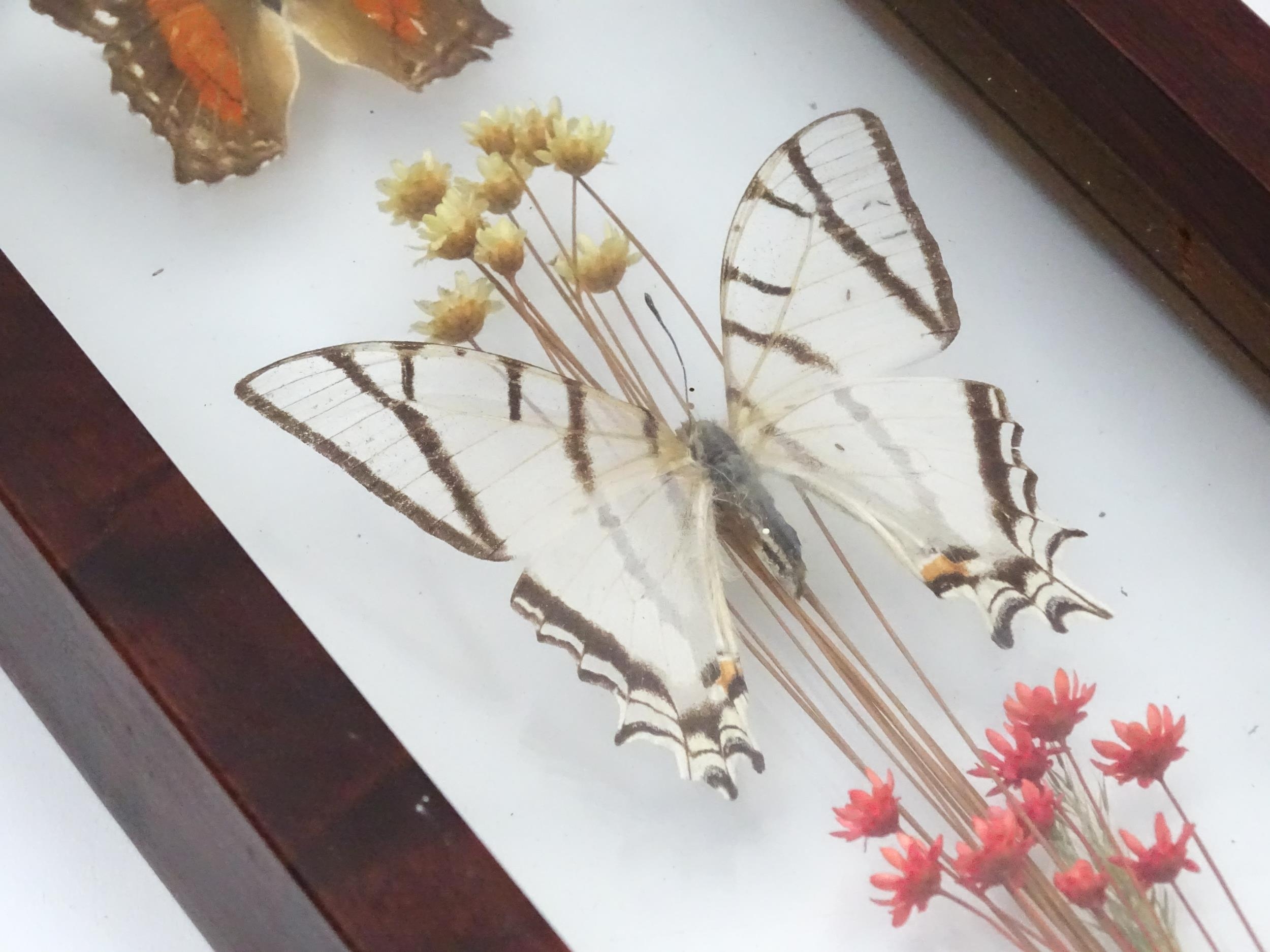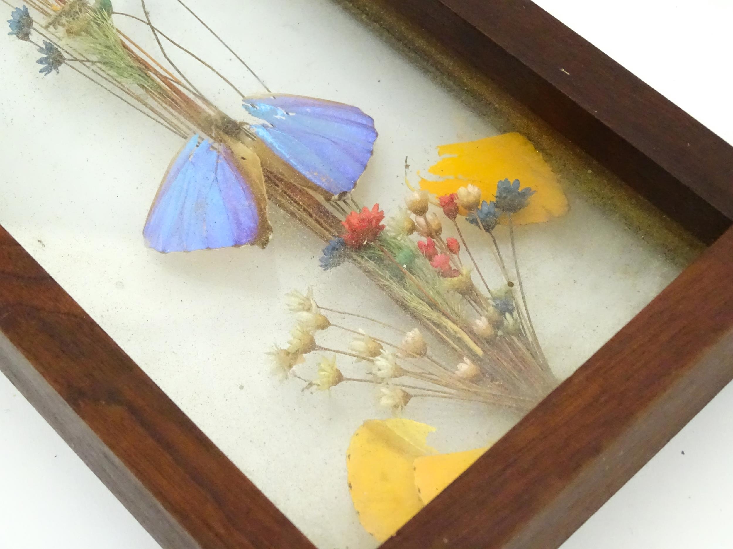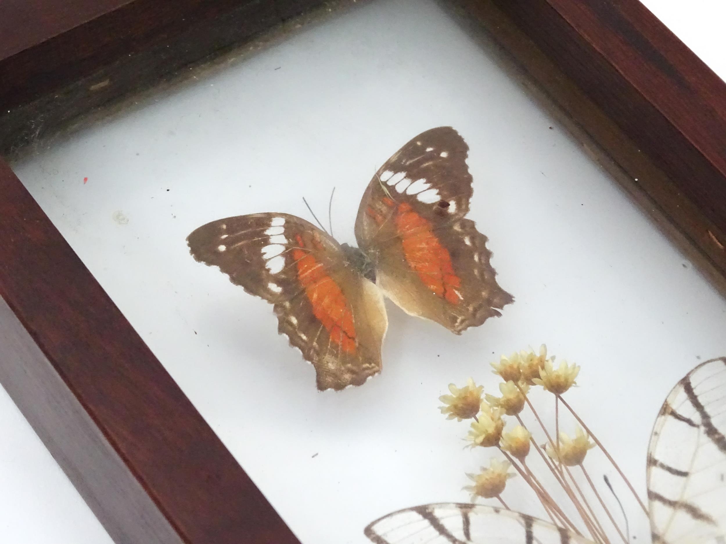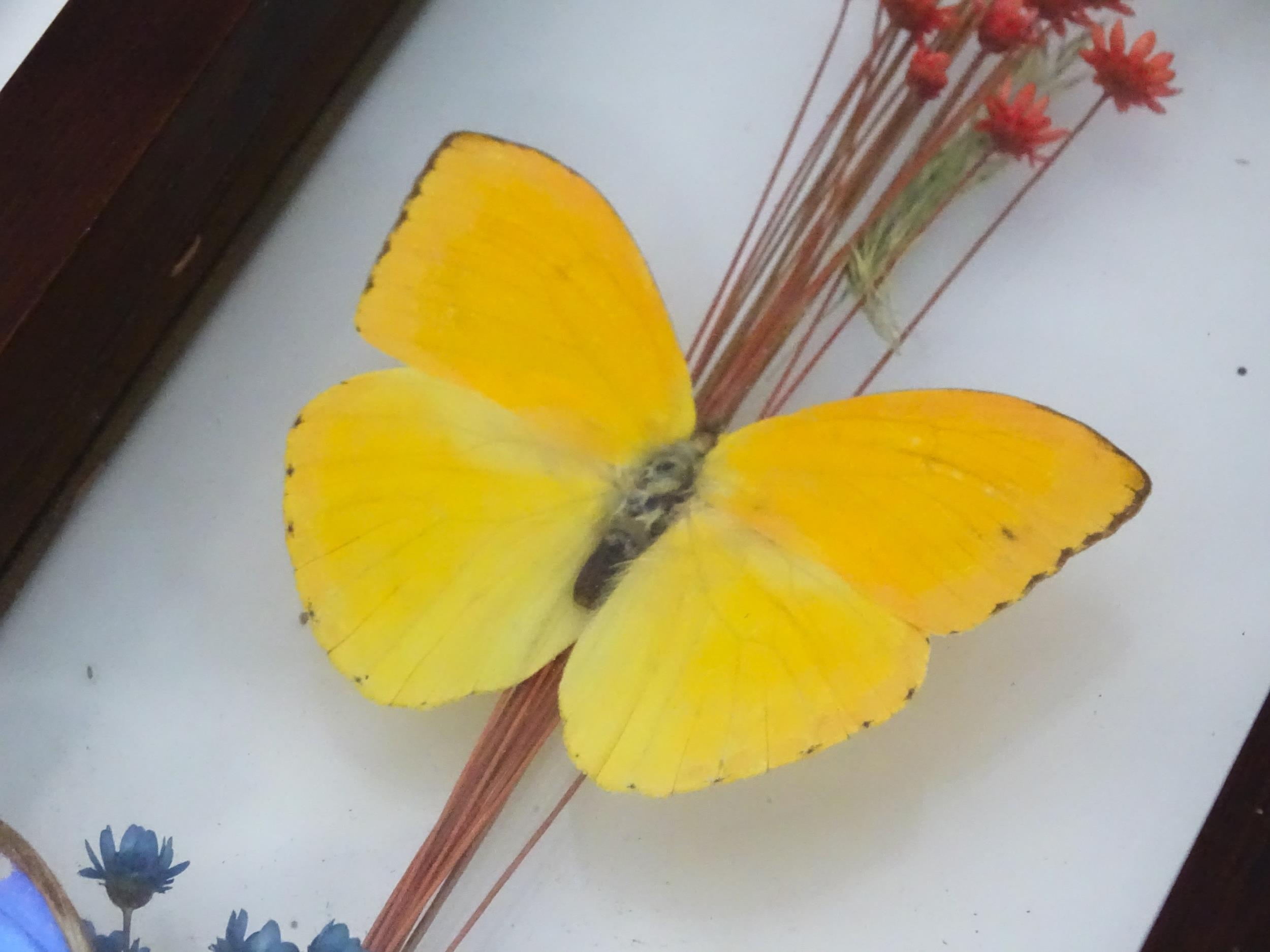 Taxidermy : a pair of early to mid 20thC framed mounts of tropical butterflies, each approx 18" x 5" (2)