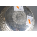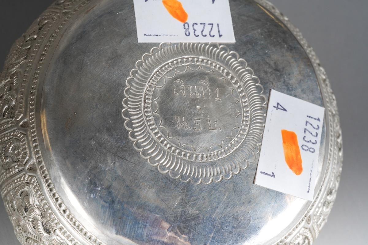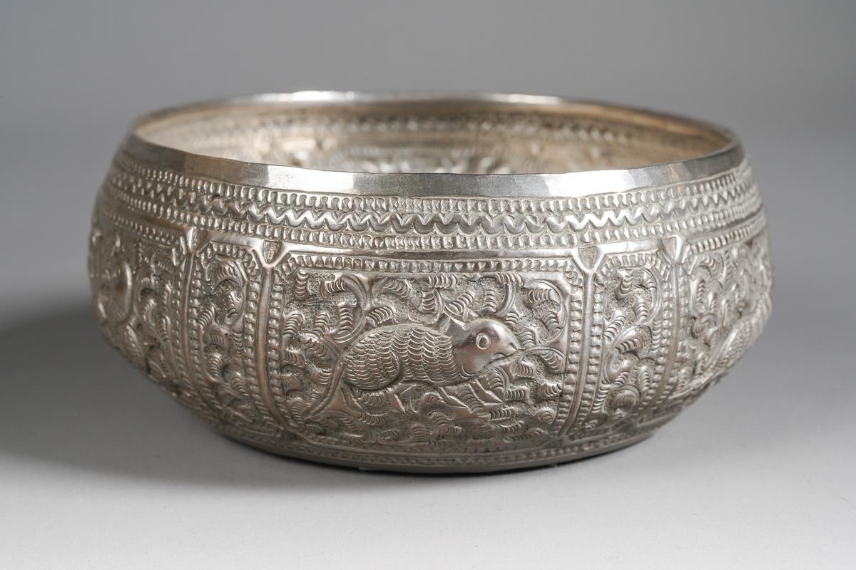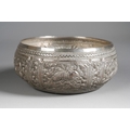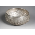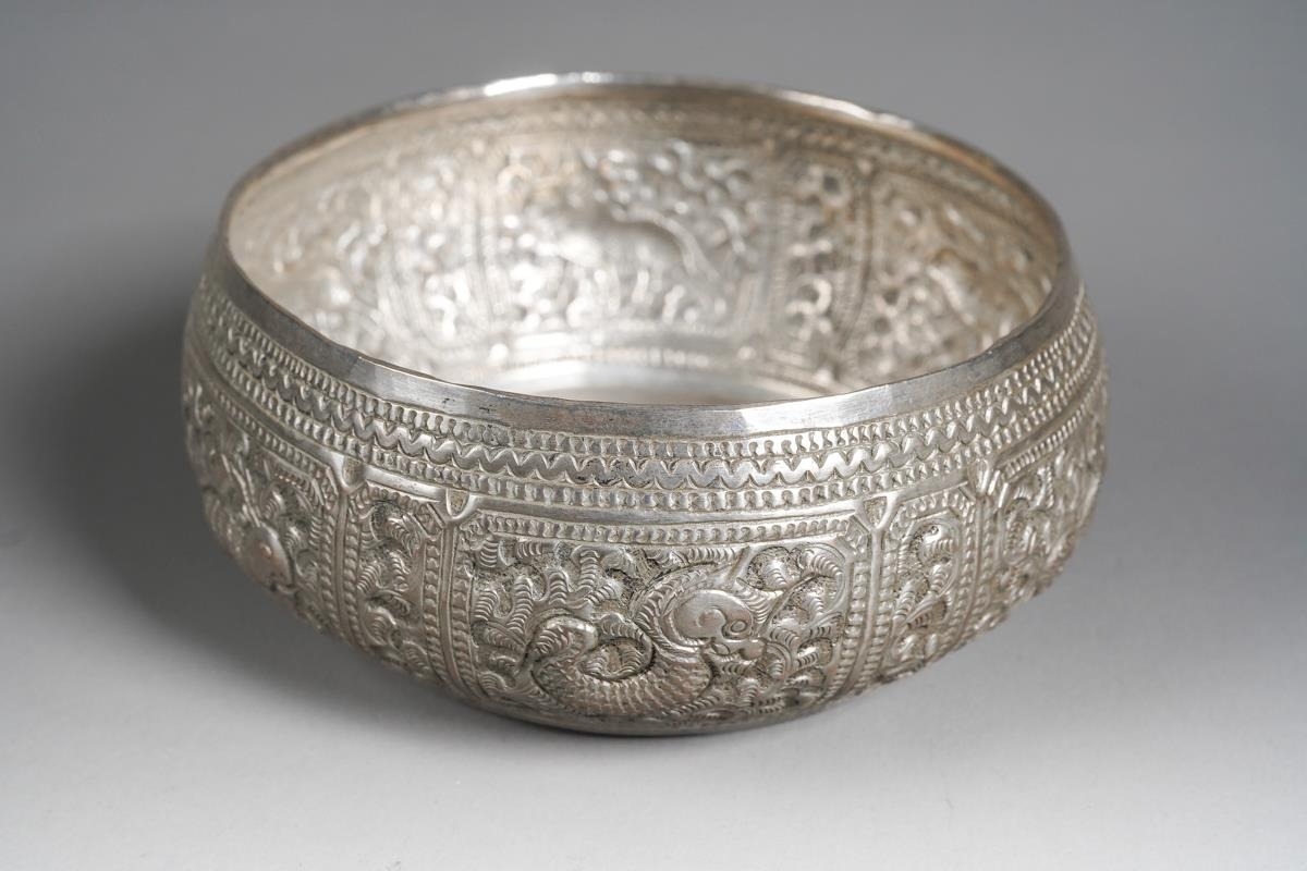 An early 20th century Indian white metal circular bowl, repousse decorated with panels of animals and foliate motifs, the base engraved with a circular design and lettering, diameter 9cm, 73 grams