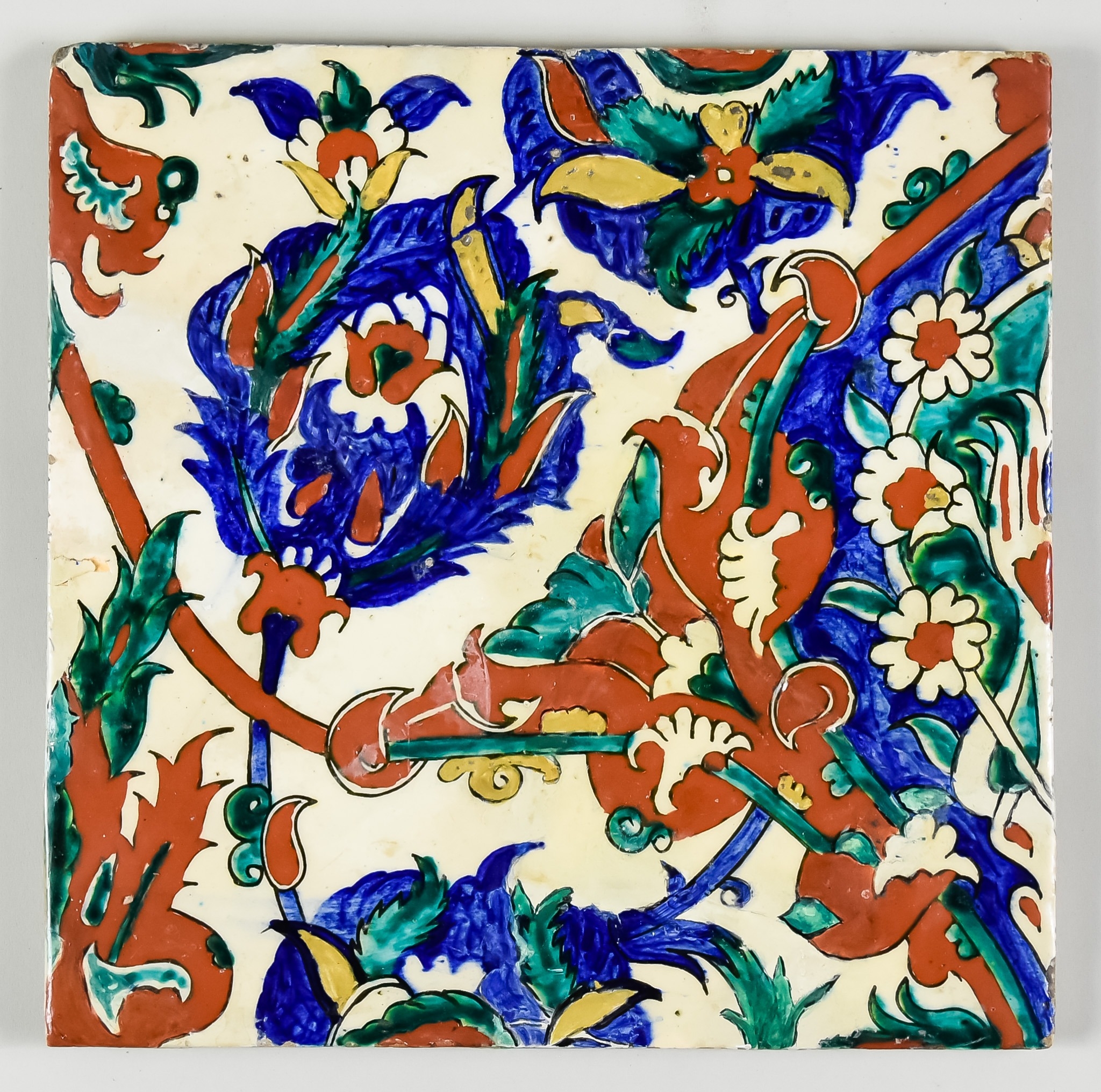 A Turkish Pottery Tile, 18th or 19th Century, in the Iznik manner, painted in red, blue, green, yellow and outlined in black with palmette and stylised flowers, 9.5ins square