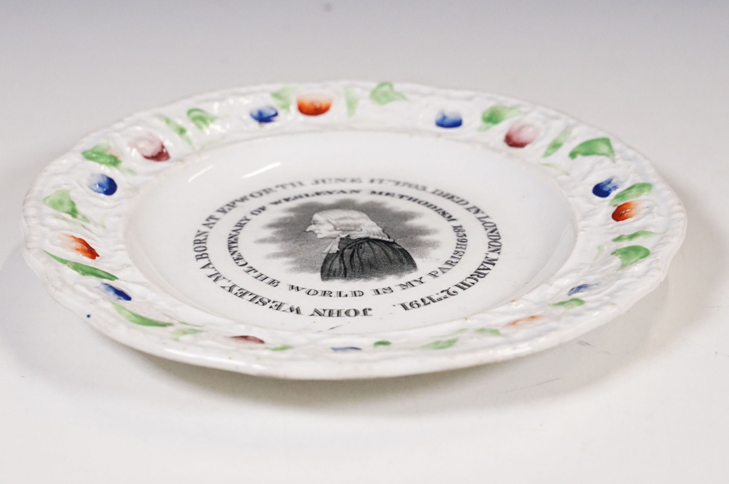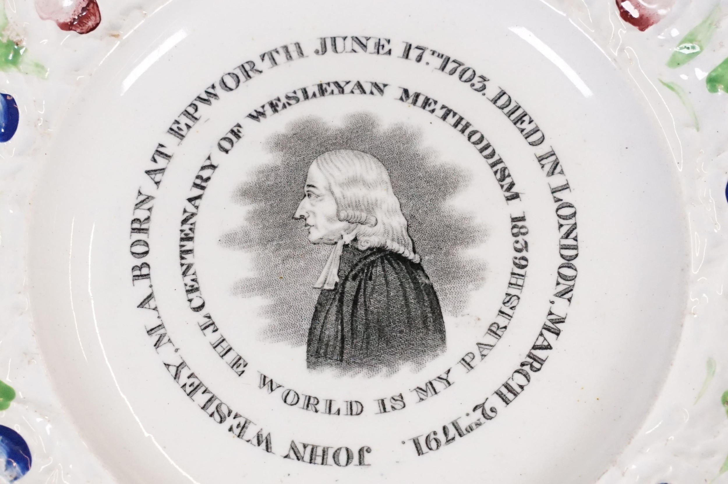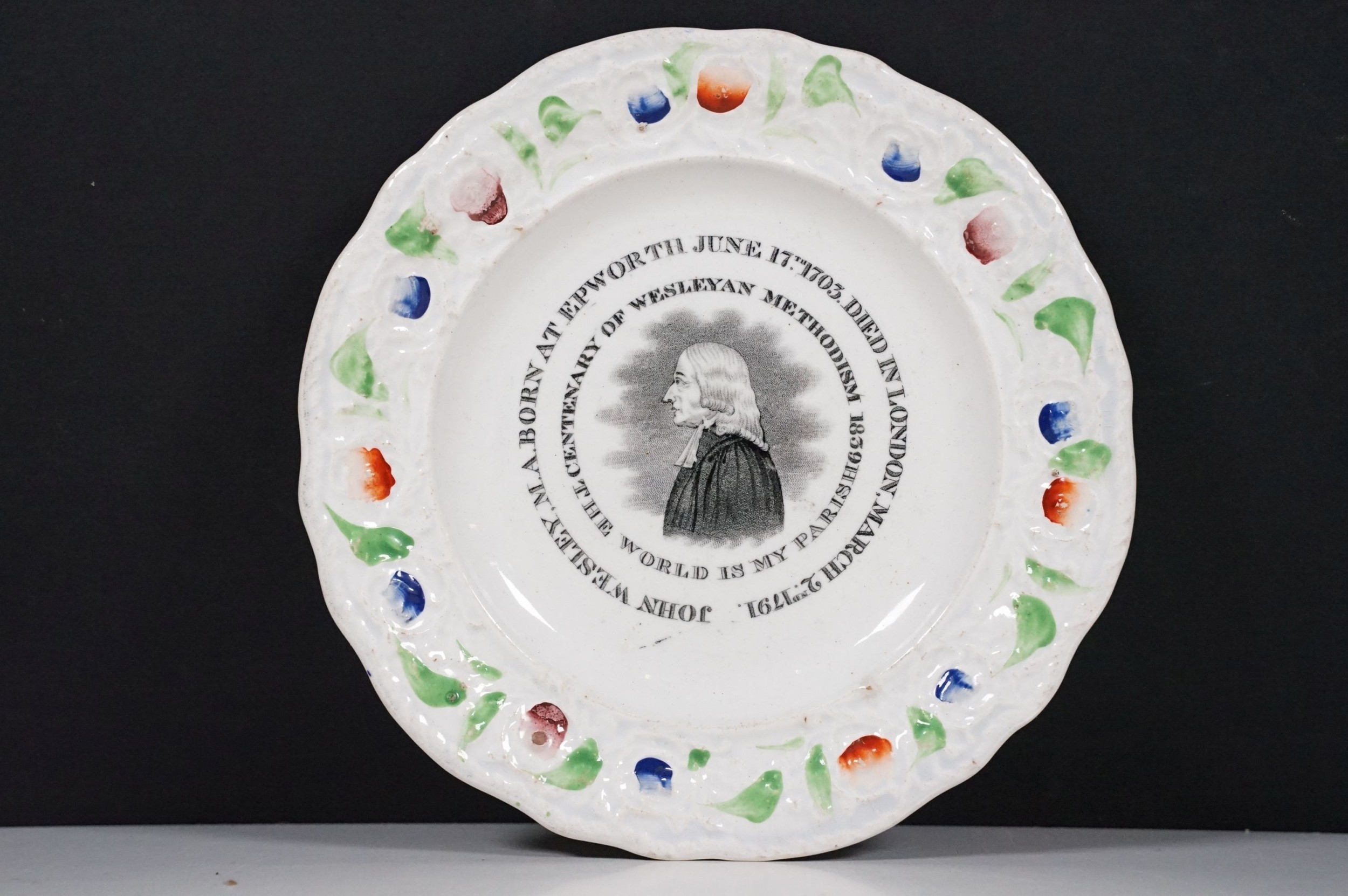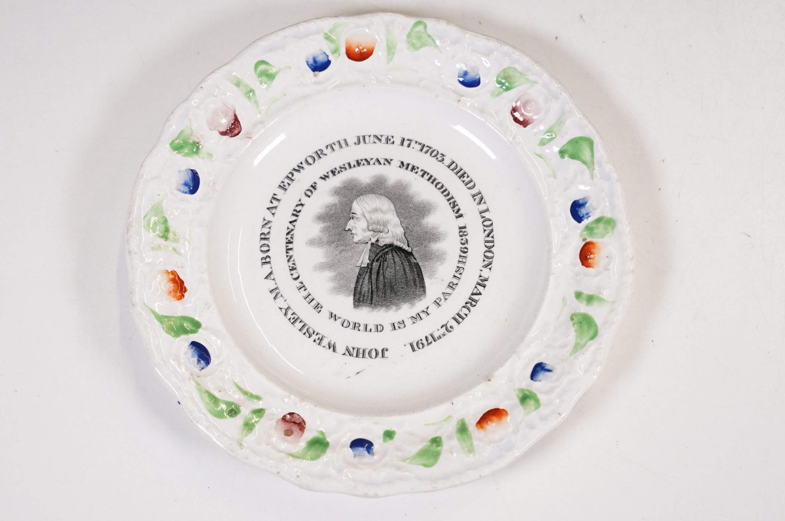 Staffordshire John Wesley centenary 1839 'The World is my Parish' transfer printed plate with hand painted detail to edge, diameter 19cm
