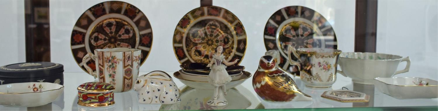 A pair of Royal Crown Derby 1128 pattern tea plates, a saucer; a Robin paperweight; a Meadow Rabbit; a Christmas tree decoration; Posie pattern; Wedgwood; etc