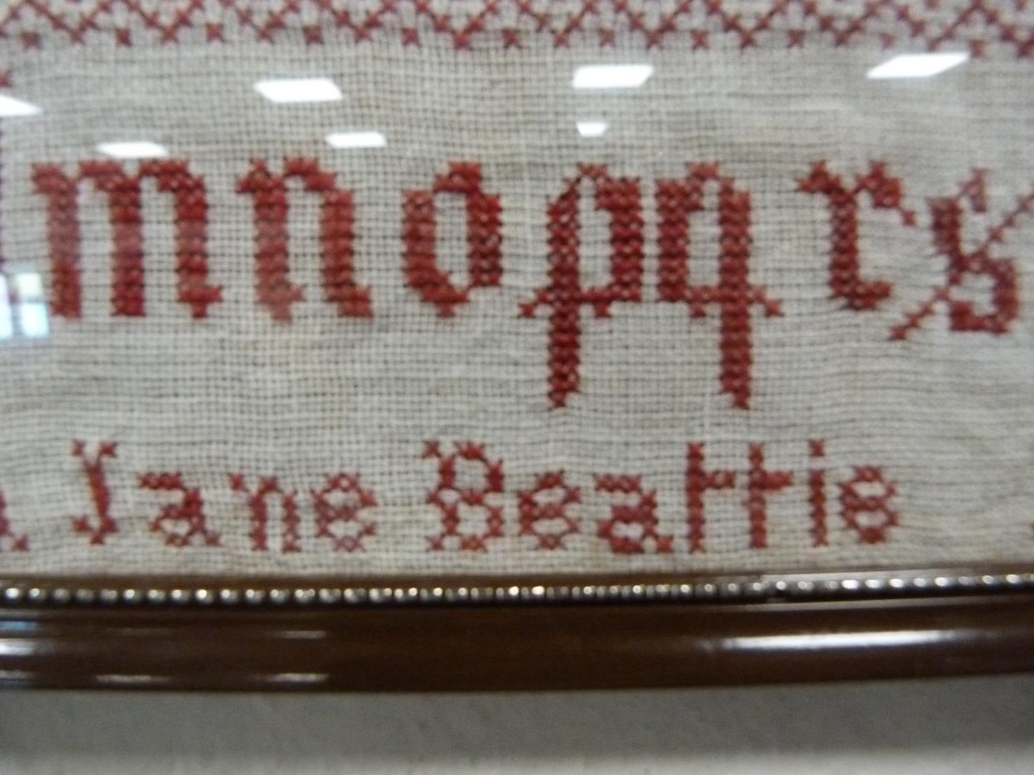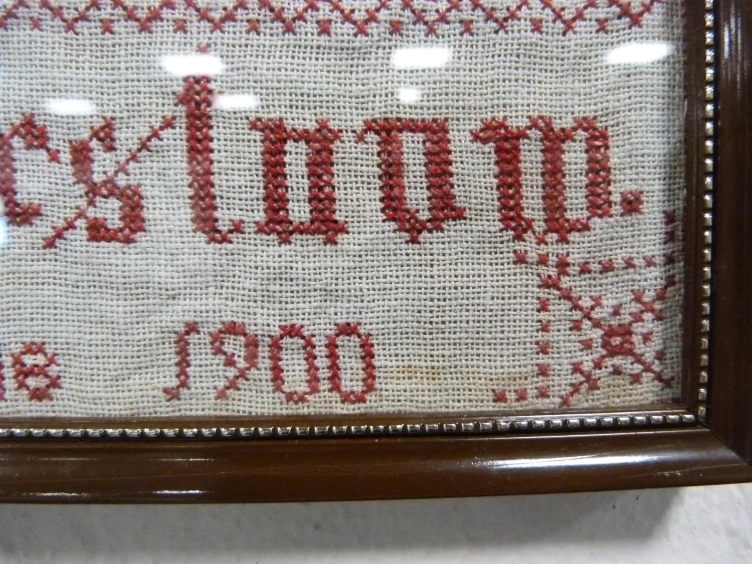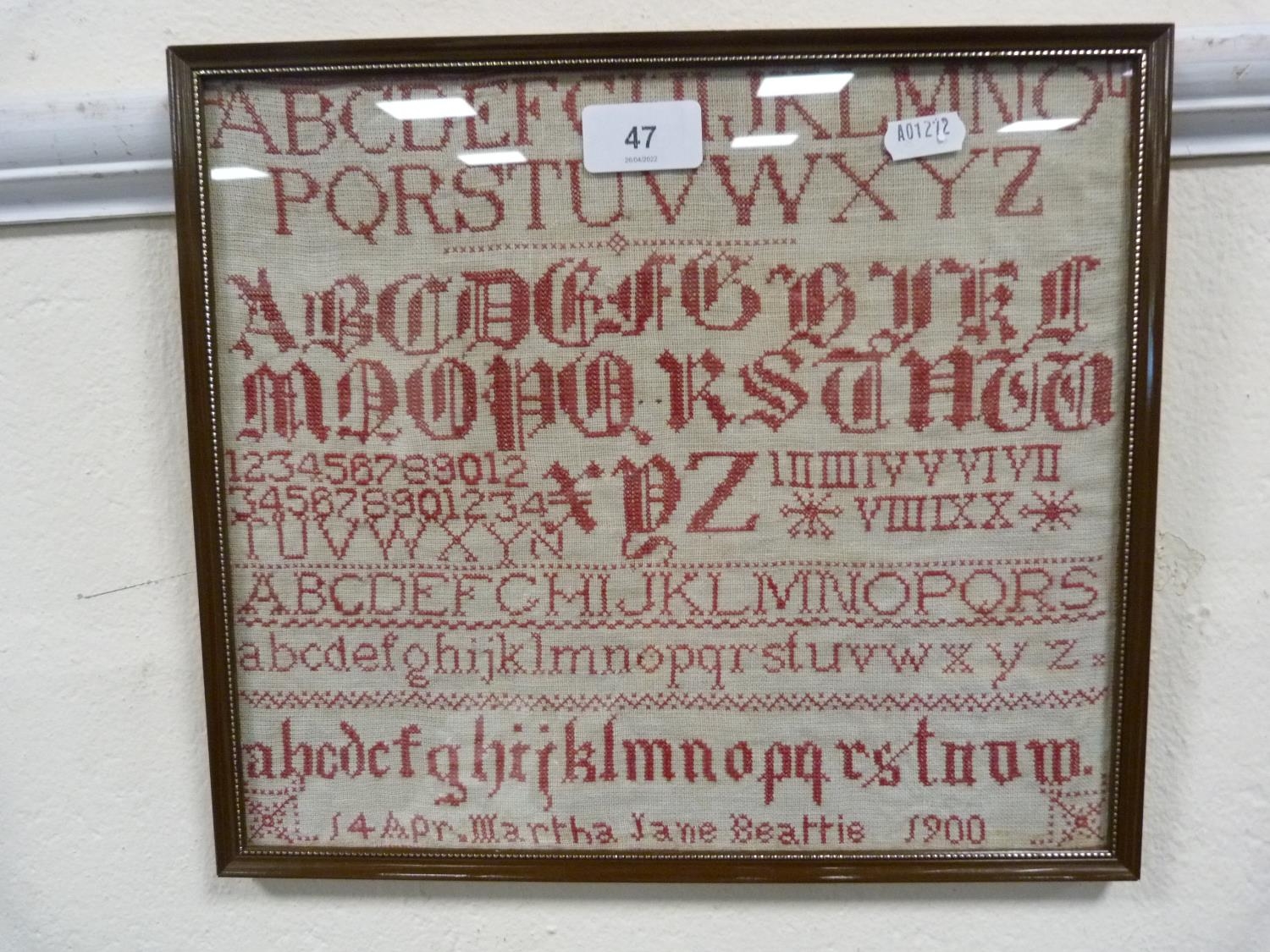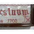 Framed needlepoint sampler worked by Martha Jane Beattie, 14th April 1900.