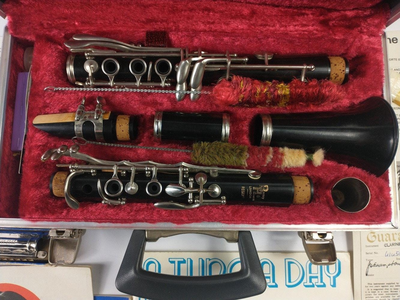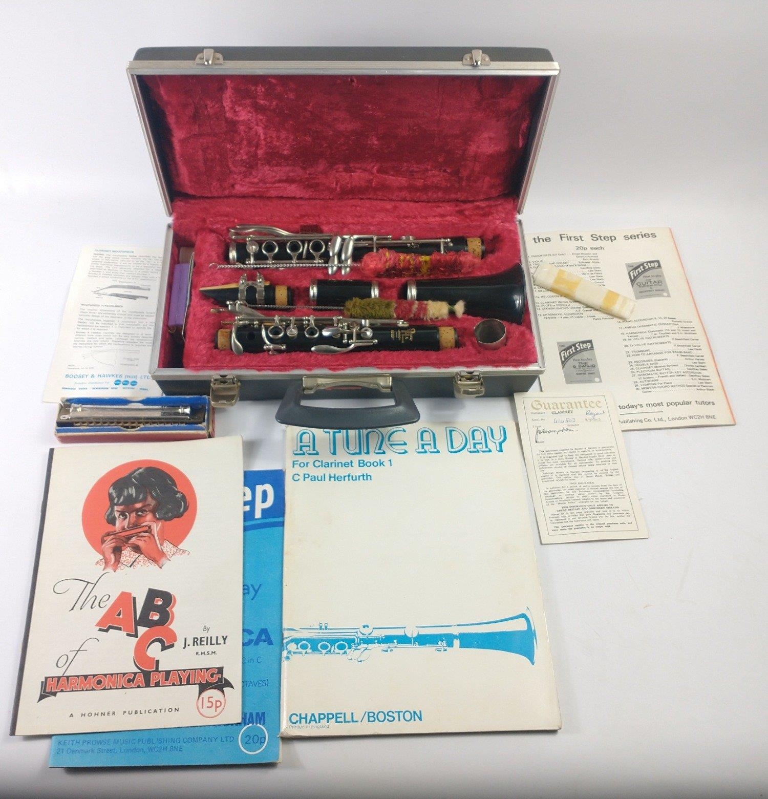 A BOOSEY & HAWKES Regent clarinet (serial number 414503) in hard-sided case with guarantee, care booklet, 'First Step - How to Play the Clarinet' by Charles Lambert and 'A Tune a Day for Clarinet book 1', plus an M HOHNER harmonica with 'How to Play' booklet and the ABC of Harmonica Playing by J Reilly