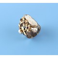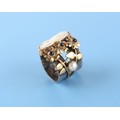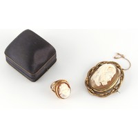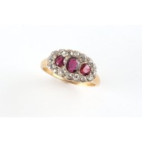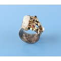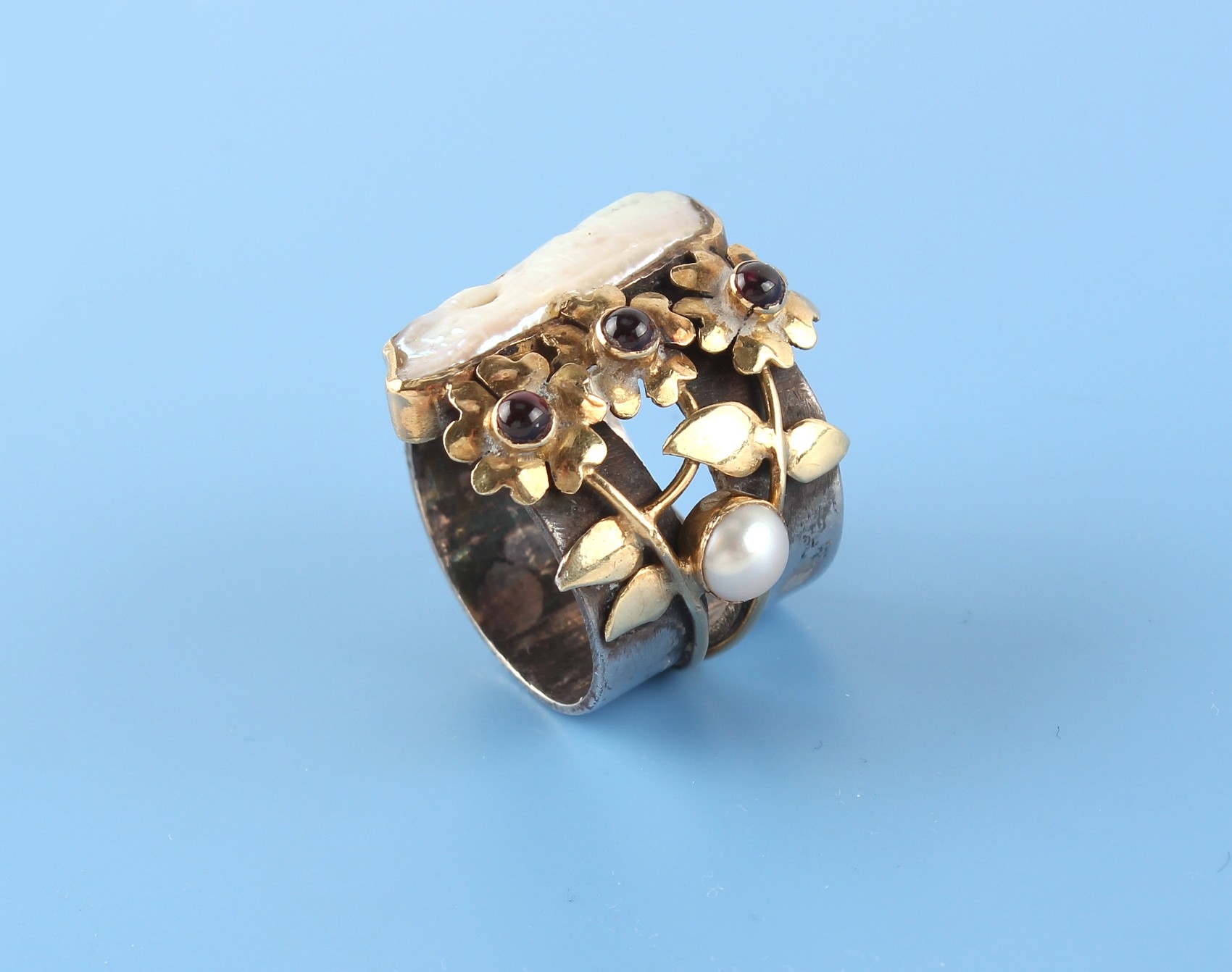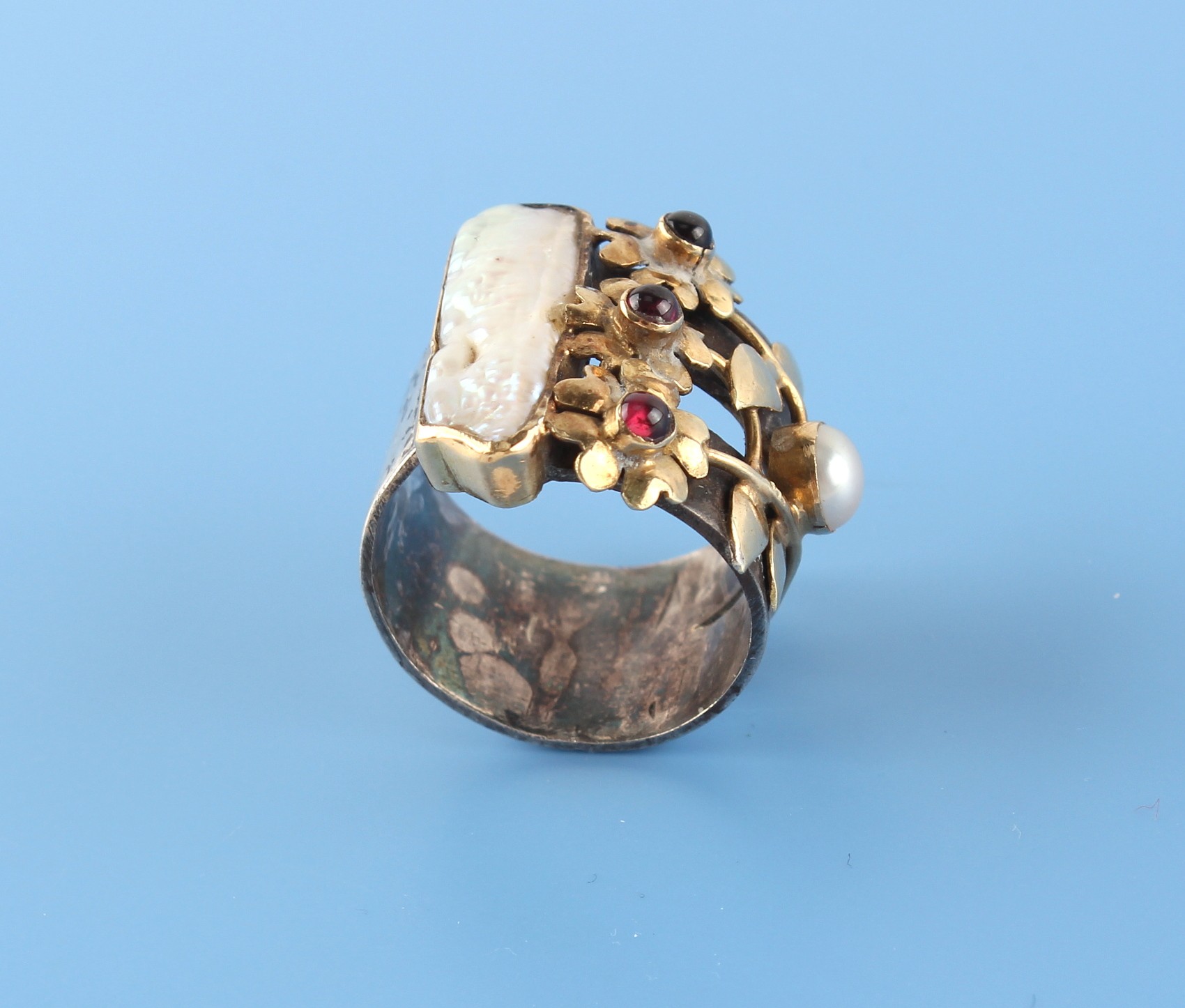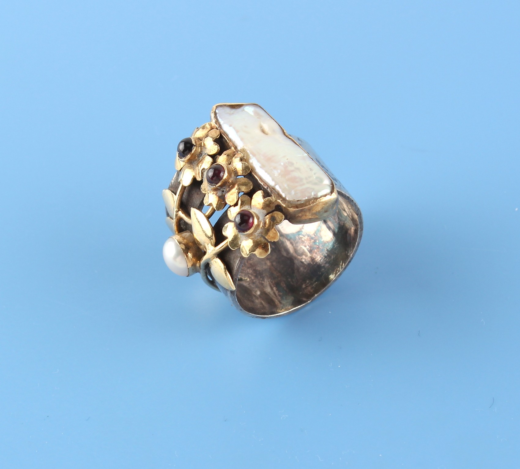Property of a lady - a modern unmarked 18ct yellow gold (tested) mounted silver ring set with a mother-of-pearl panel, a single pearl & three cabochon red stones, unsigned, approximately 12.7 grams, size P/Q.