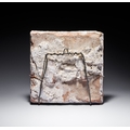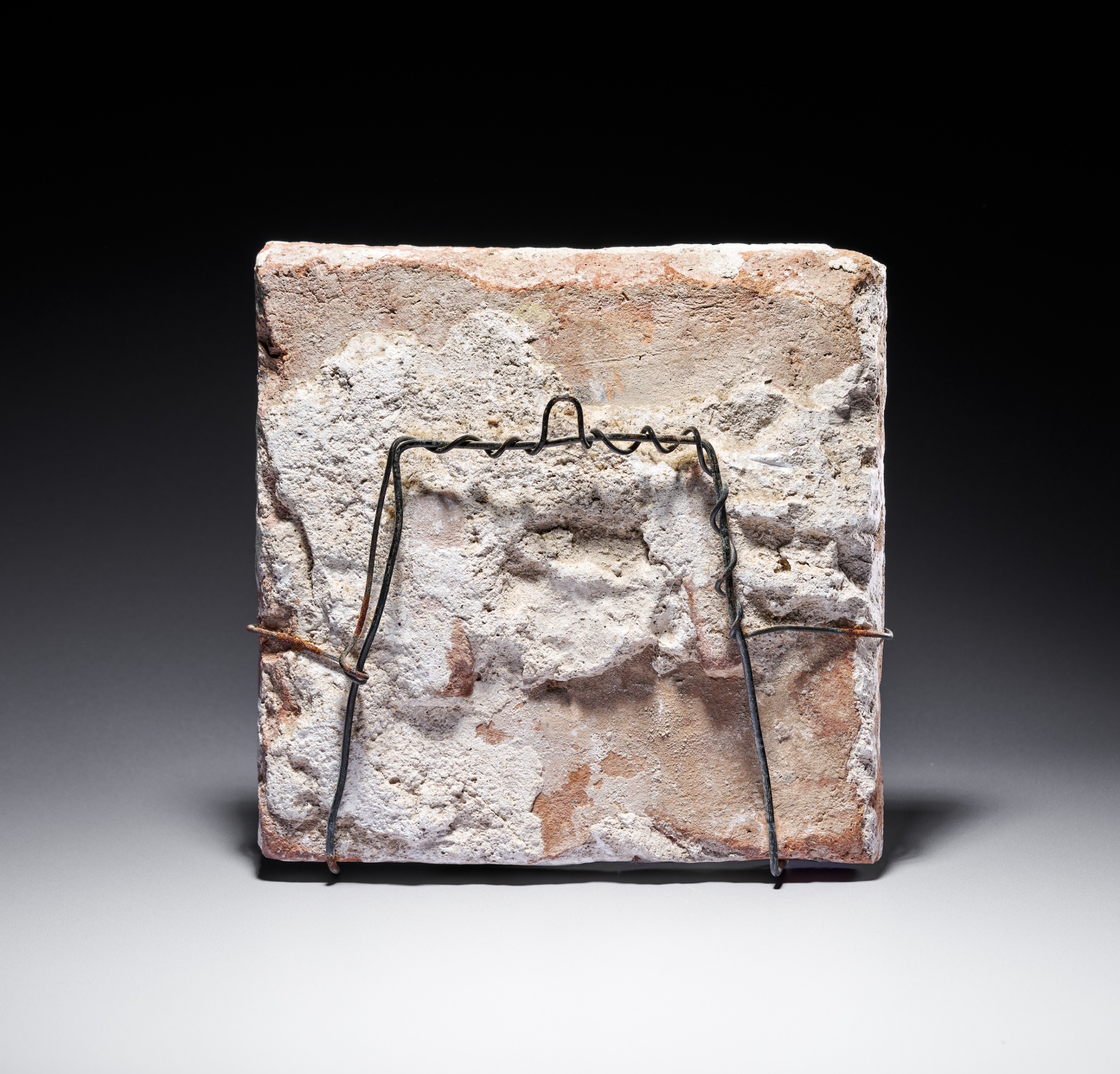 This square ceramic Qajar tile features a traditional gul-o-bulbul or bird and flower motif. The underglaze painted decoration depicts a turquoise bird perched amidst blooming pink roses and assorted foliate elements. The color palette is characteristic of 19th century Persian ceramics, utilizing cobalt blue, turquoise, manganese pink, yellow, and green with black outlines set against an off-white ground. The earthenware body is visible at the edges. The reverse is covered in thick remnants of original white lime mortar from its previous architectural installation and is currently fitted with a modern wire-wrapped hanger for display.