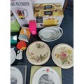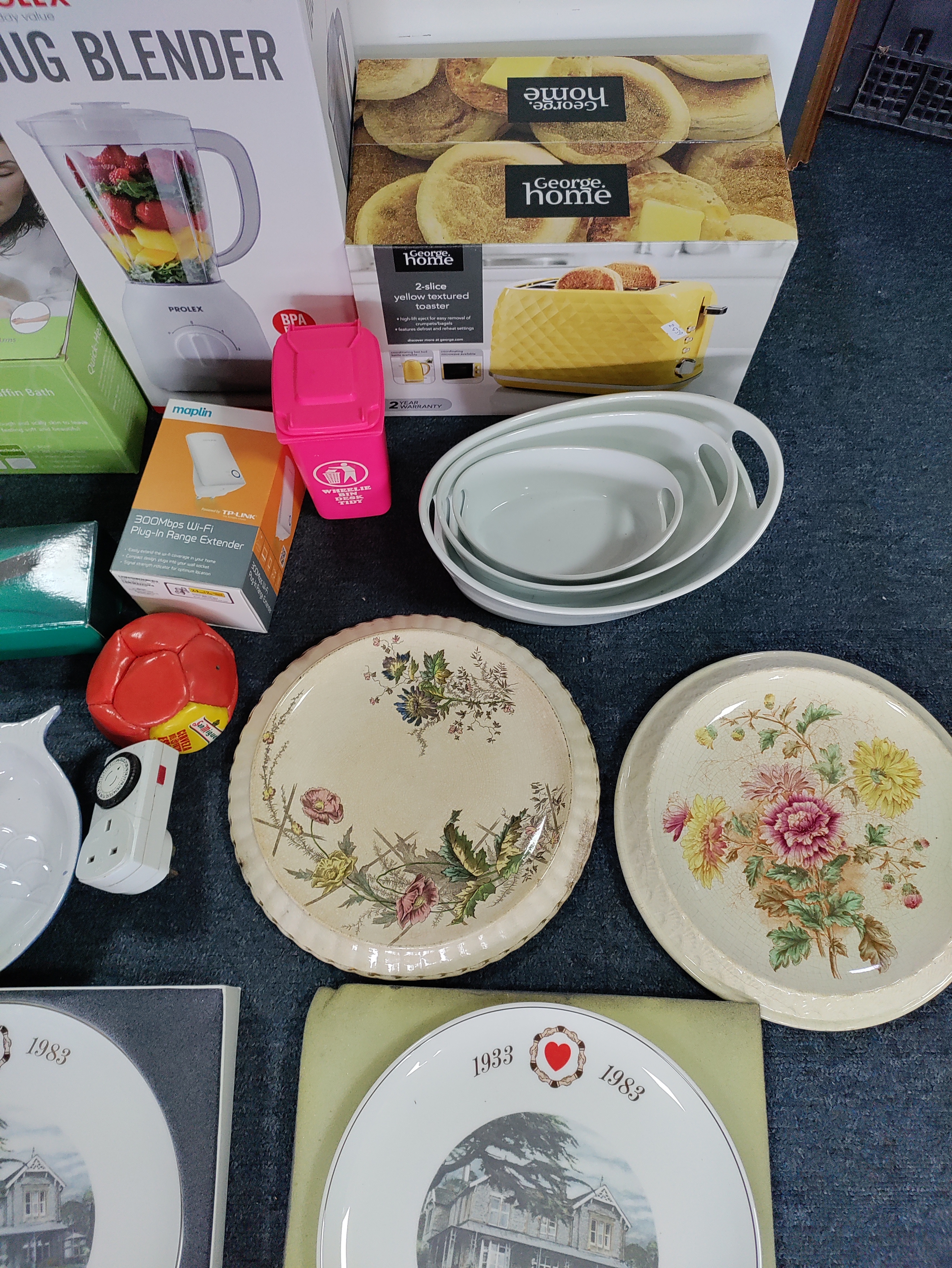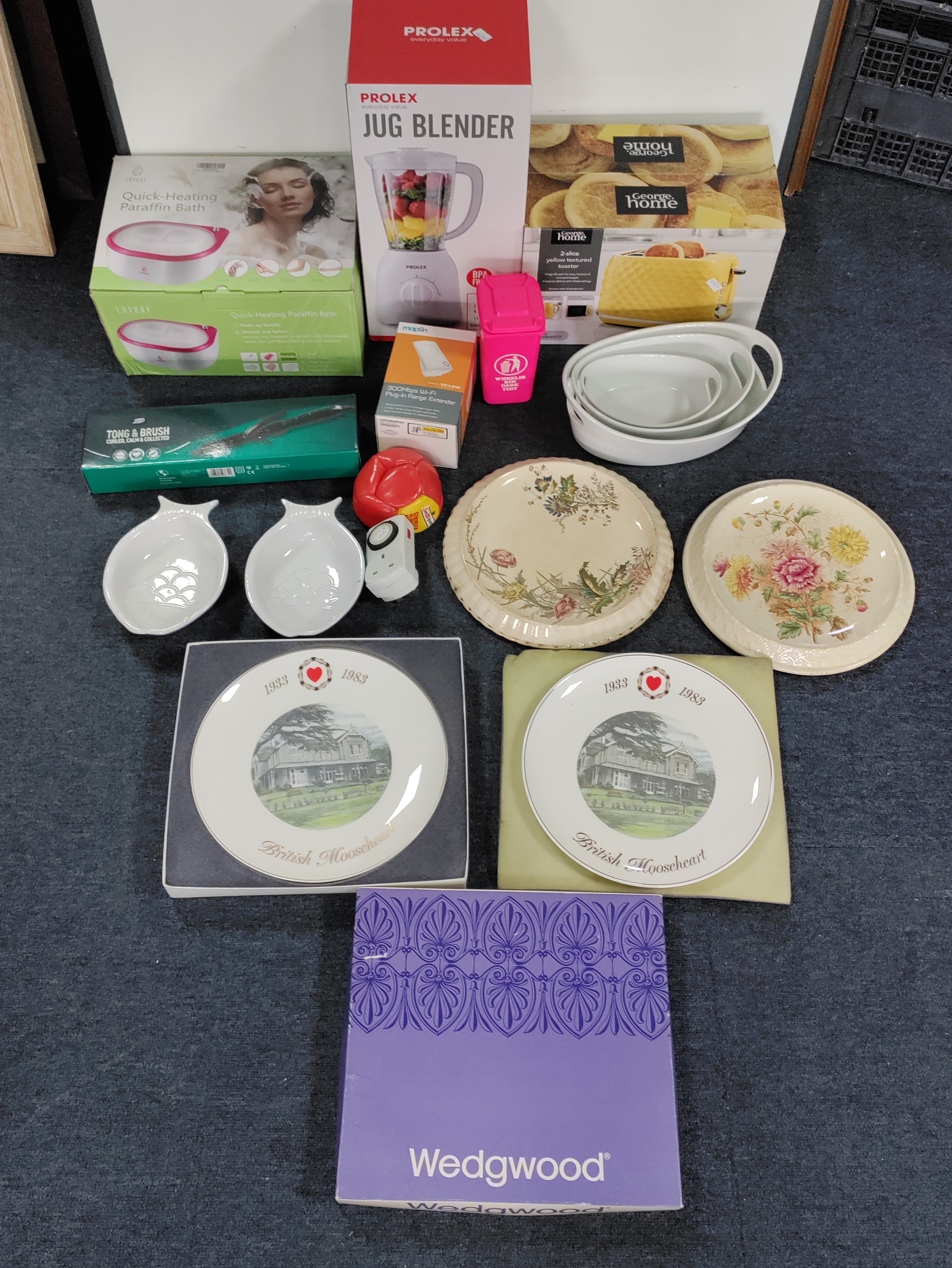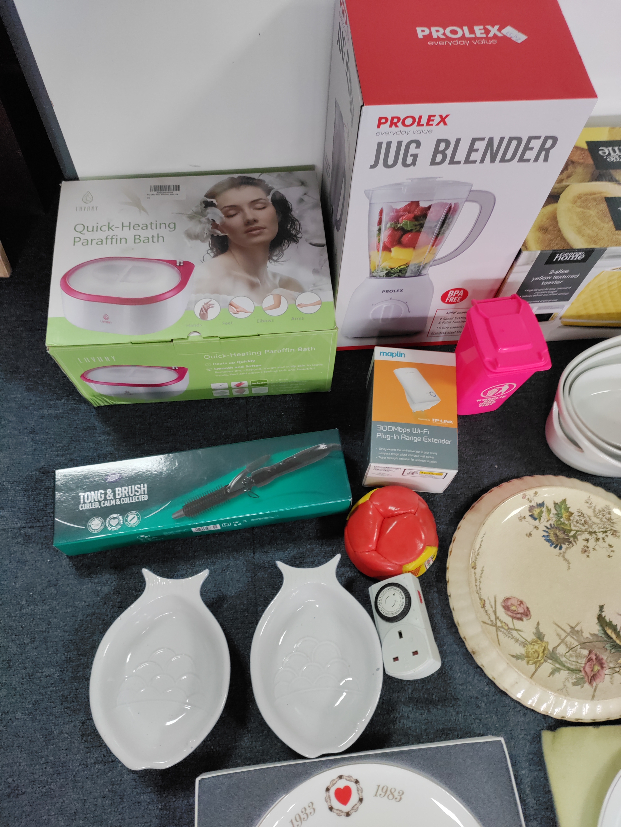 A job lot from a house clearance. To include; brand new jug blender, brand new toaster, boxed paraffin beauty bath, curling tongs, dishes, cake stands and more.
