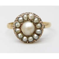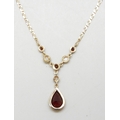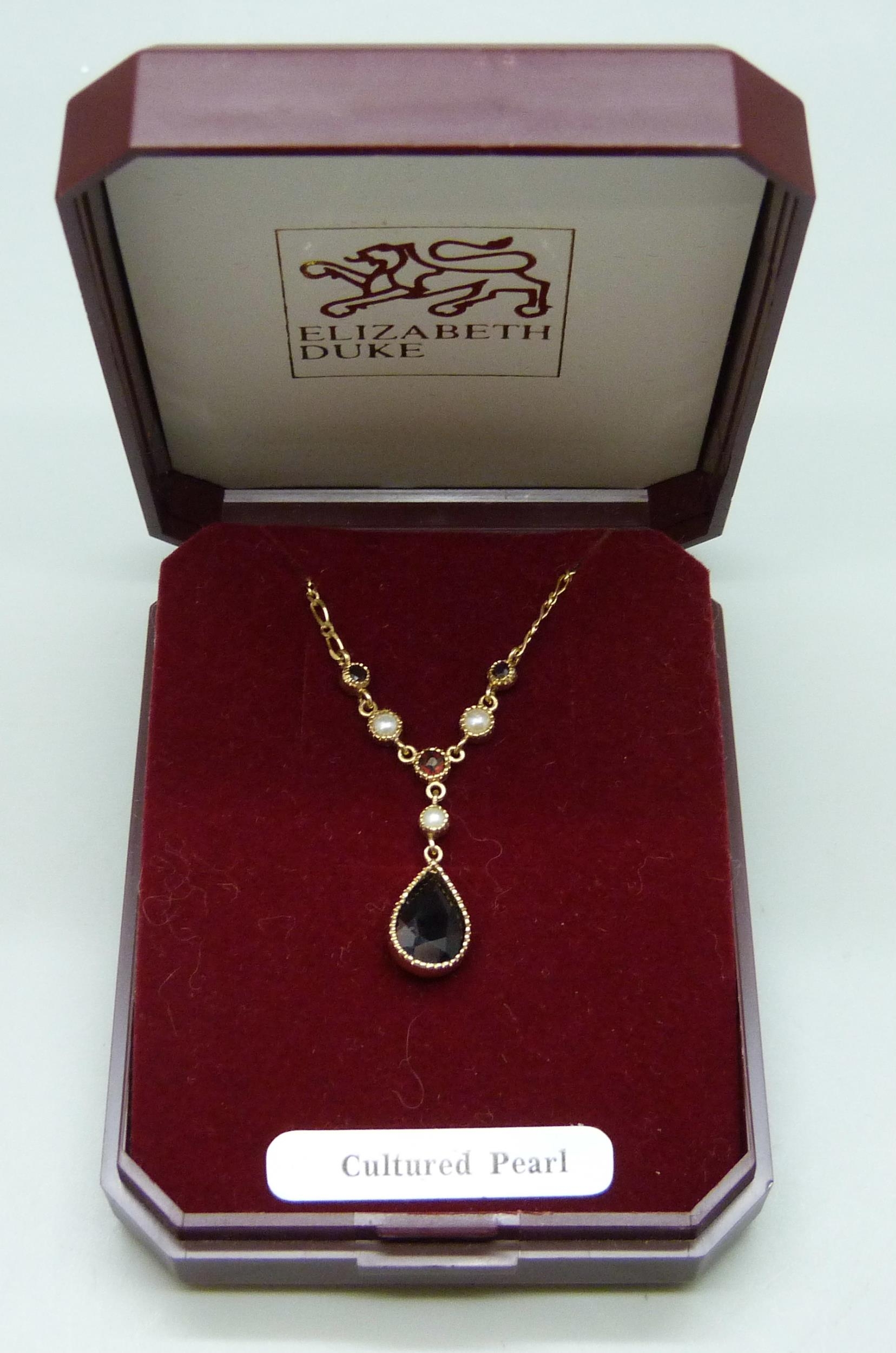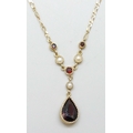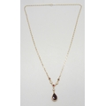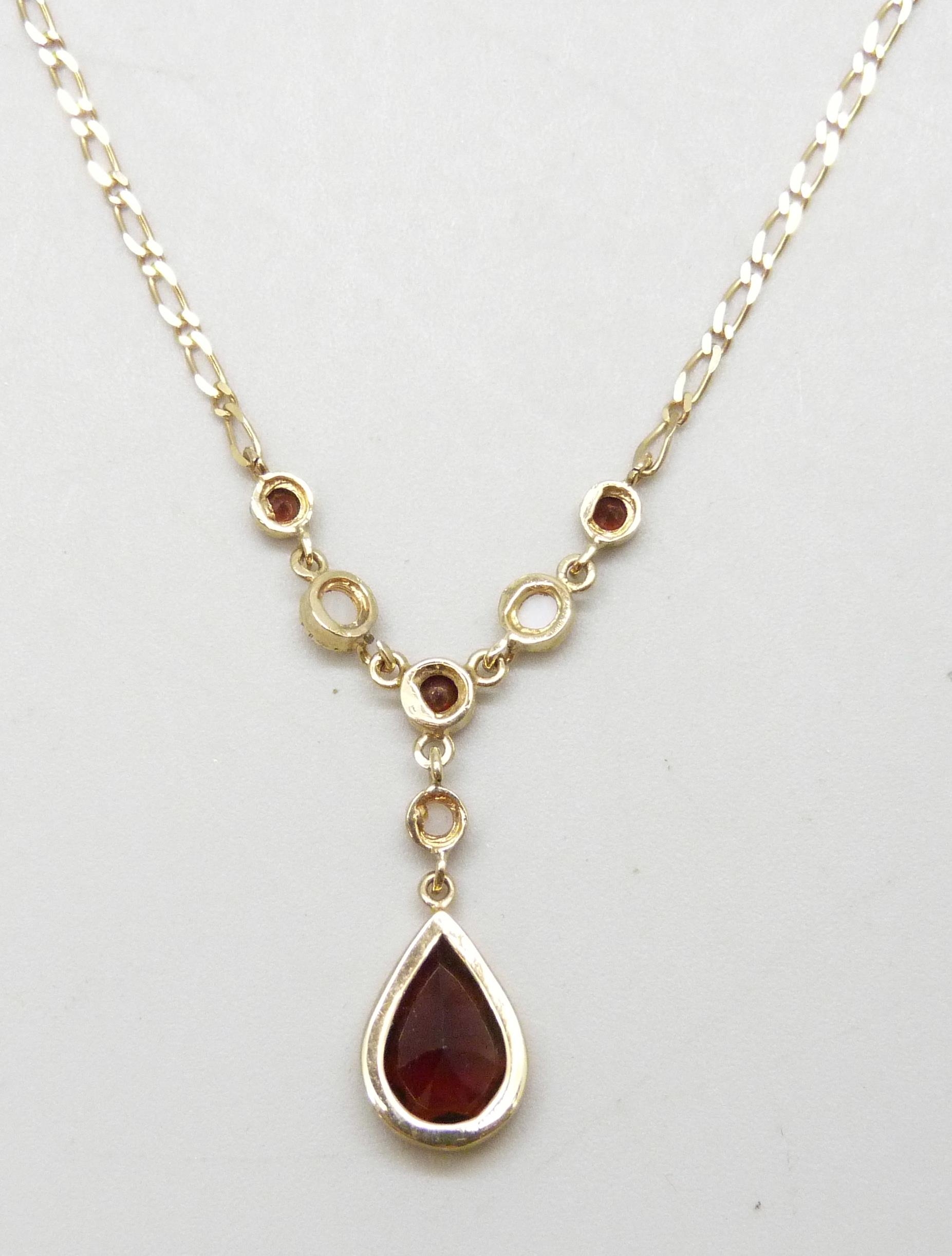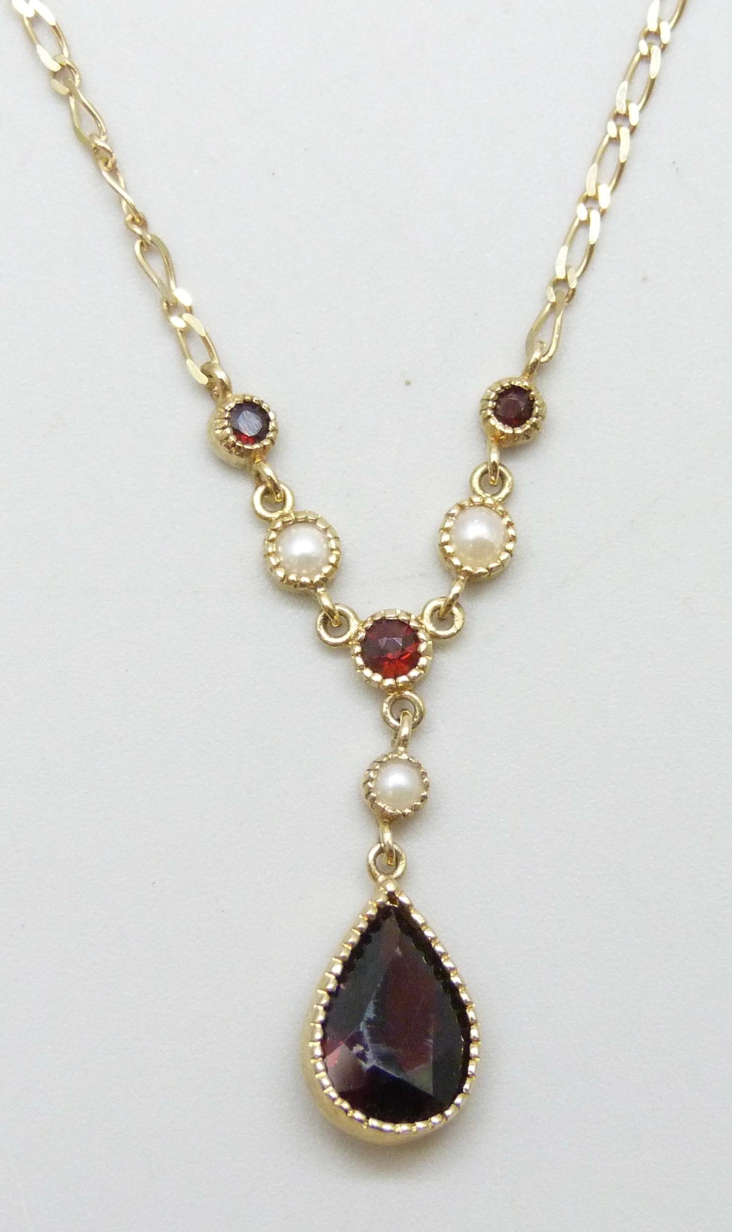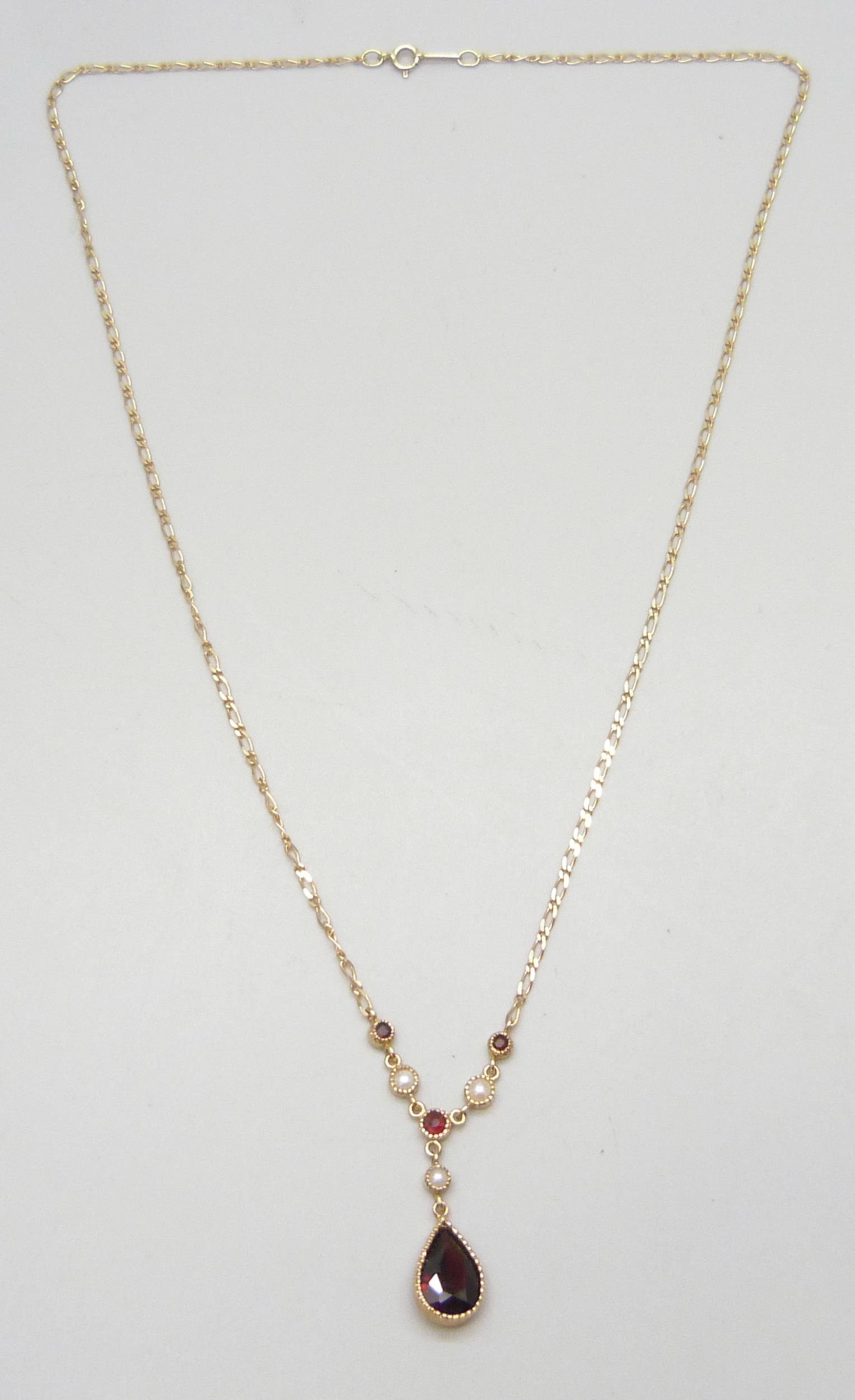 A 9ct gold necklace set with garnets and pearls, 2.8g, 43cm