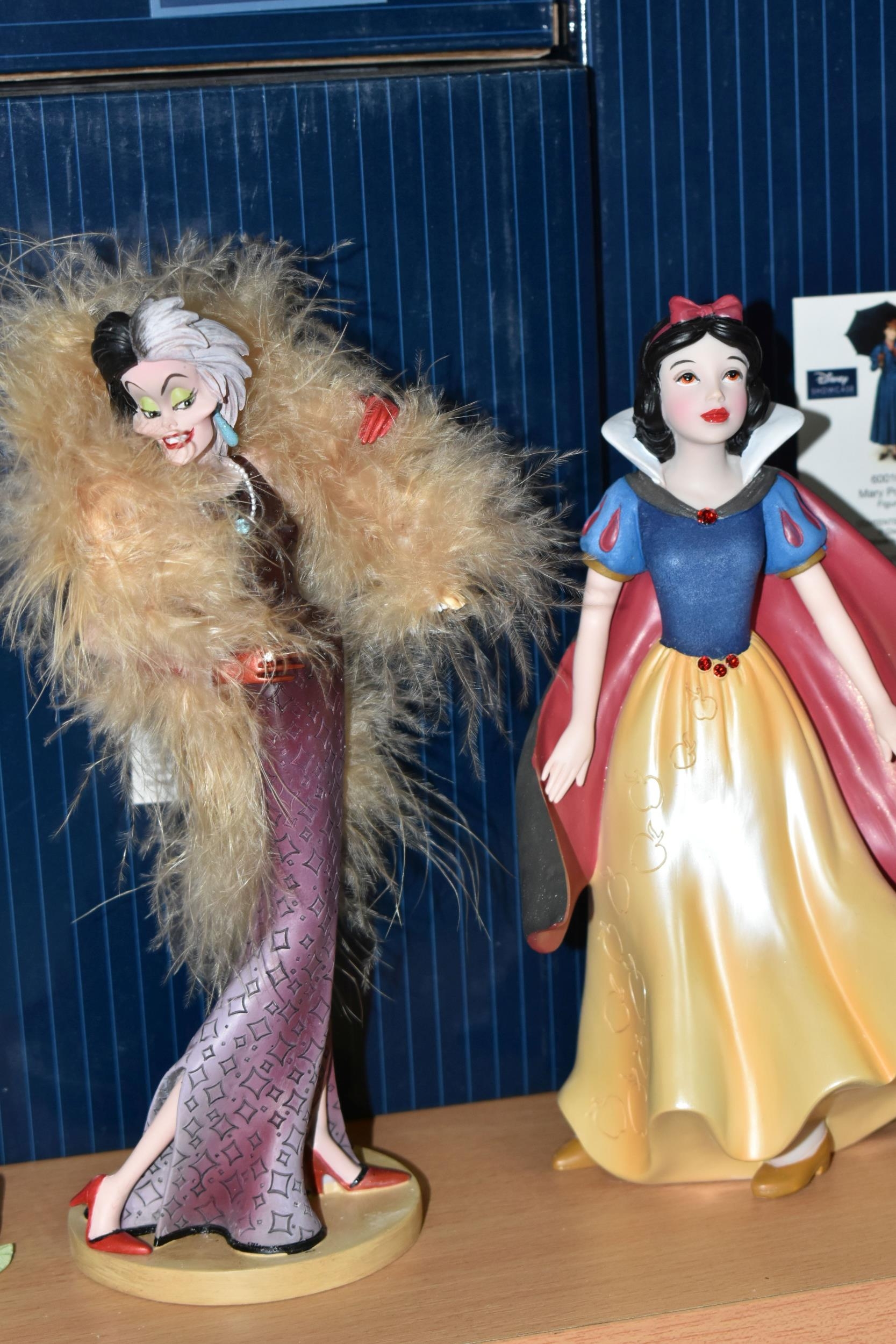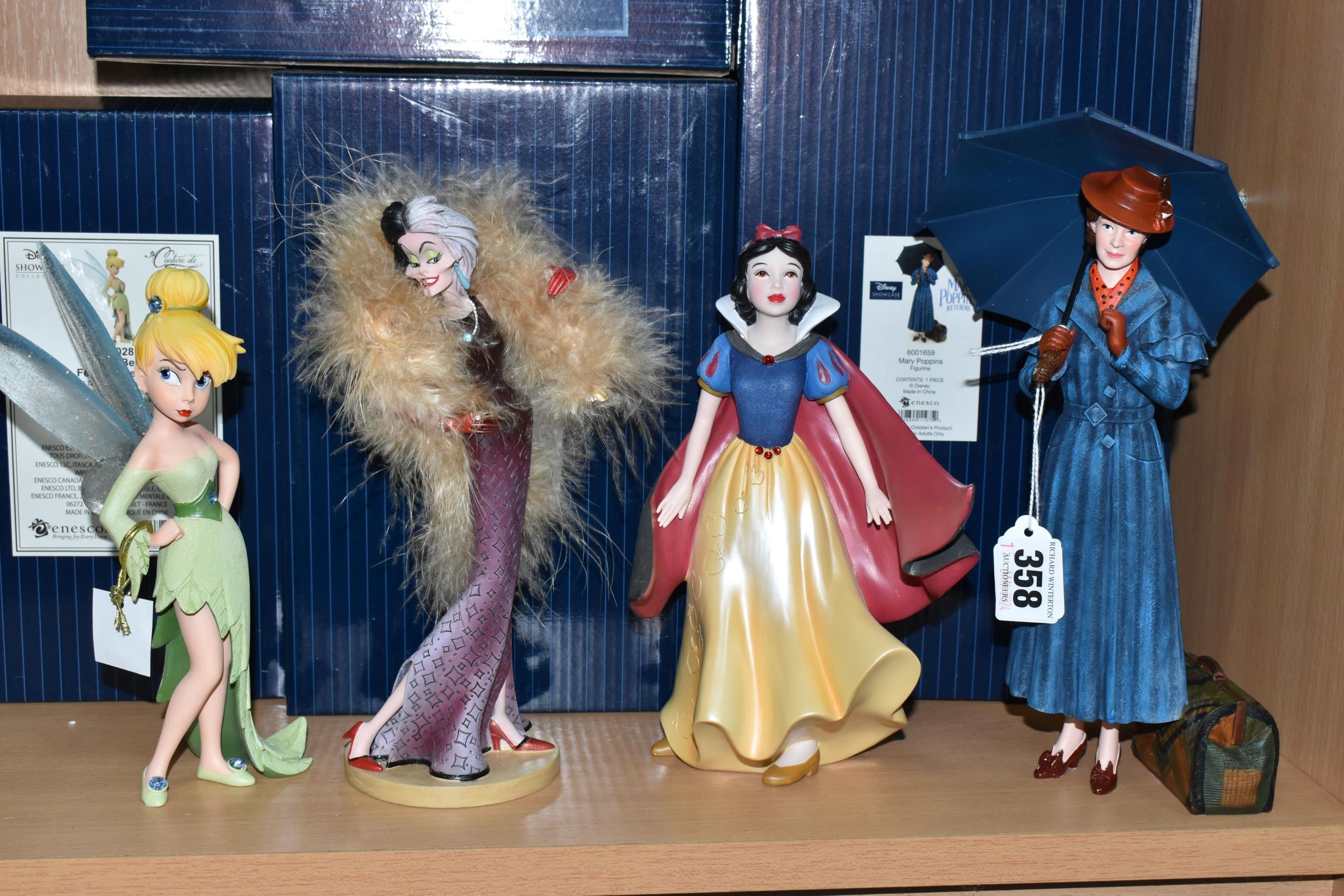 FOUR BOXED DISNEY SHOWCASE COLLECTION 'COUTURE DE FORCE' FIGURES, comprising 'Cruella' 6008693, 'Tinkerbell' 6009028, 'Snow White' 6007186, 'Mary Poppins' 6001659 (4 +boxes) (Condition Report: mint condition, boxes have slight scratches and scuffs)