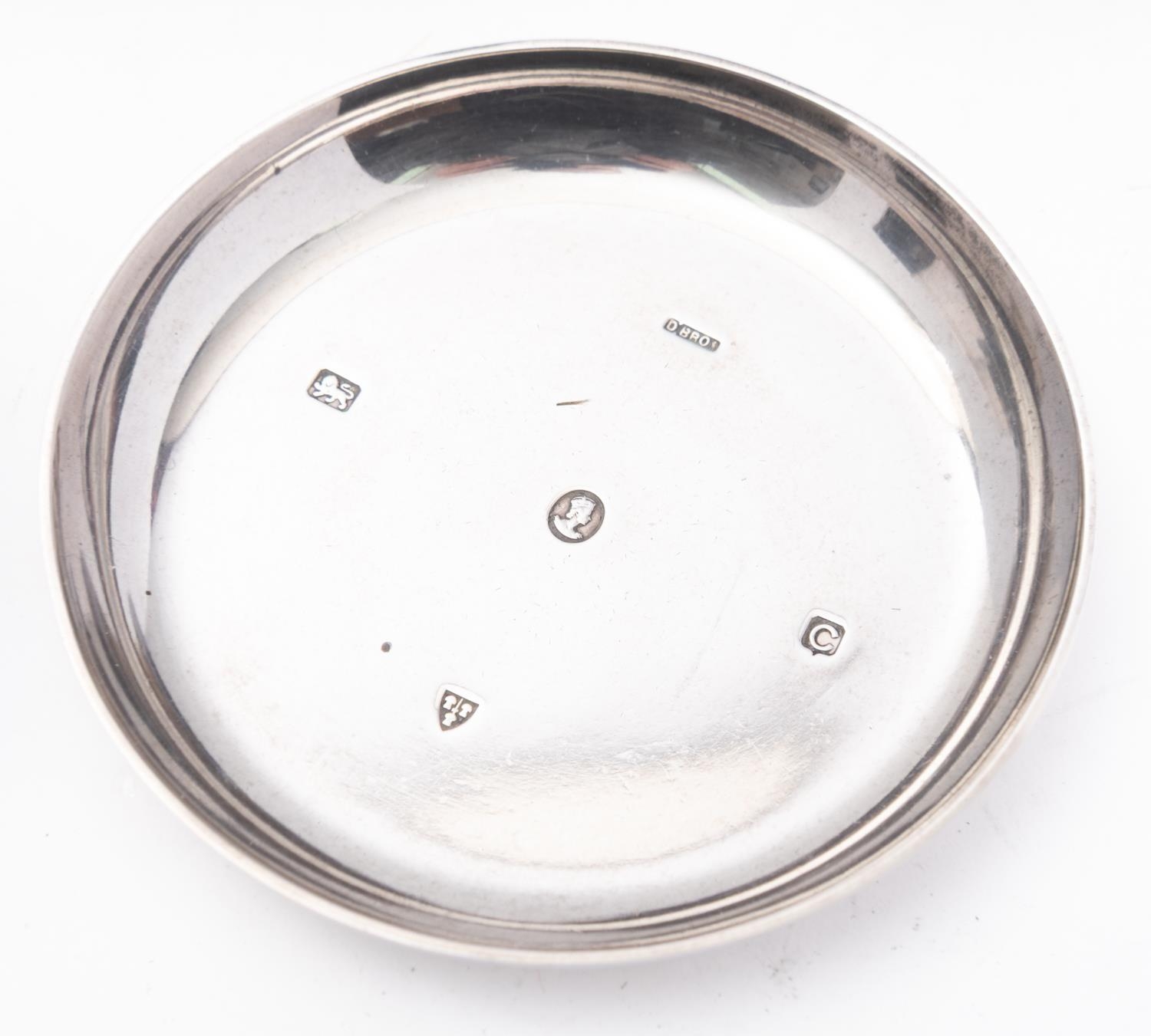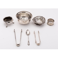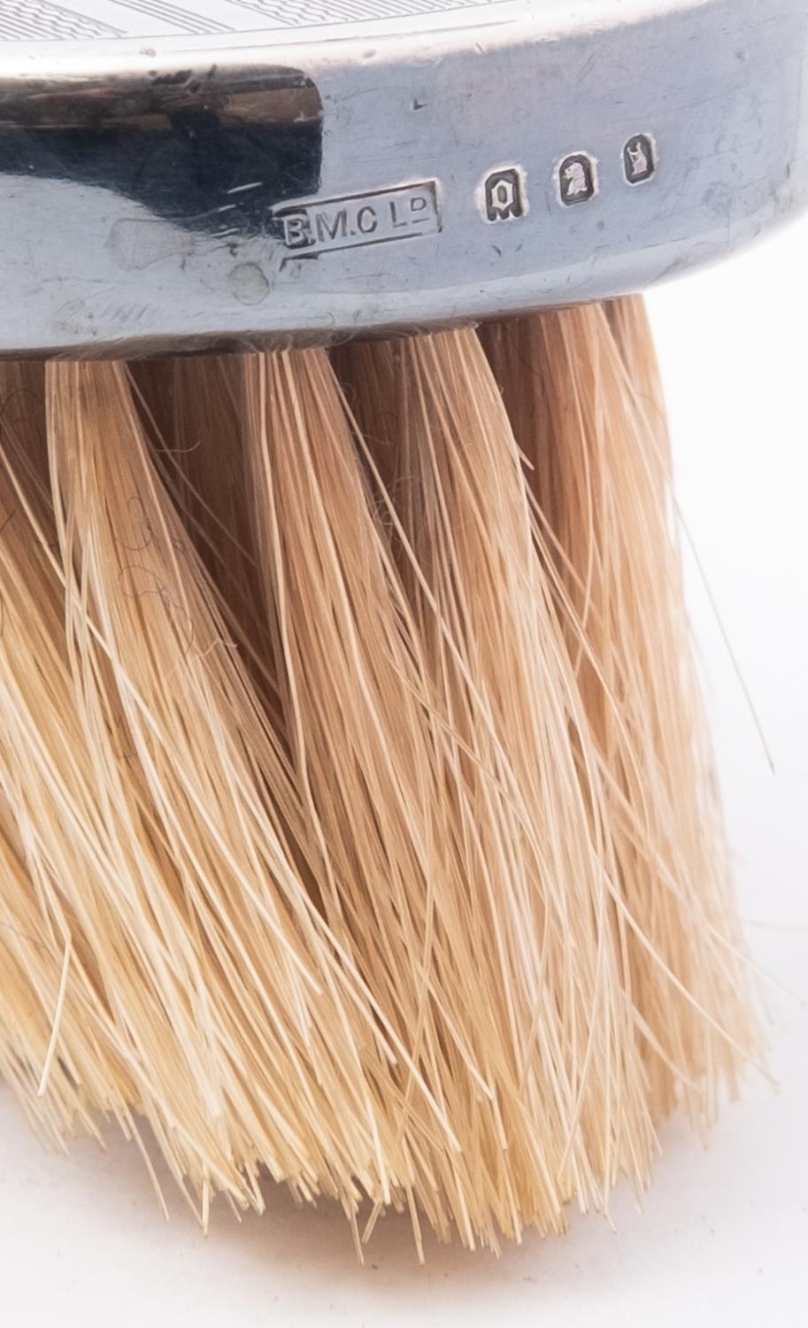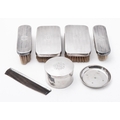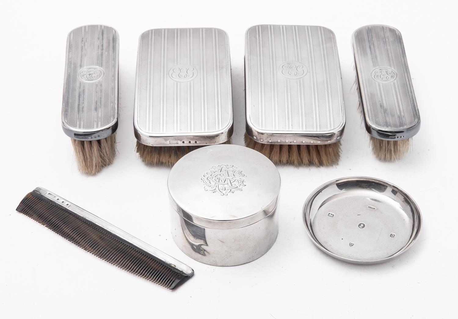 A mixed group of silver including; a circular box with engraved monogram by Thomas Hayes, Birmingham 1896 and an Elizabeth II ashtray, 197.5gms., (6.3ozs), gross with a pair of gentleman's hair brushes, clothes brushes and comb, loaded, by British Metallising Co Ltd , London, (7)