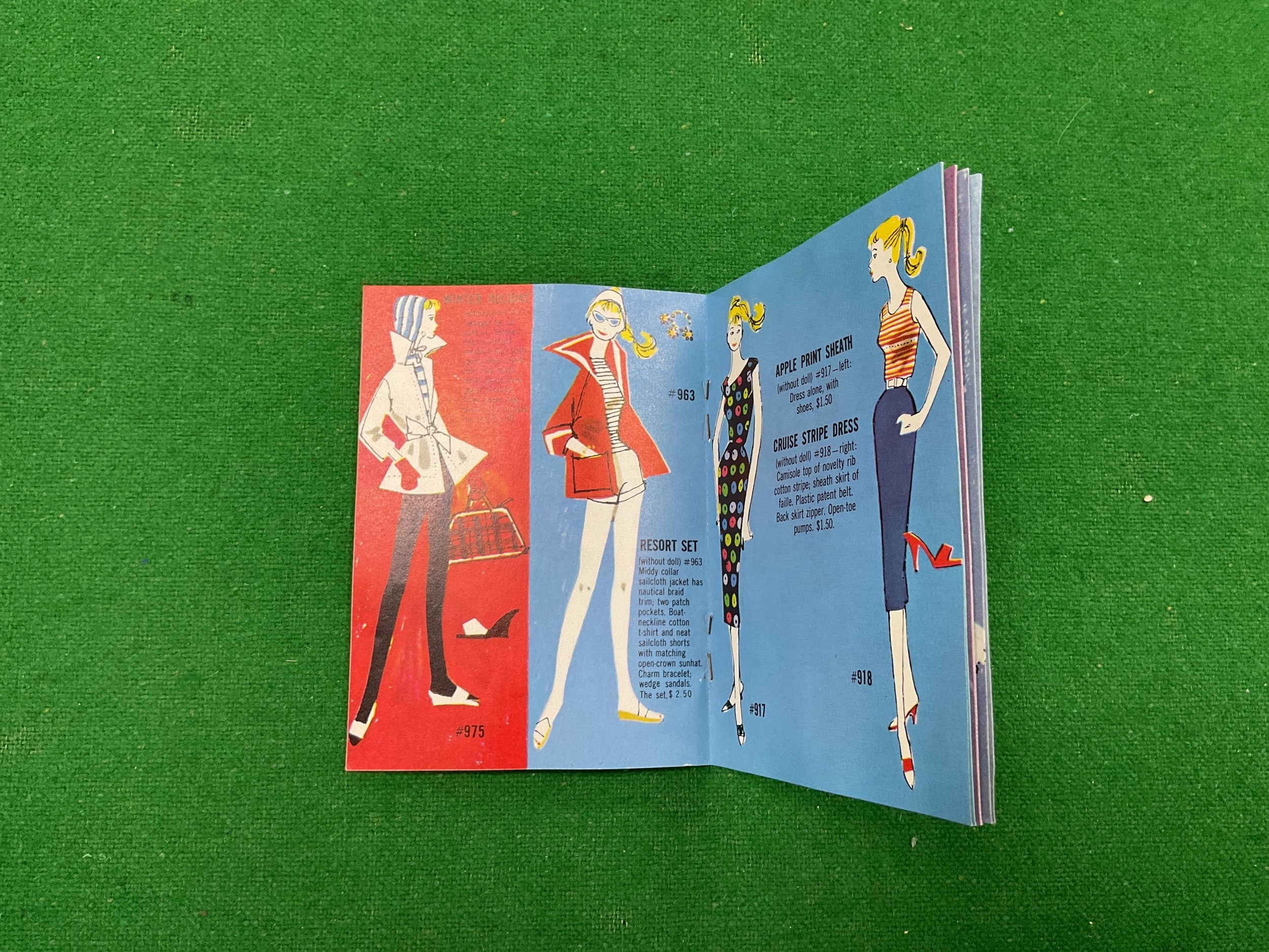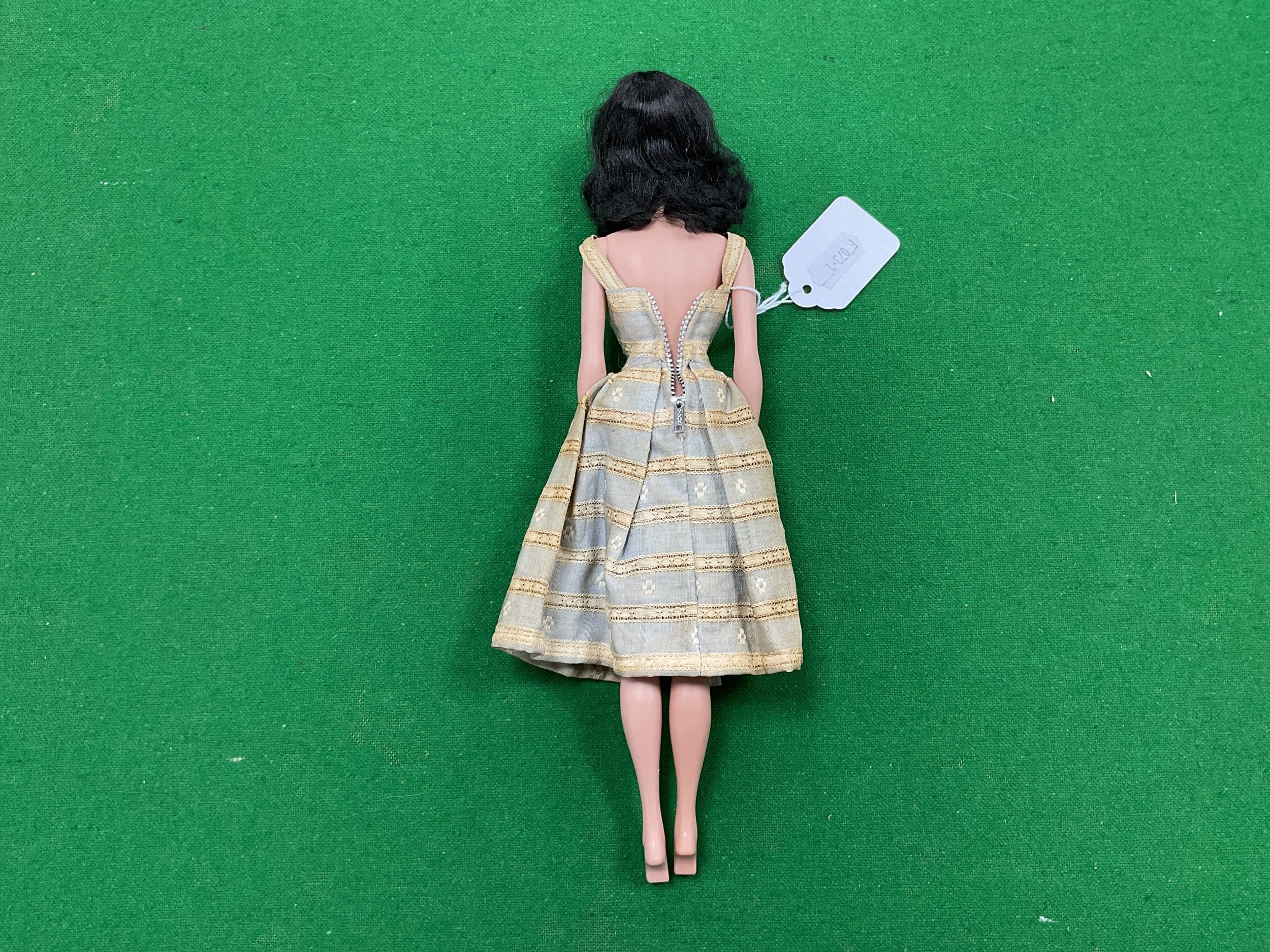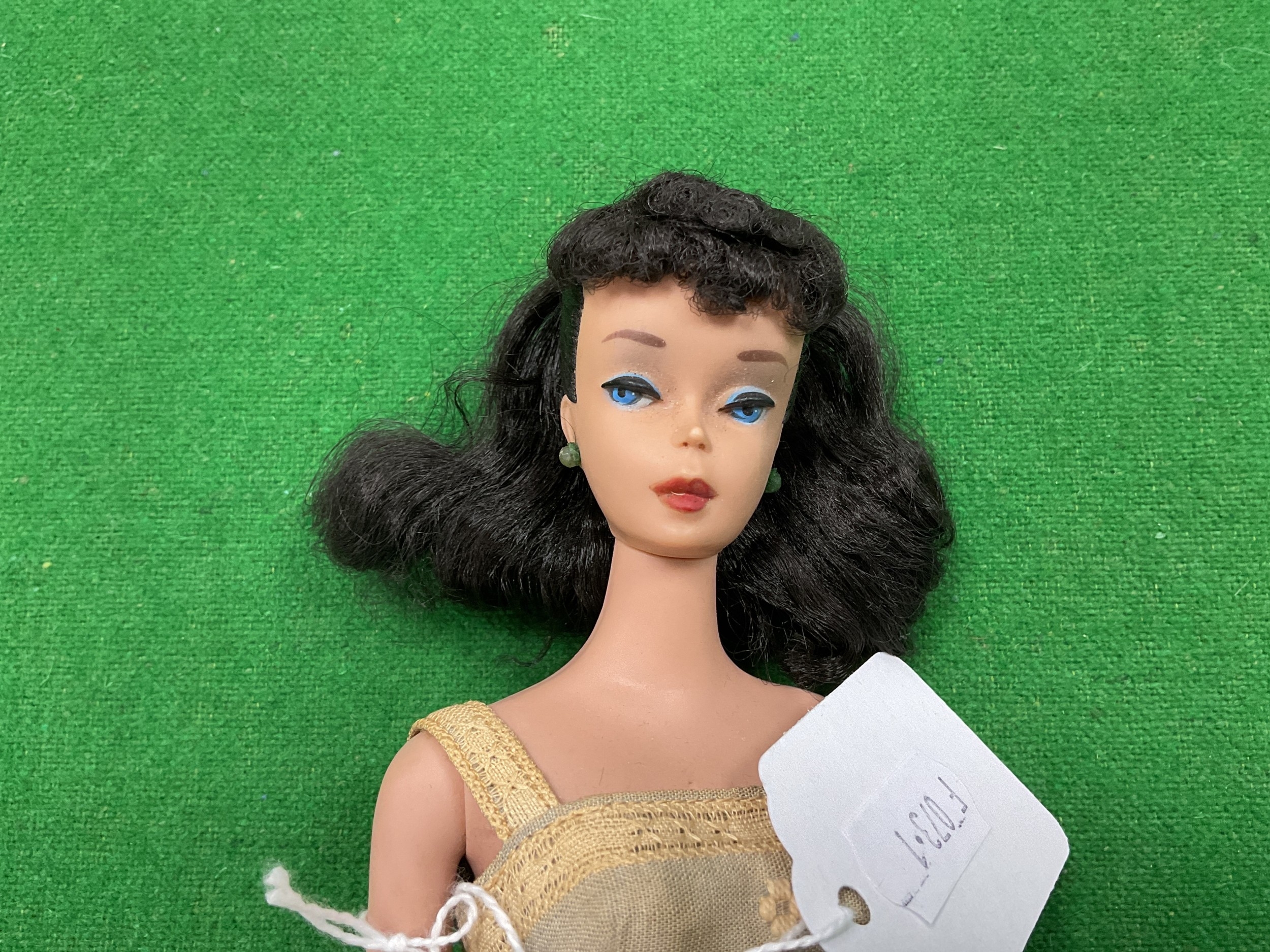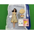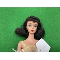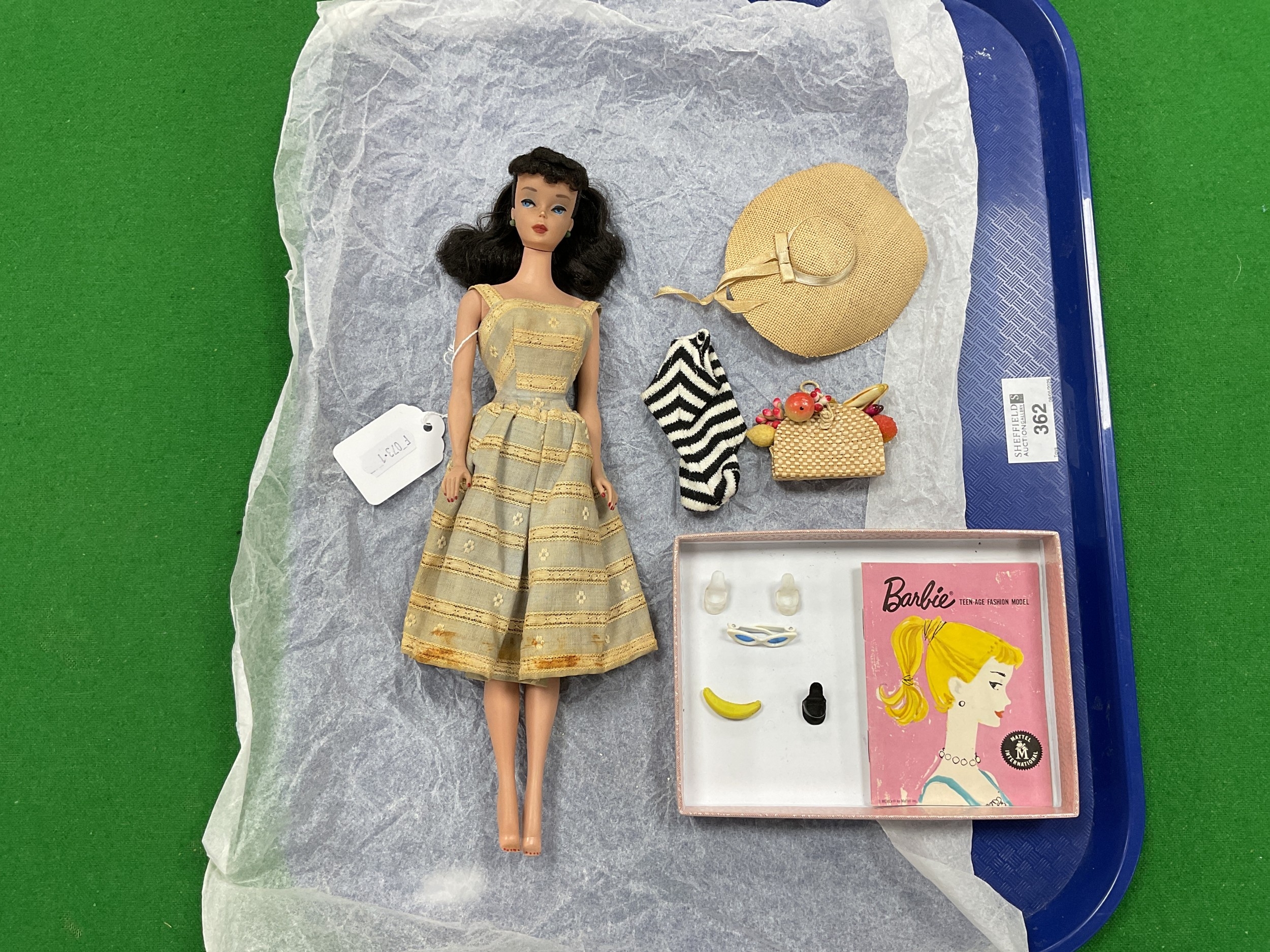 A Circa 1960 Ponytail Barbie Doll Model 850. Soft Floss Hair Brunette, Poodle Curls and Ponytail, Blue Eyes, Light Brown Eyebrows, Blue Eye Shadow, Red Lips, Red Nails. Marked Barbie™ Pats. Pend. ©MCMLVIII by Mattel. Clothed in a Knee Length Dress (Stained) and White Mules. Accessories comprise of a Summer Hat, Black & White Zebra-Striped Swimsuit, A Single Black Mule (open-toe shoe), Earrings, Hand Bag with Fruit (One Banana Detached), White Sunglasses, Barbie Fashion Booklet, unboxed.