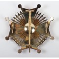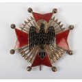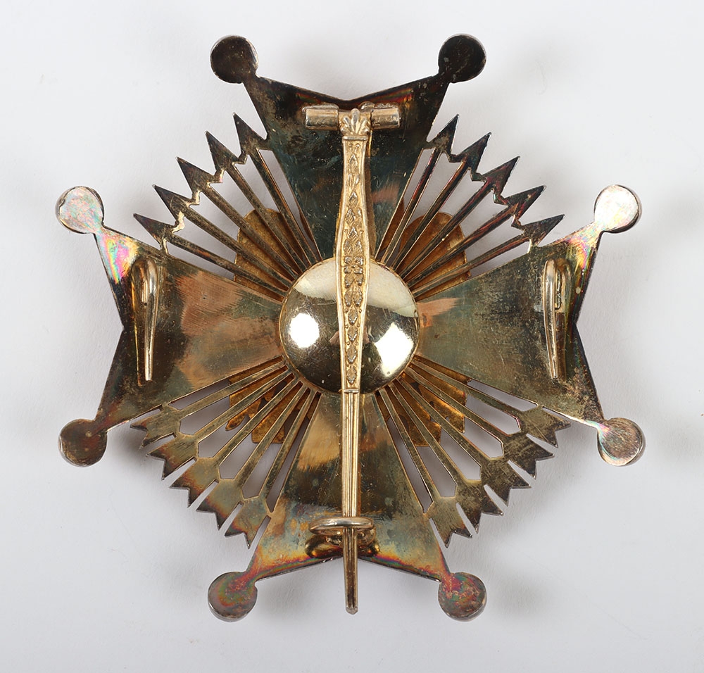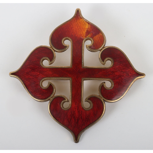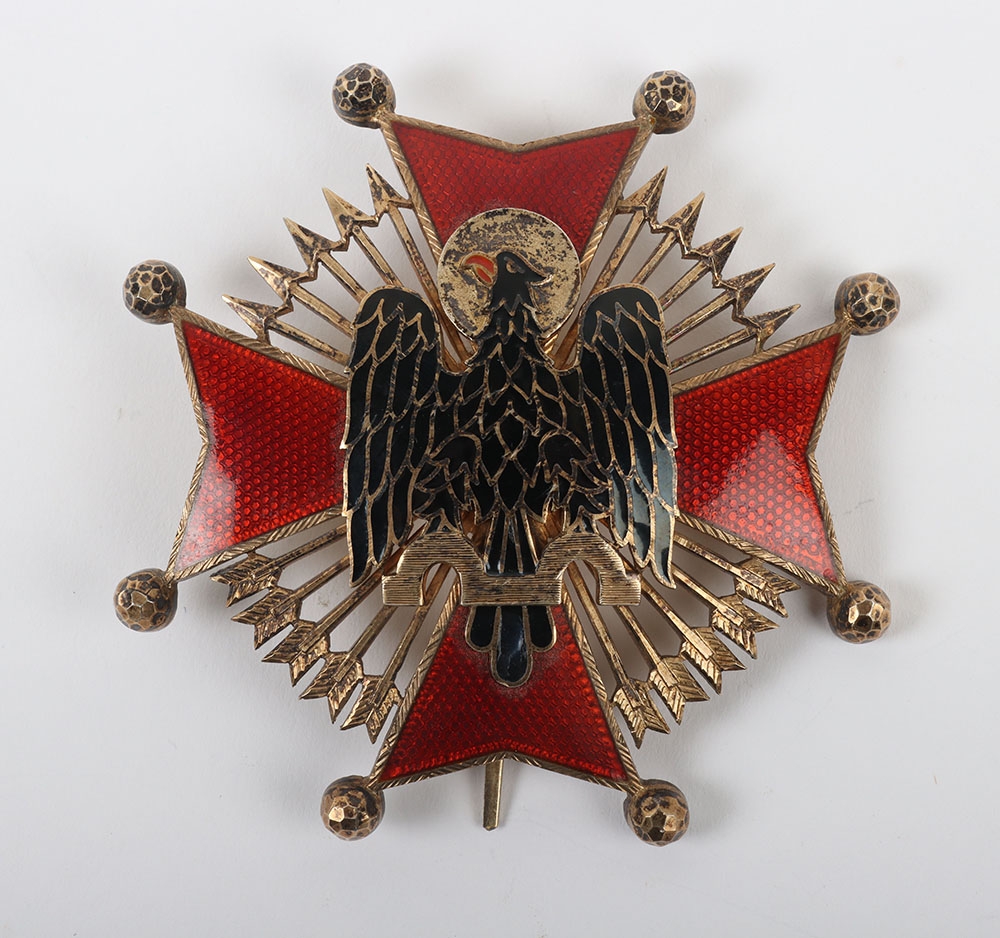 Spain - Franco Period Order of Cisneros Breast Star, fine example of a gilt breast star with central red enamel cross, laid upon black enamel eagle and arrows to the interior of the arms of the cross. Reverse with the original pin fitting and two hooks.