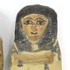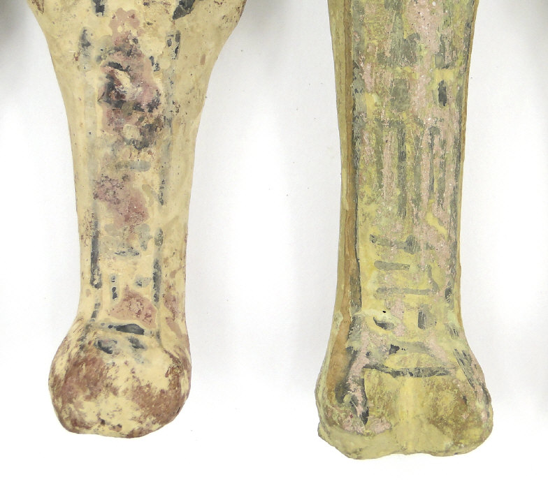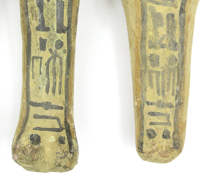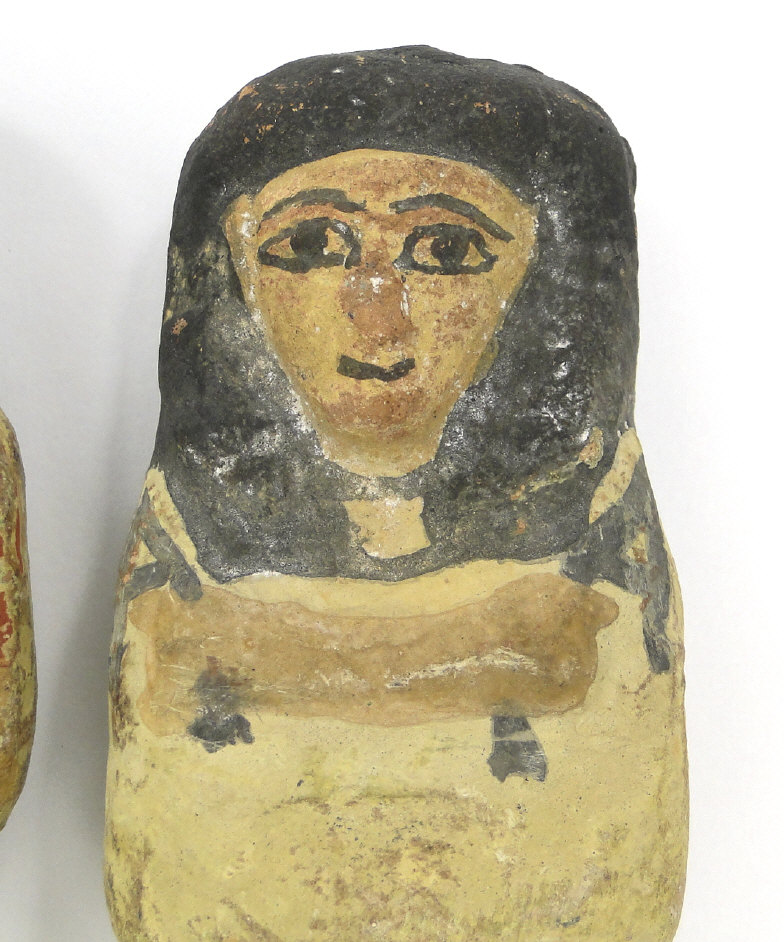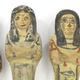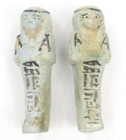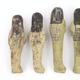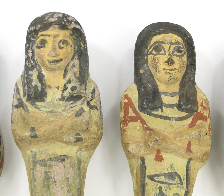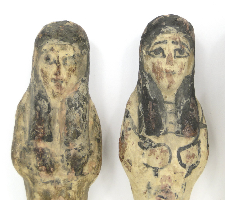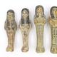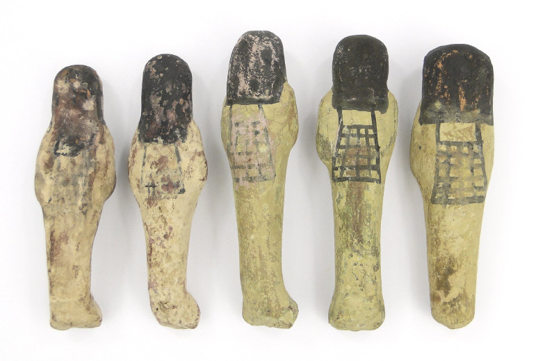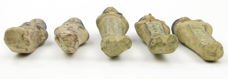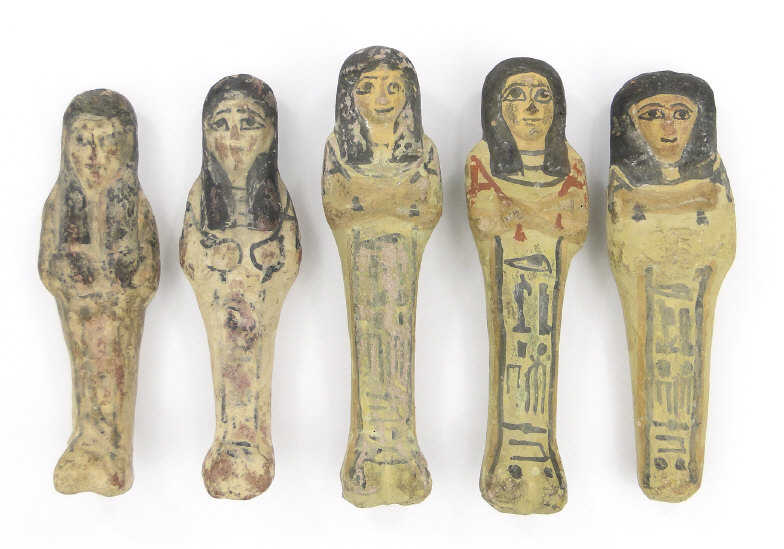 Five 19th/20th Dynasty Egyptian terracotta/stone Ushabti, with inscribed black inscription and remnants of painted decoration, the largest 17cm high