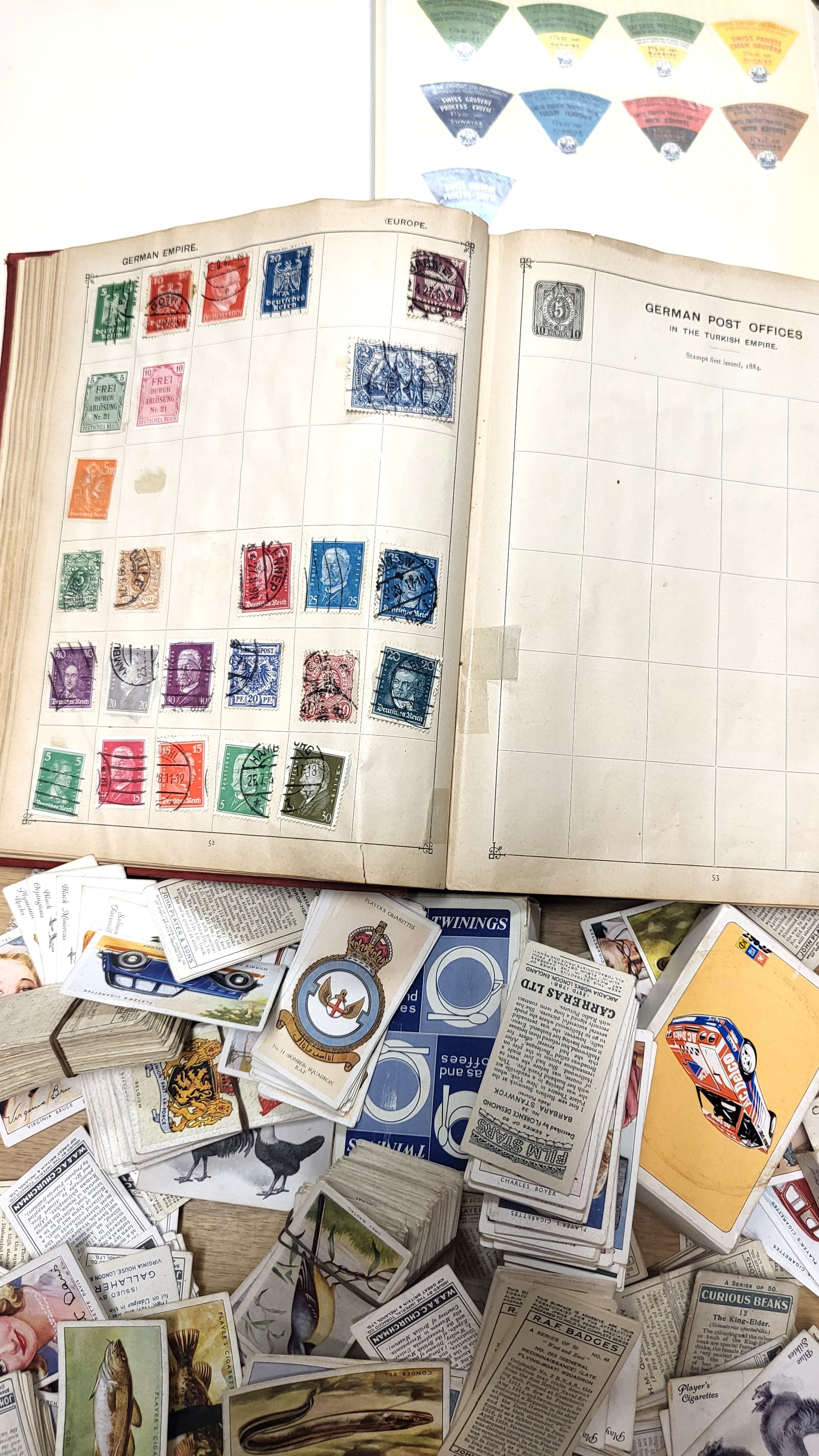 The Strand Stamp Album 9th Edition including stamps including Great Britain, Austria, Hungary, Belgium, France, German States, German Empire, Holland, Italy, Russia, Finland, Poland, Servia, Sweden, Switzerland, Turkey, Czecho-Slovakia, Ceylon, Siam, India, Japan, USA, and New Zealand, and an album of cheese labels, a selection of cigarette cards including Film Stars, Animals of the Countryside, Treasure Trove, Kings and Queens of England, RAF Badges, Flowers, and Garden Hints, and a pack of Twinings playing cards.
