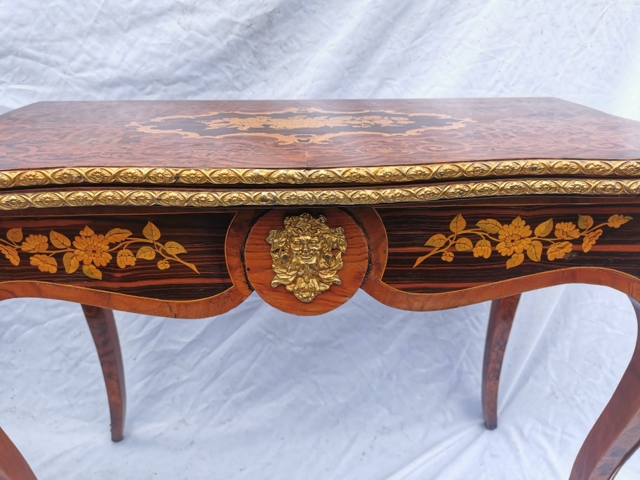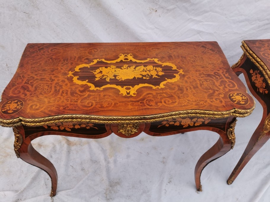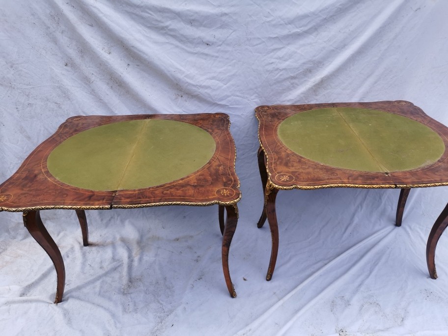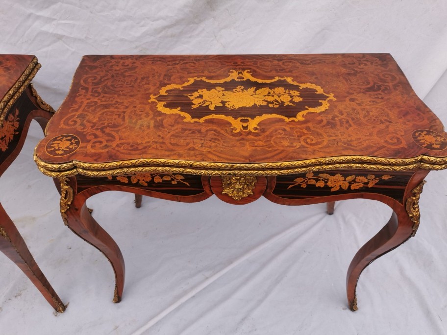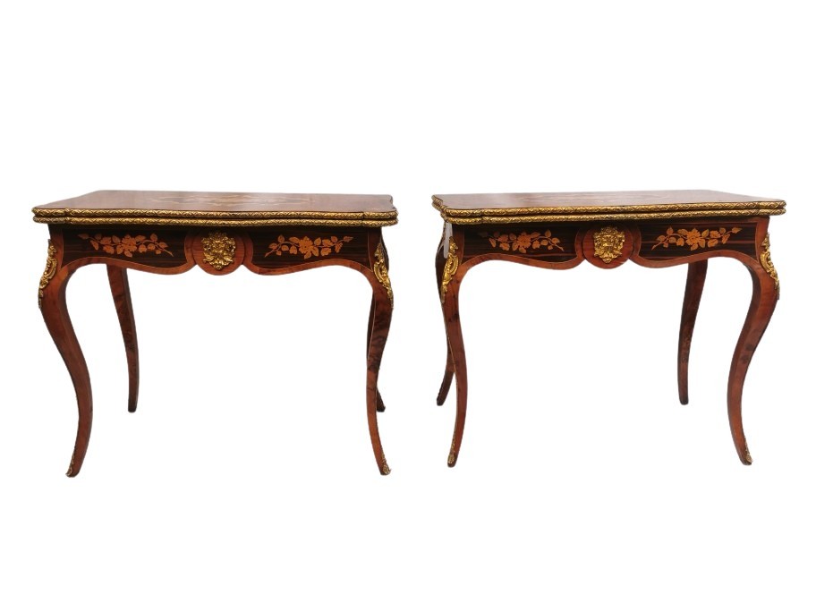 A pair of 20th century walnut and marquetry card tables, the folded tops with eared corners mounted with a cast brass banding, above a frieze apron with central ormolu mask either side, on cabriole legs with ormolu mount and sabot, 74 cm high x 92 cm wide x 92 cm deep; 46 cm deep (when shut)