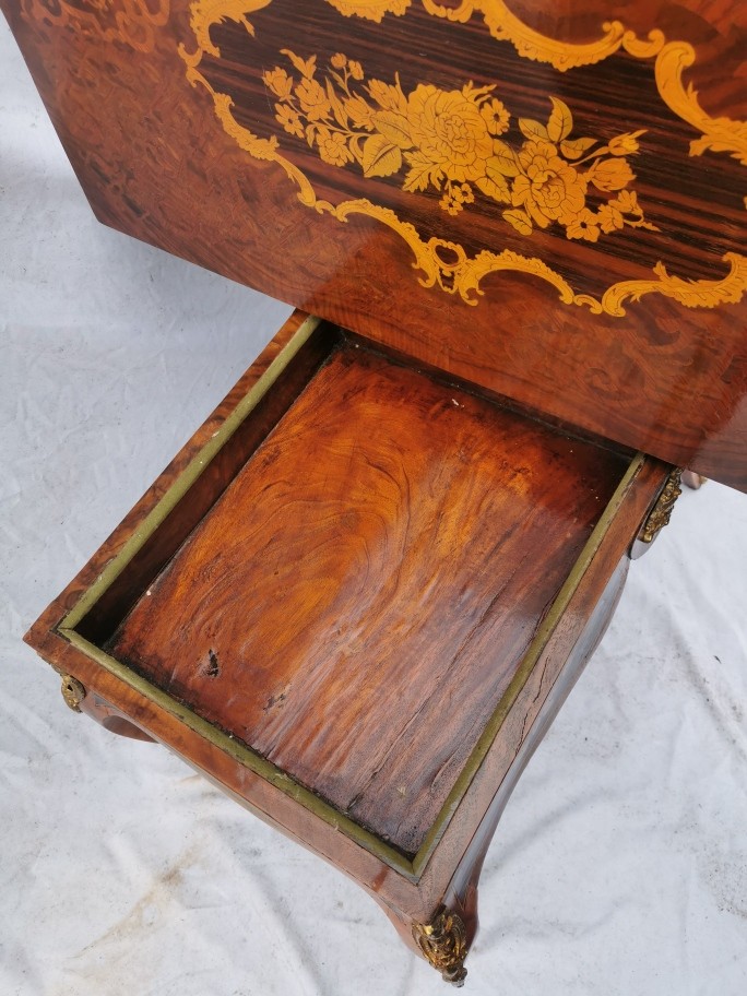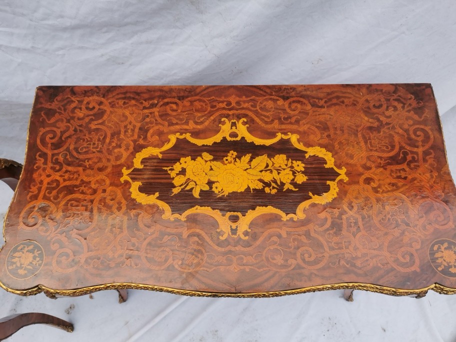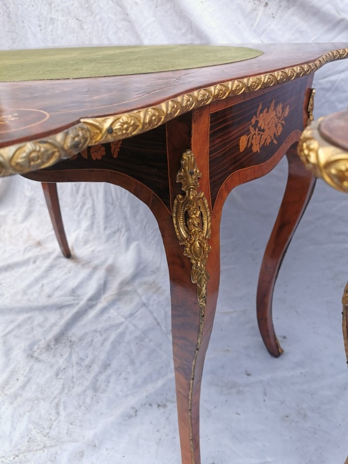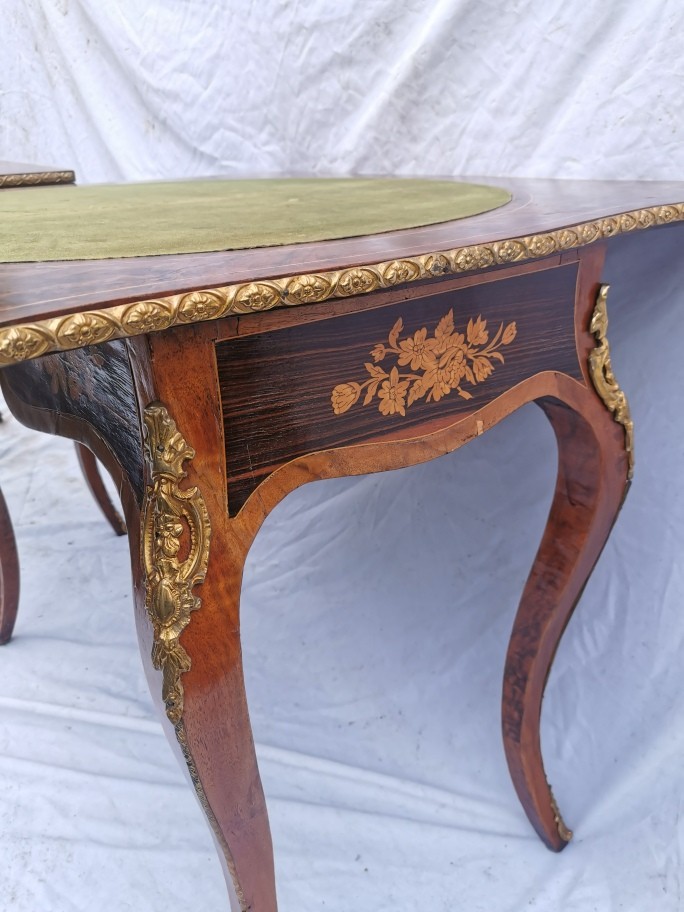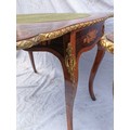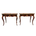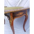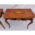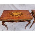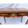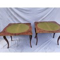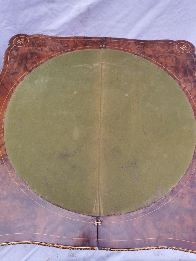 A pair of 20th century walnut and marquetry card tables, the folded tops with eared corners mounted with a cast brass banding, above a frieze apron with central ormolu mask either side, on cabriole legs with ormolu mount and sabot, 74 cm high x 92 cm wide x 92 cm deep; 46 cm deep (when shut)