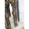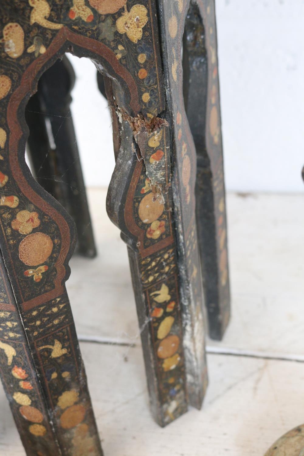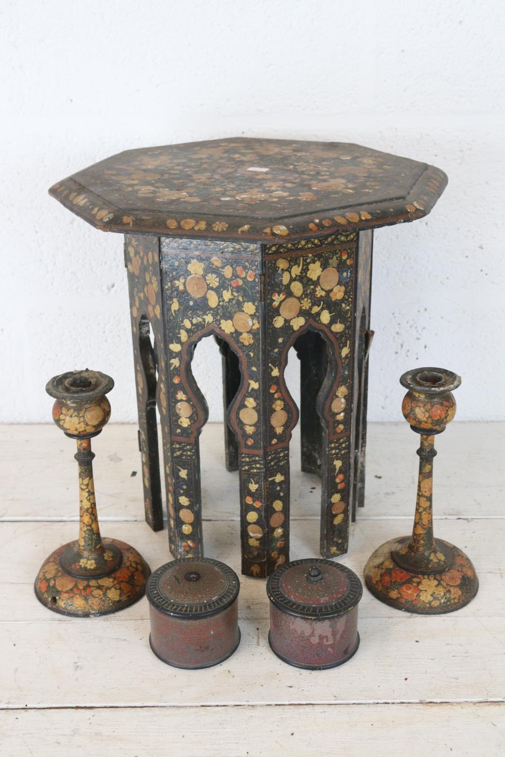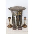 A highly decorated Eastern side table with a pair of candlesticks and pair of papermache boxes.