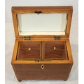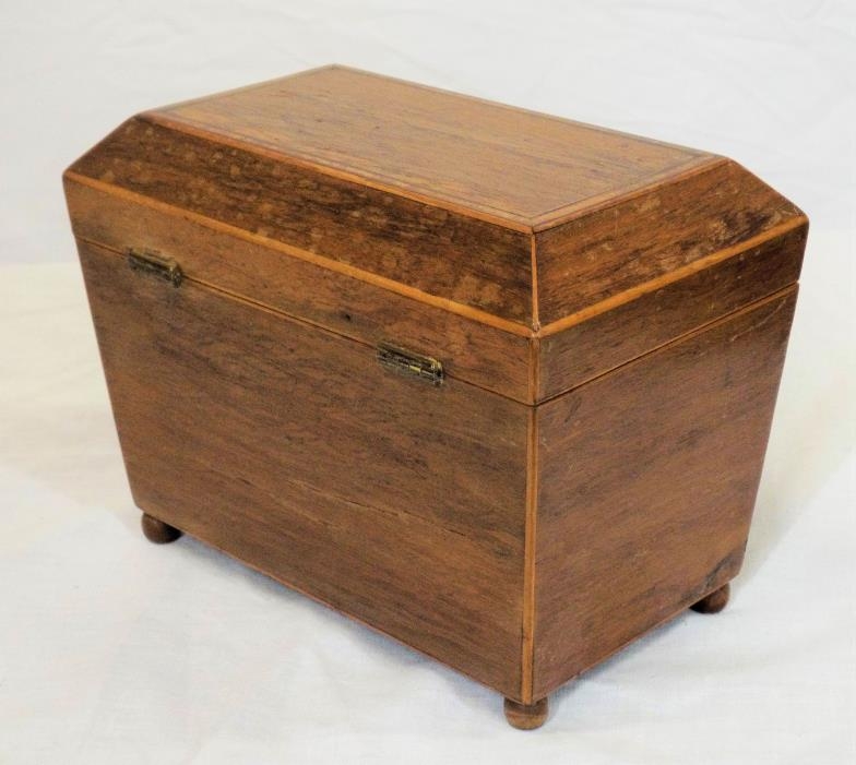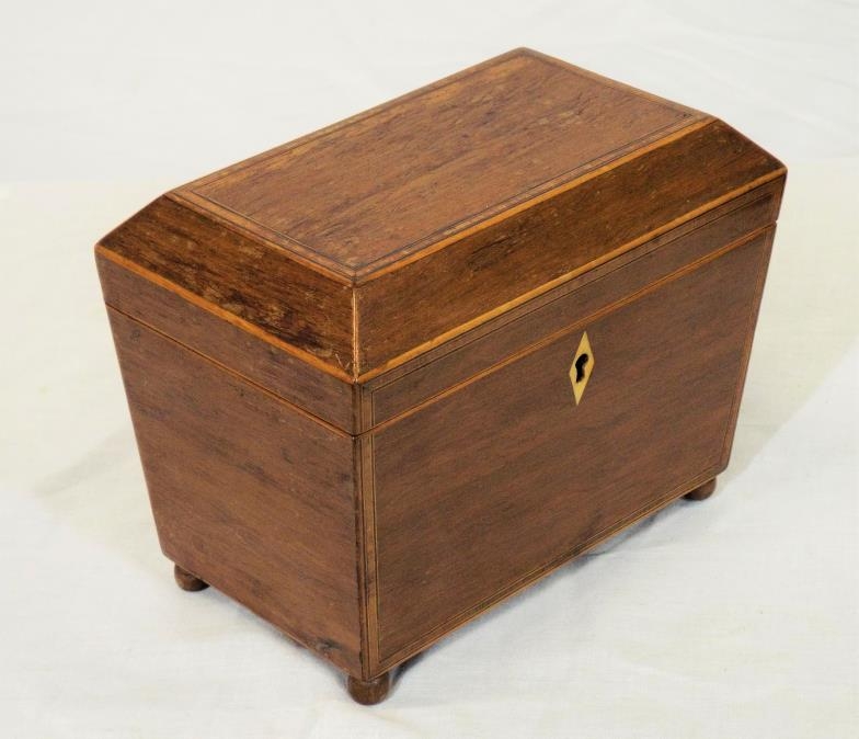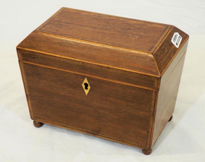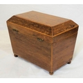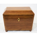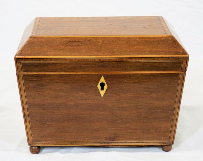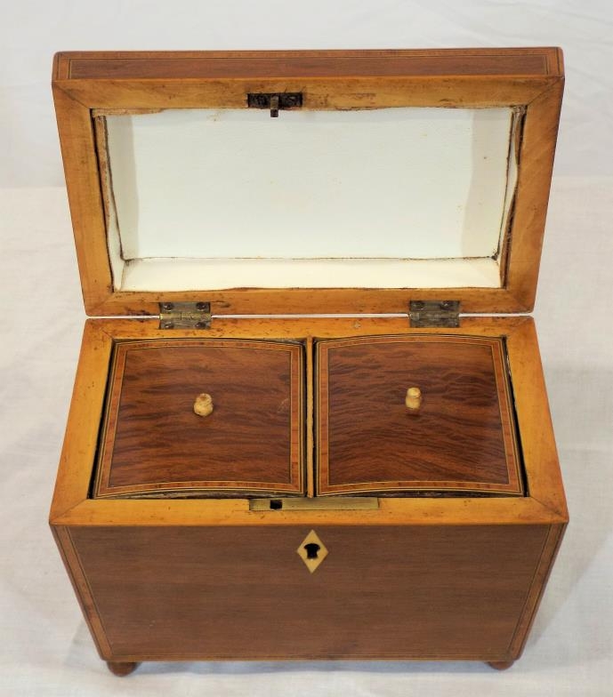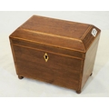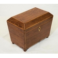 Edwardian inlaid and crossbanded mahogany tea caddy with sarcophagus shaped top, lined interior with inlaid tops, on bun feet