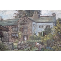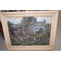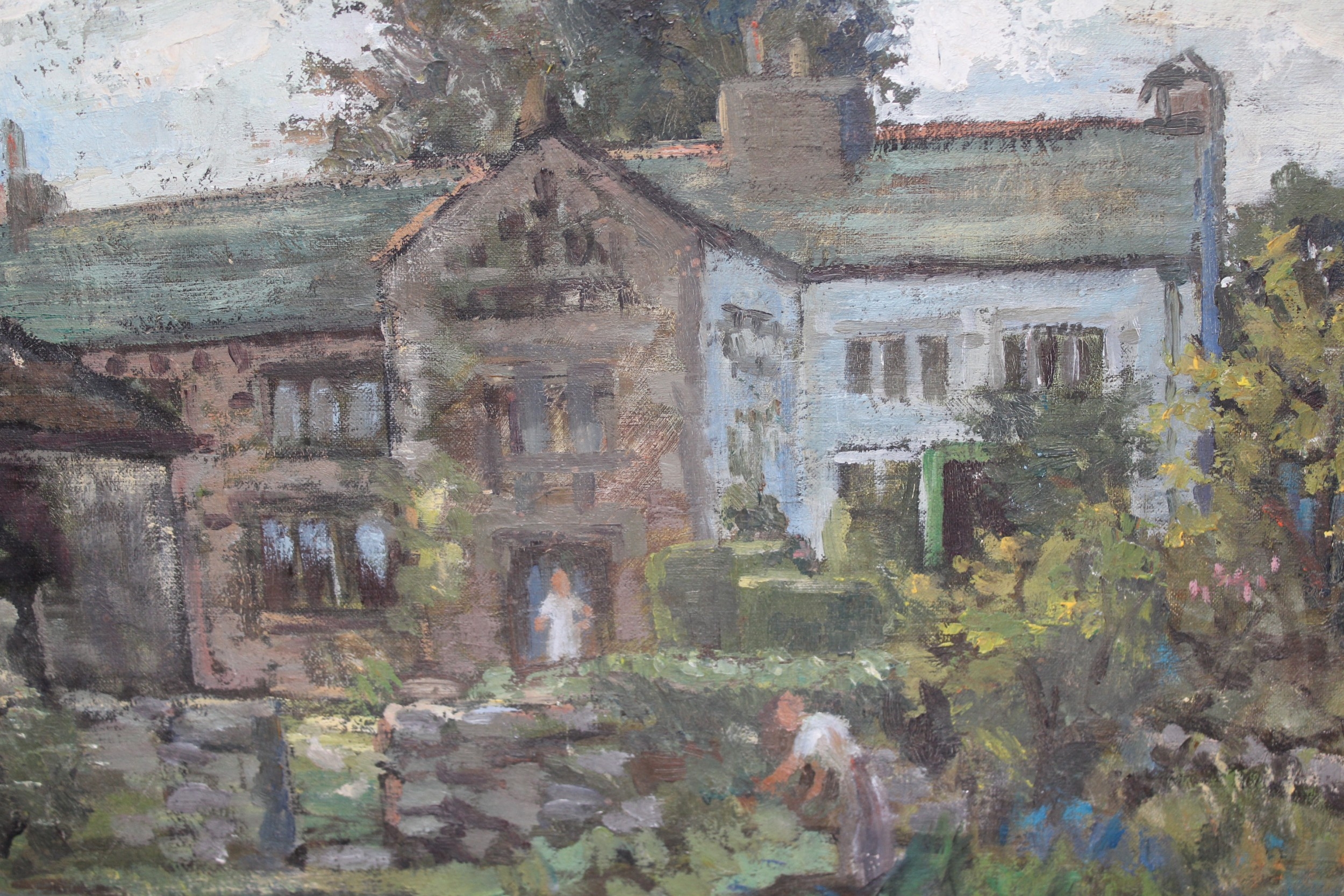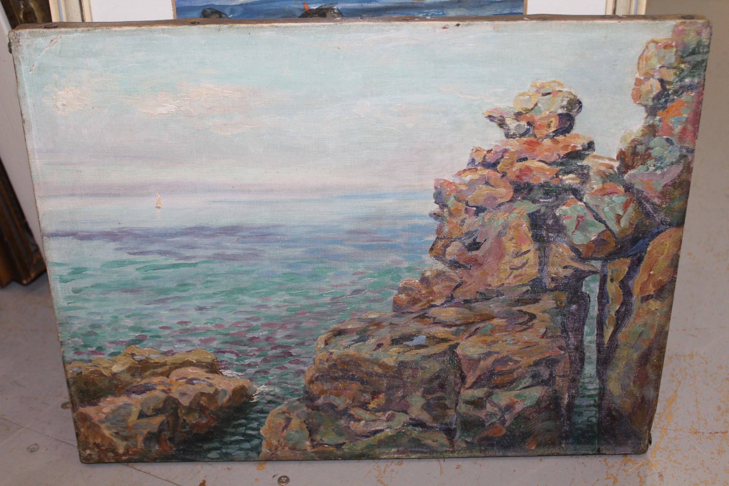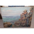 Pair of oils on canvas, figure in a manor house garden and study of a rocky Cornish coastal scene (the latter unframed). 30 x 41cm each