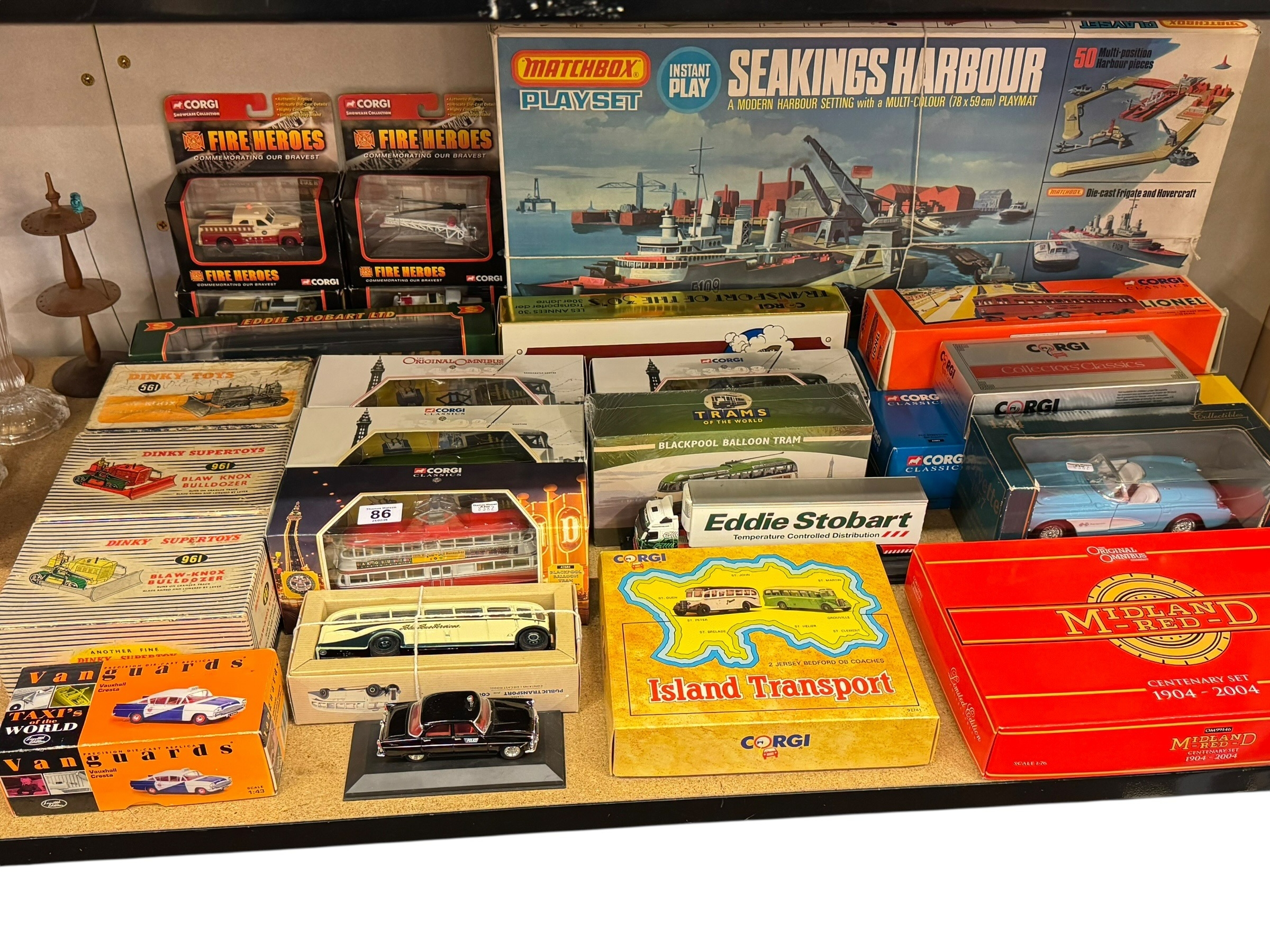 Matchbox playset, Seakings Harbour, collection of model vehicles including Corgi Blackpool Trams, three Dinky Bulldozers 961 x 2 and 561, etc.