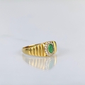 A late 20th century emerald and diamond ring, the central oval cut emerald within surround of round cut diamonds, leading to yellow metal ridged band tapering to plain polished shank, marked indistinctly to interior, ring size T, 2.6gms